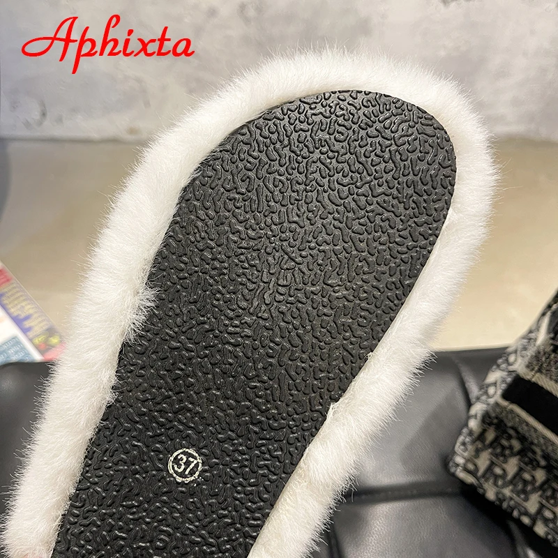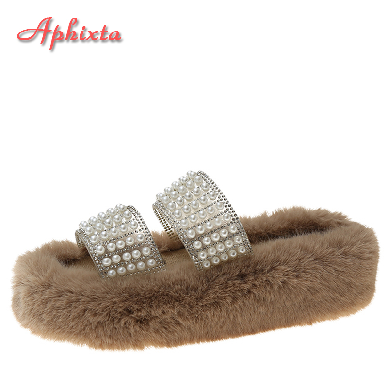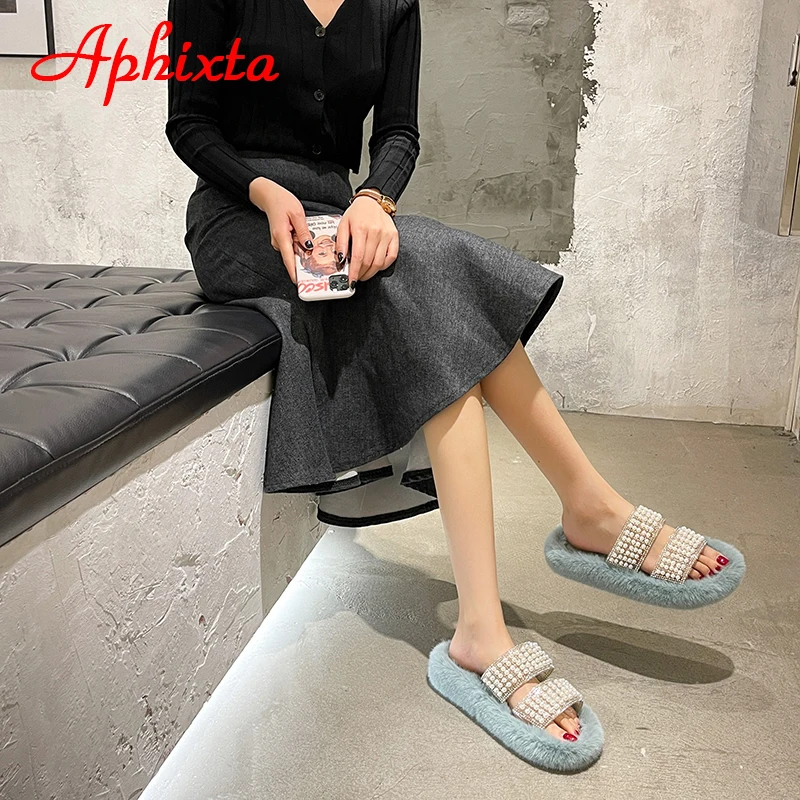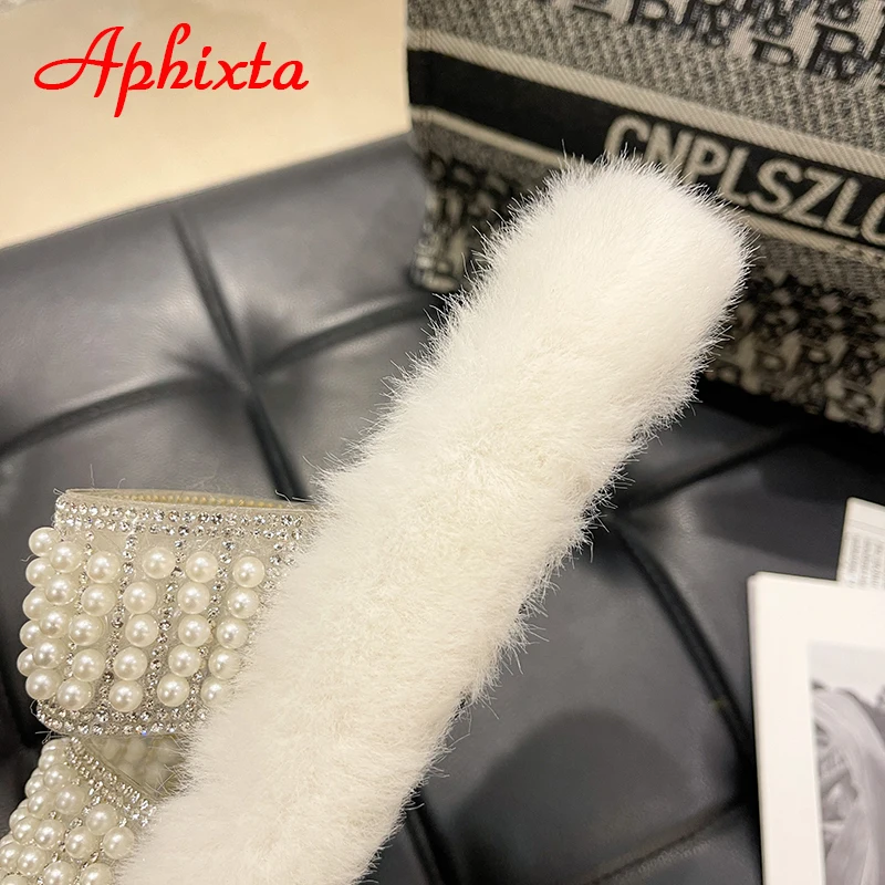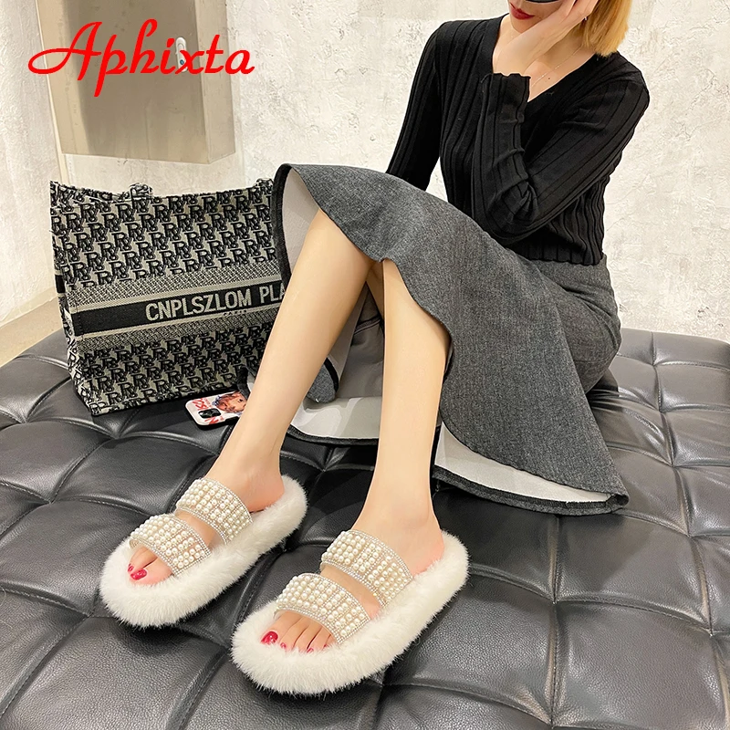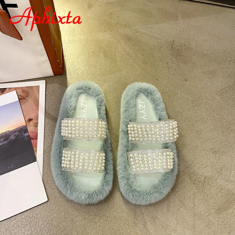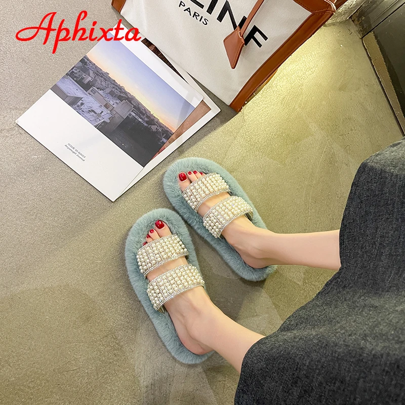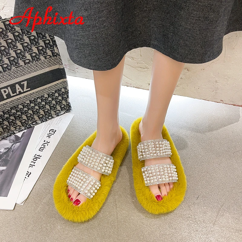Aphixta New Winter Warm Luxury Peal Home Furry Slippers Women Round Toe Mules Shoes Indoor Flip Flop Female