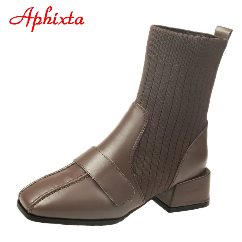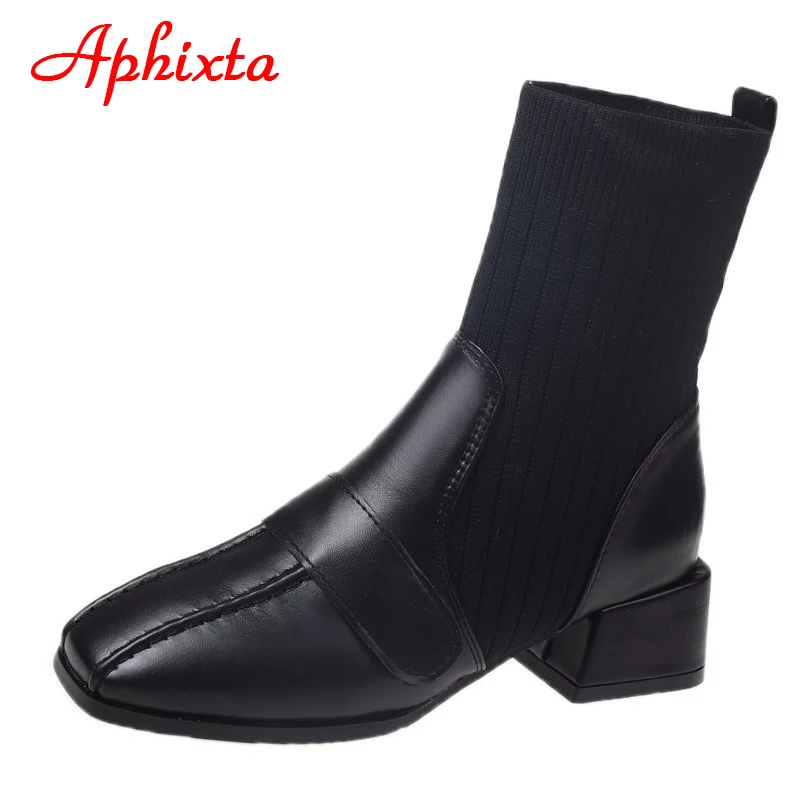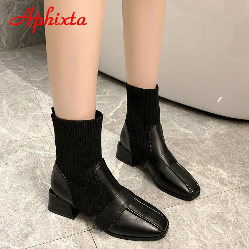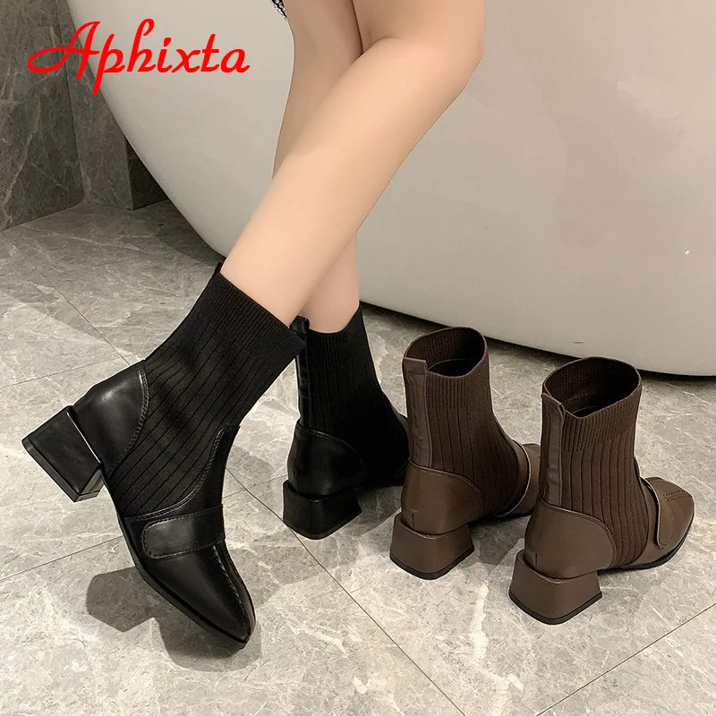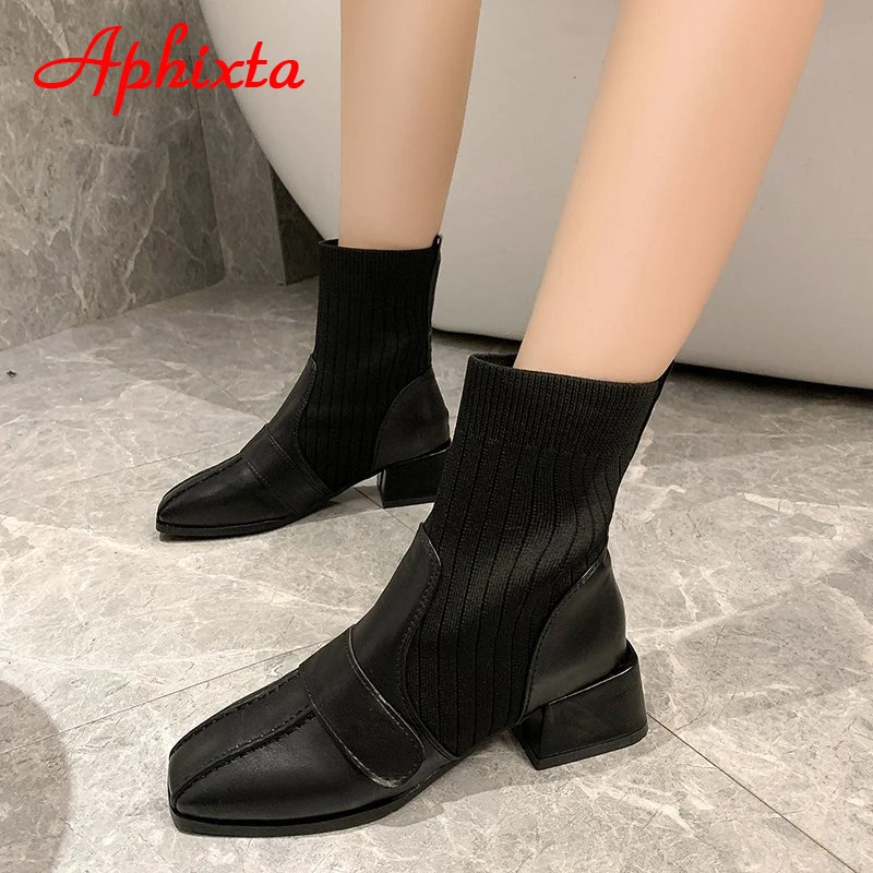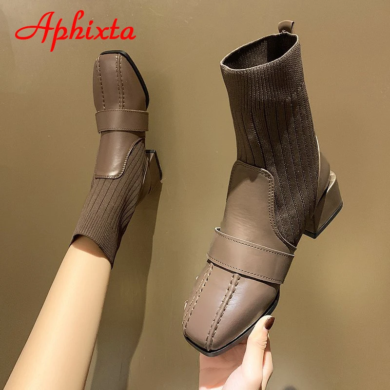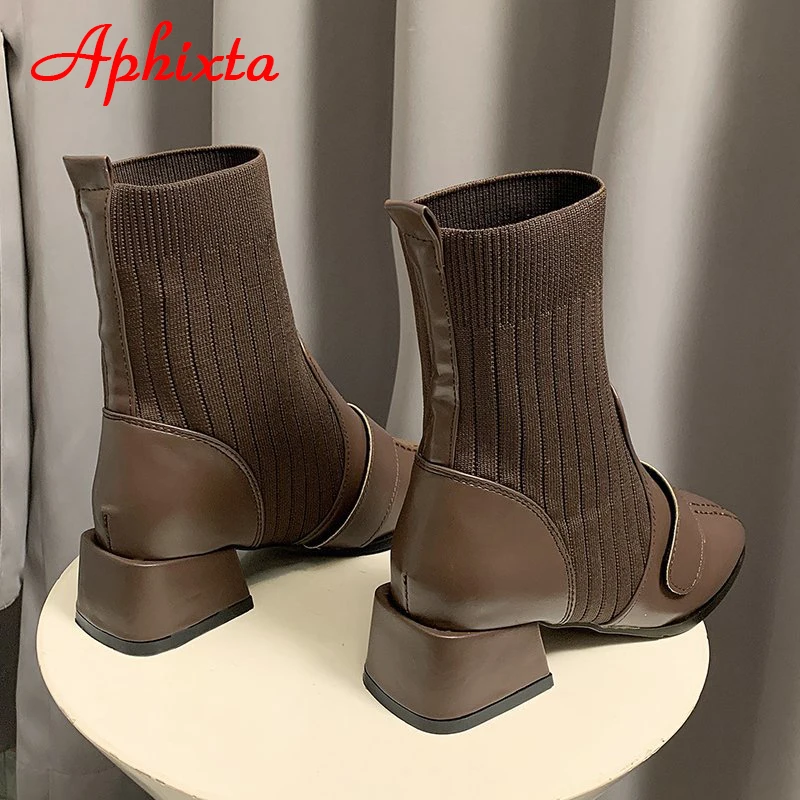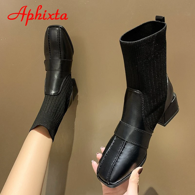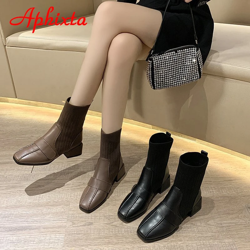 Aphixta Patchwork Stretch Fabric Socks Boots Women Shoes 4.5cm Square Heel Fashion Square Toe Female Ankle Boots Big Size 42 43