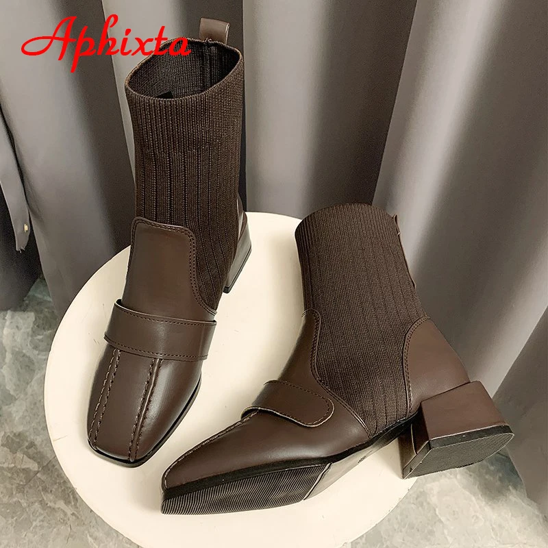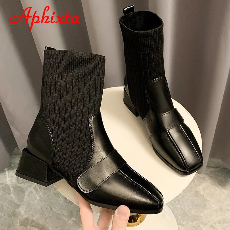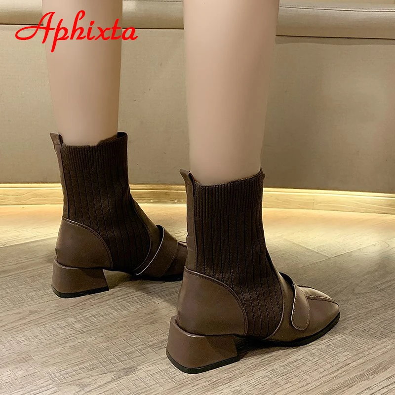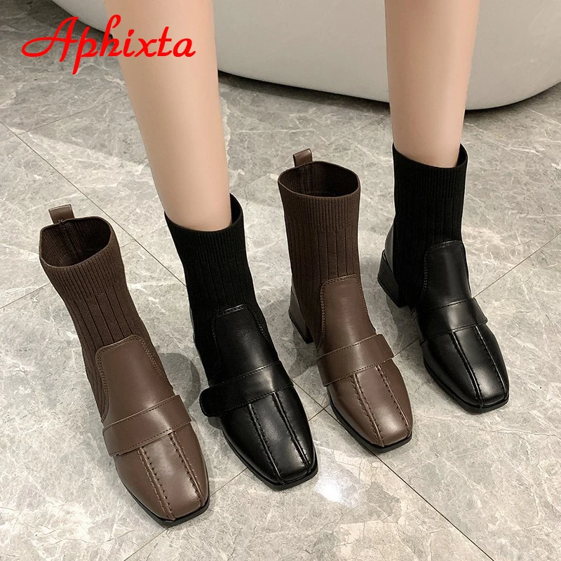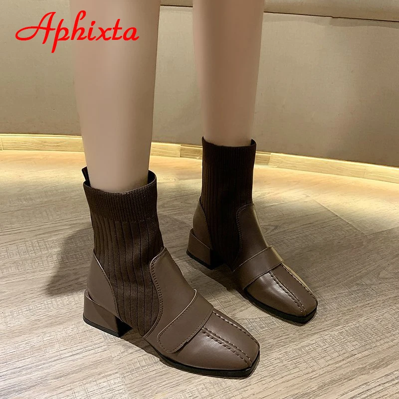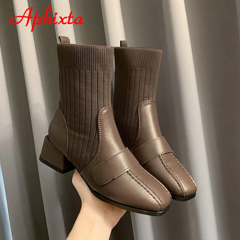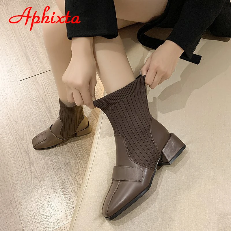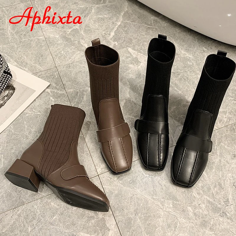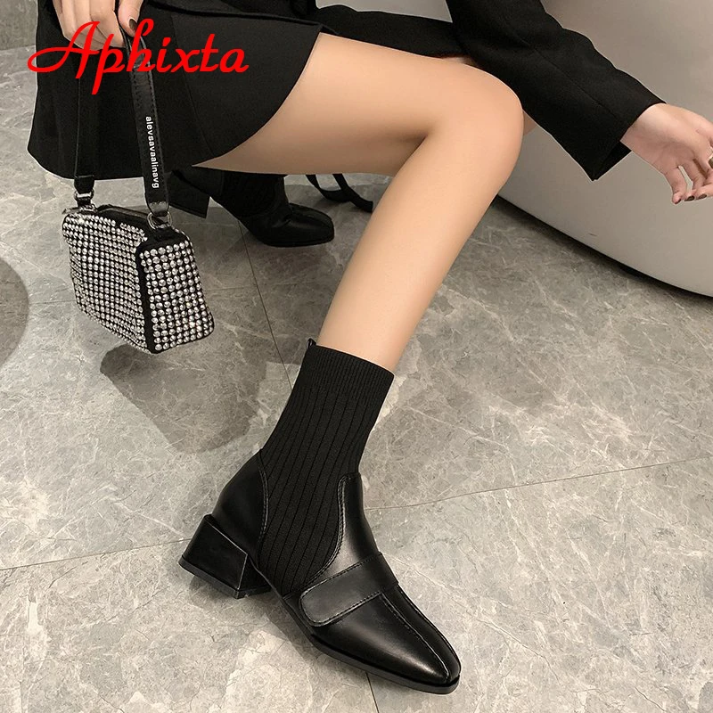Aphixta Patchwork Stretch Fabric Socks Boots Women Shoes 4.5cm Square Heel Fashion Square Toe Female Ankle Boots Big Size 42 43