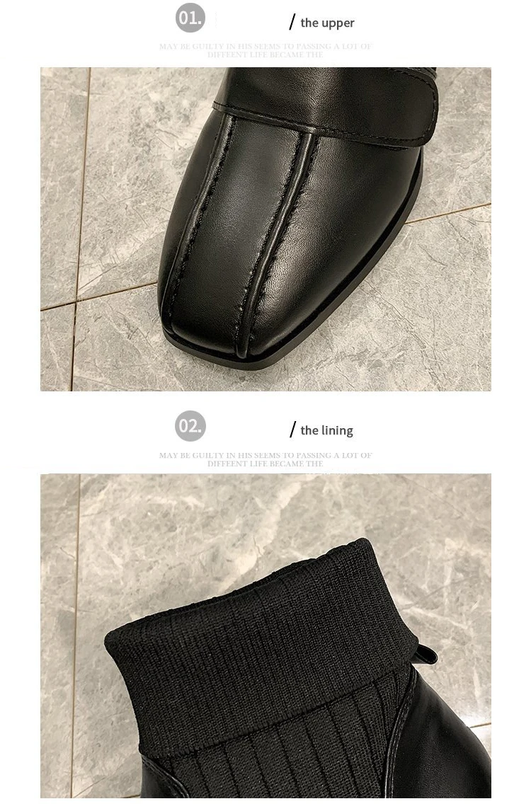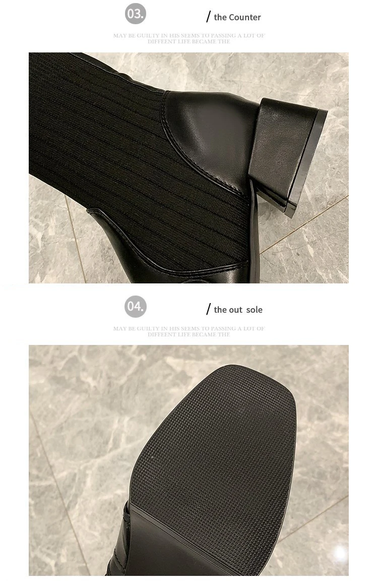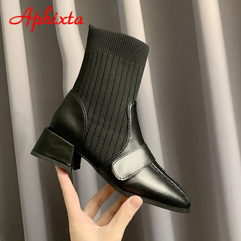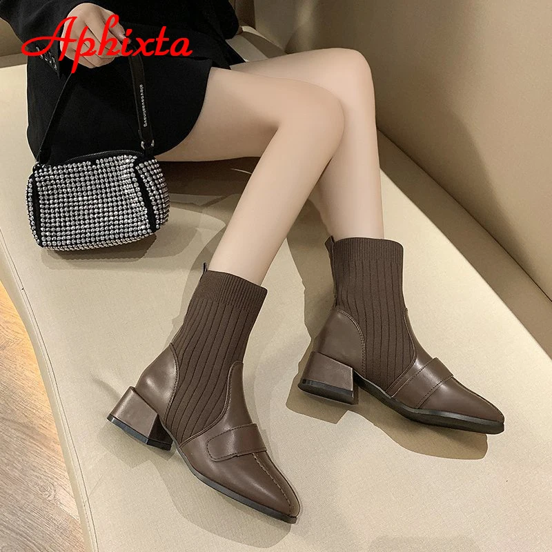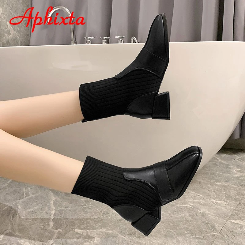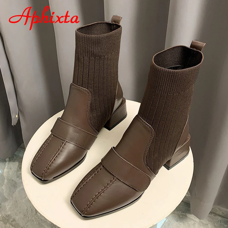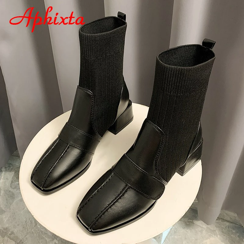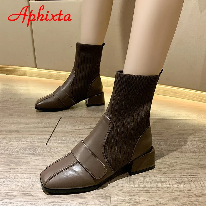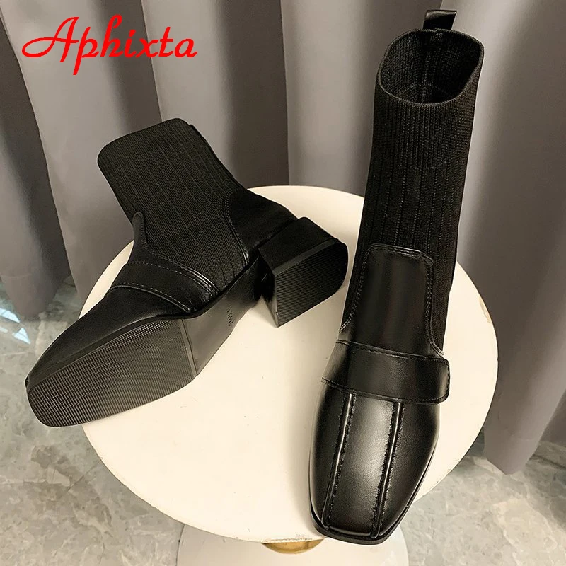 Aphixta Patchwork Stretch Fabric Socks Boots Women Shoes 4.5cm Square Heel Fashion Square Toe Female Ankle Boots Big Size 42 43