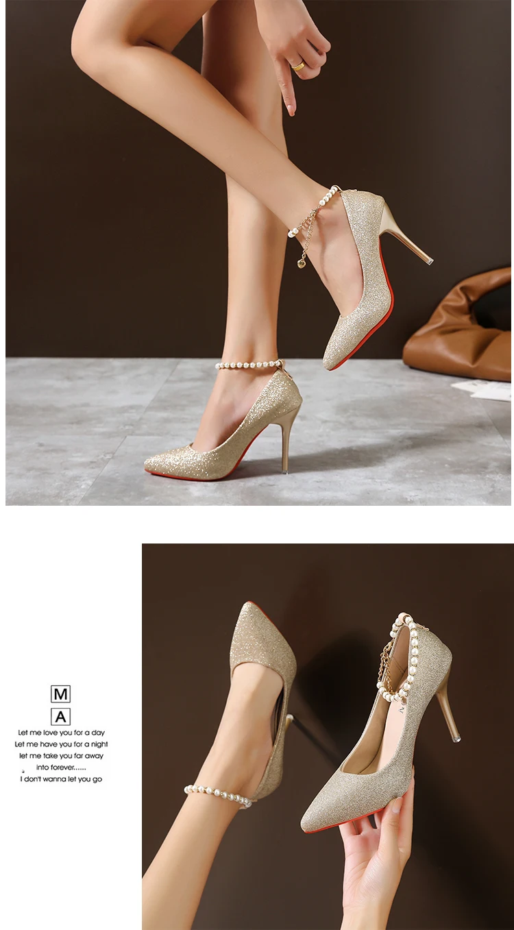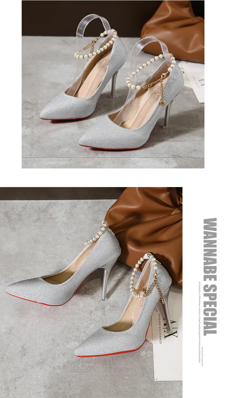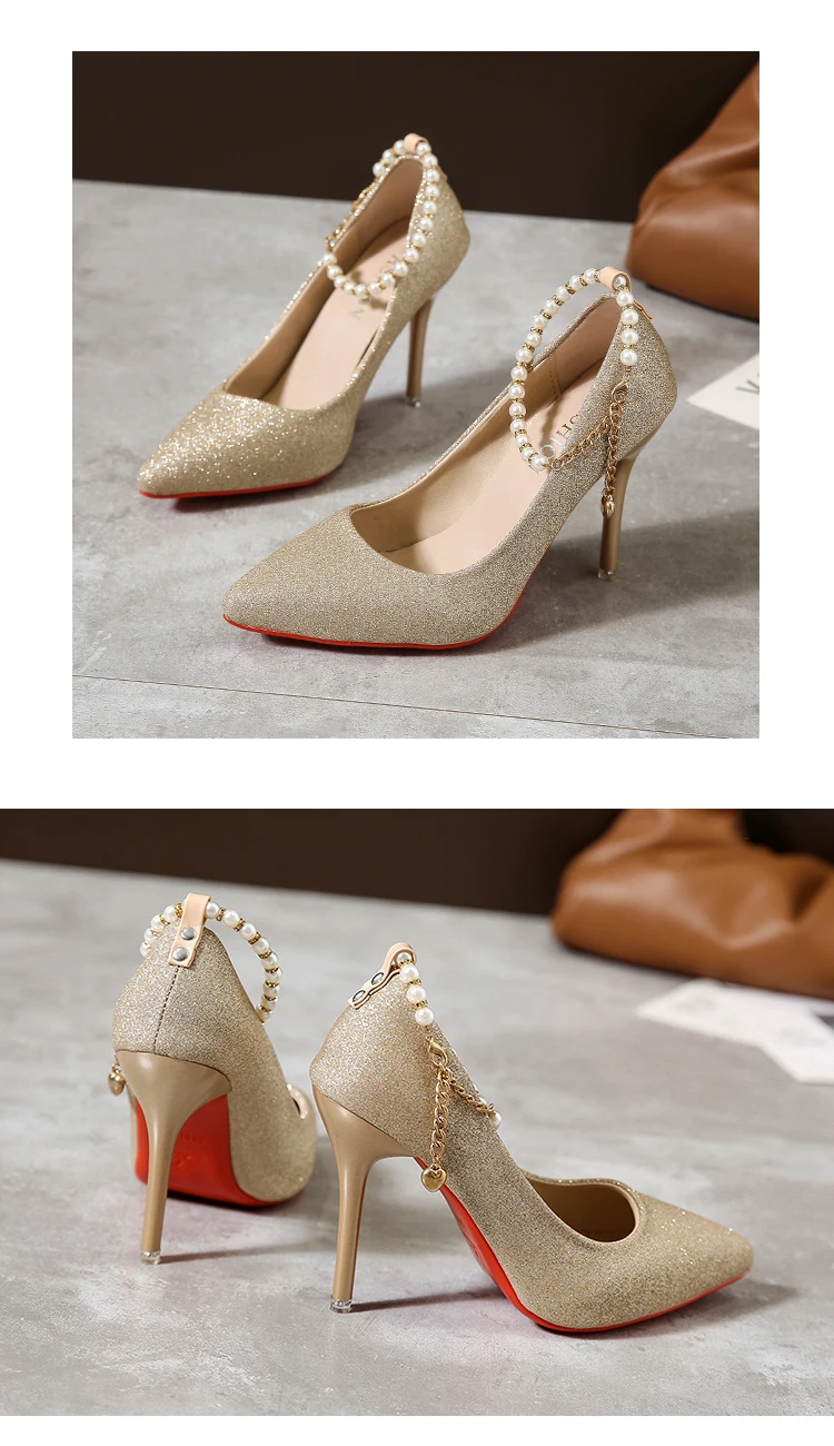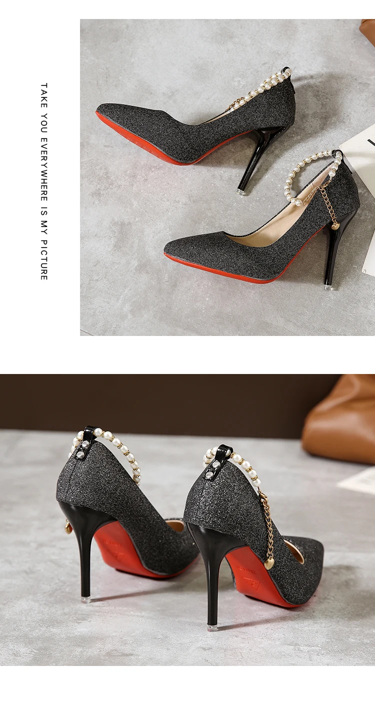 Aphixta Pearl Chain Luxury 10cm Thin Heels Women Pumps Pointed Toe Official Sequined Leather Shoes Wedding Super Big Size 45