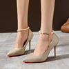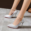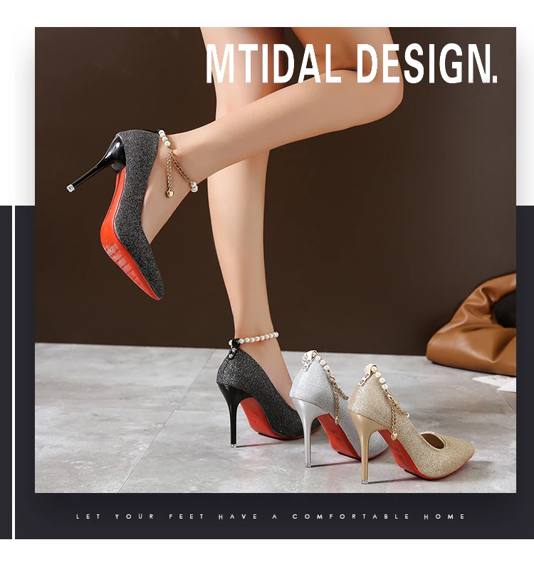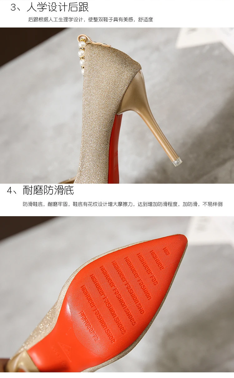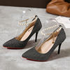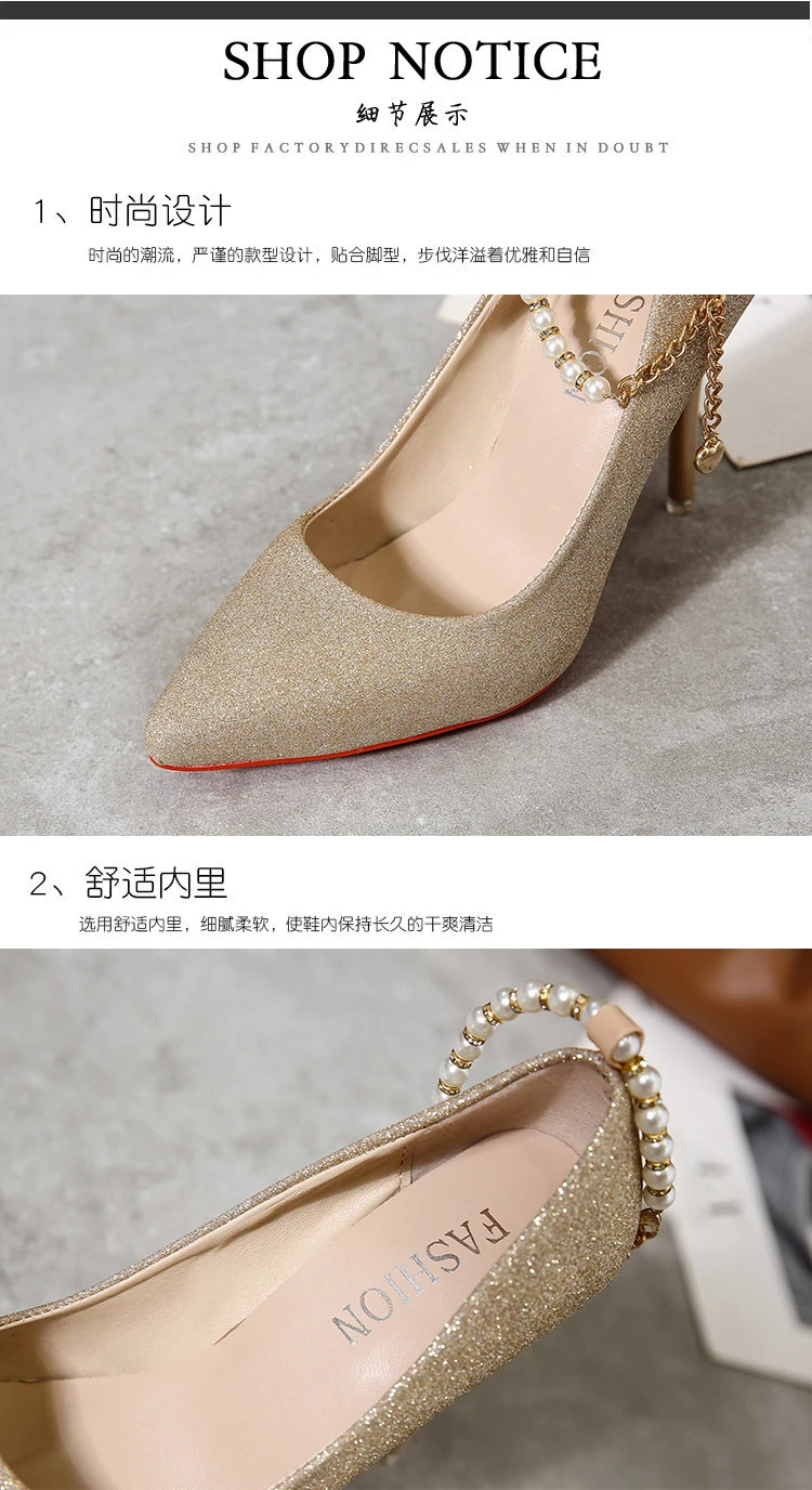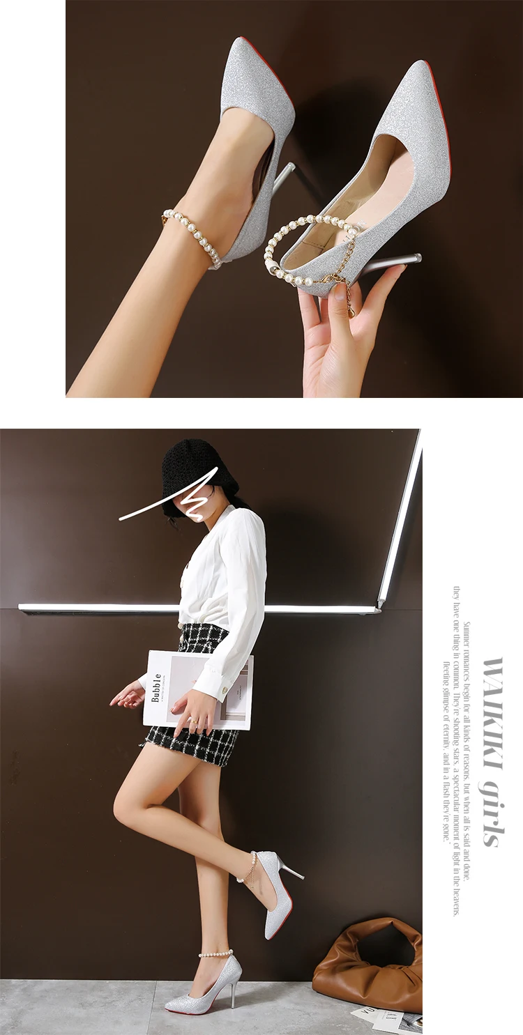 Aphixta Pearl Chain Luxury 10cm Thin Heels Women Pumps Pointed Toe Official Sequined Leather Shoes Wedding Super Big Size 45