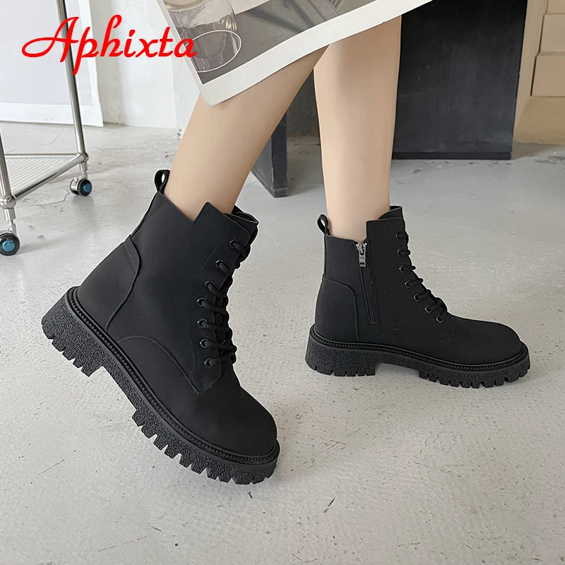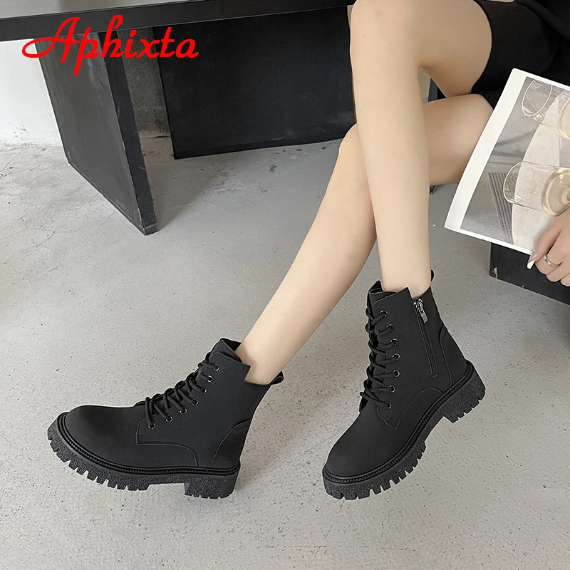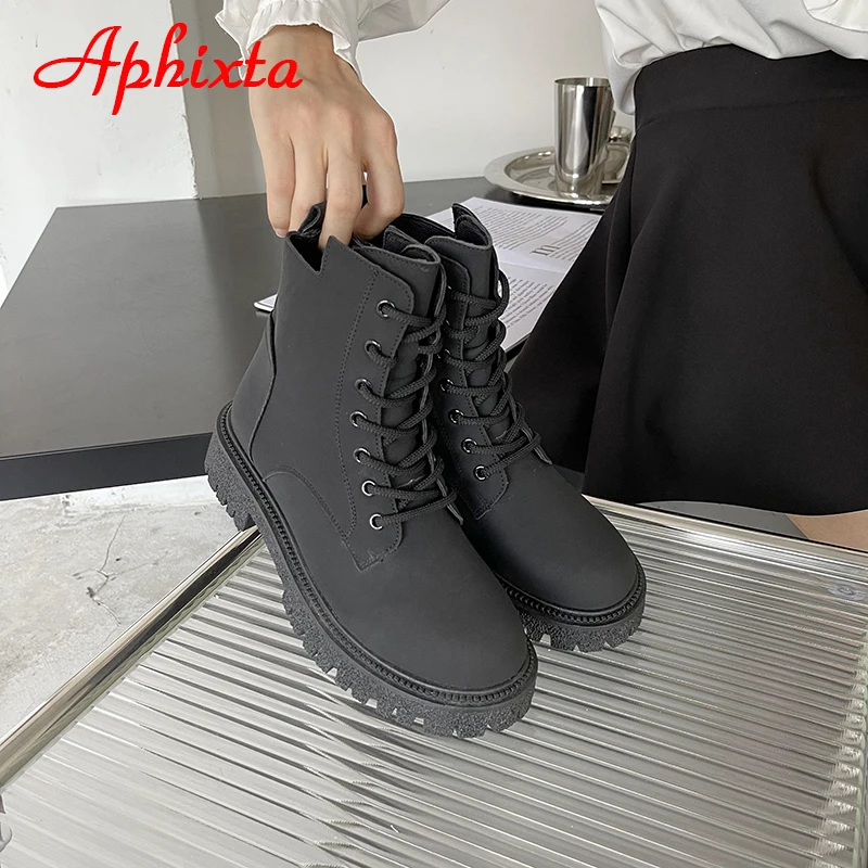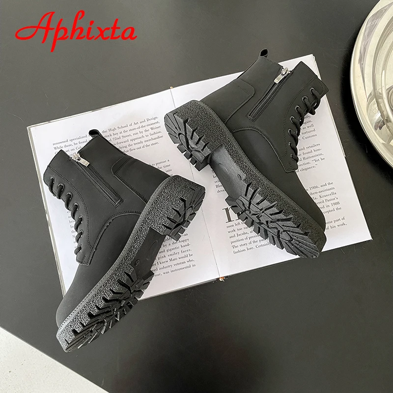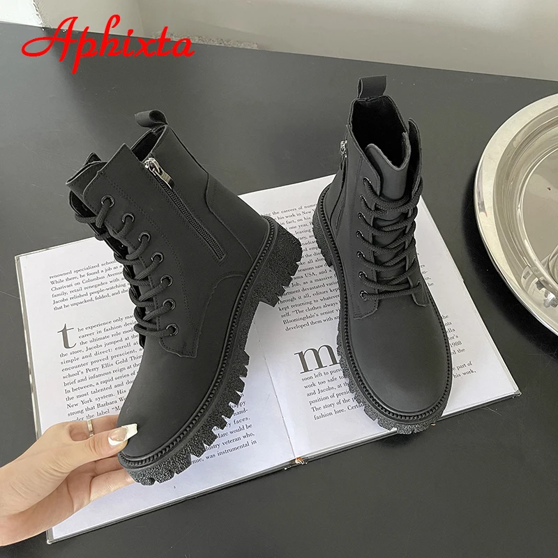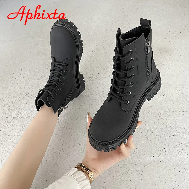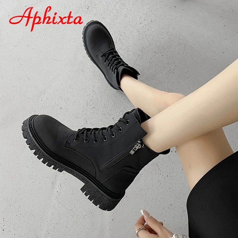Aphixta Platform Sports Battle Boots Women Leather Winter Anti Slip Lace-up & Zipper Shoes Chunky Sole Motorcycle Short Boots