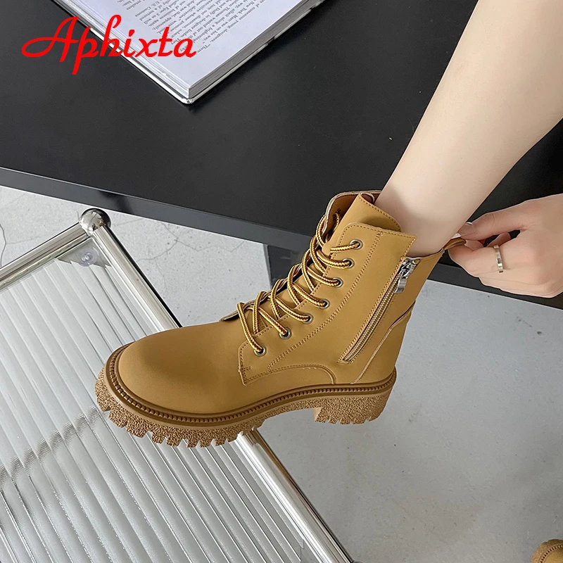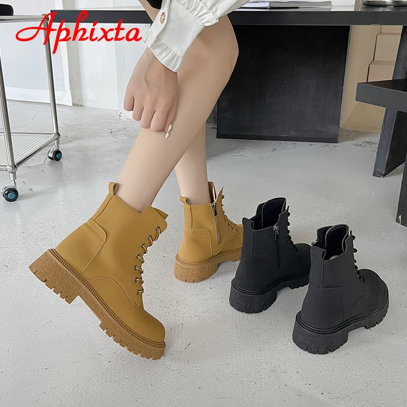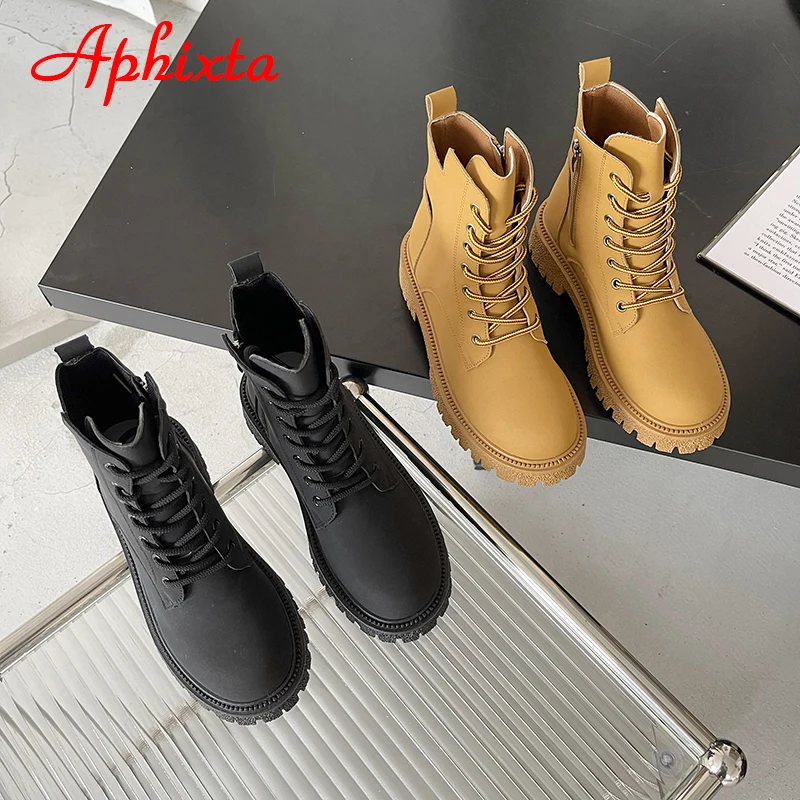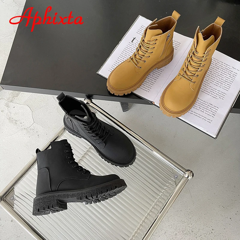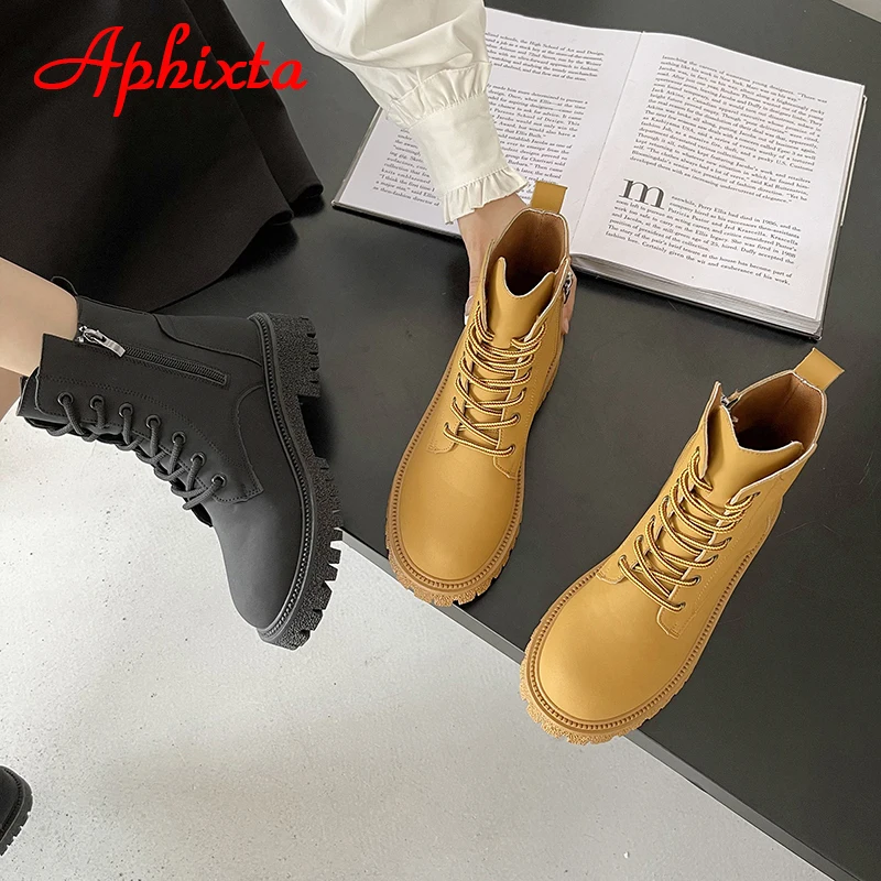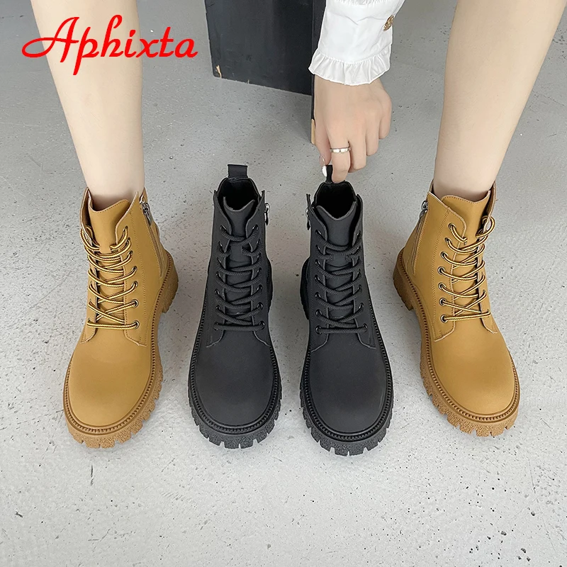 Aphixta Platform Sports Battle Boots Women Leather Winter Anti Slip Lace-up & Zipper Shoes Chunky Sole Motorcycle Short Boots