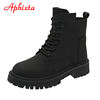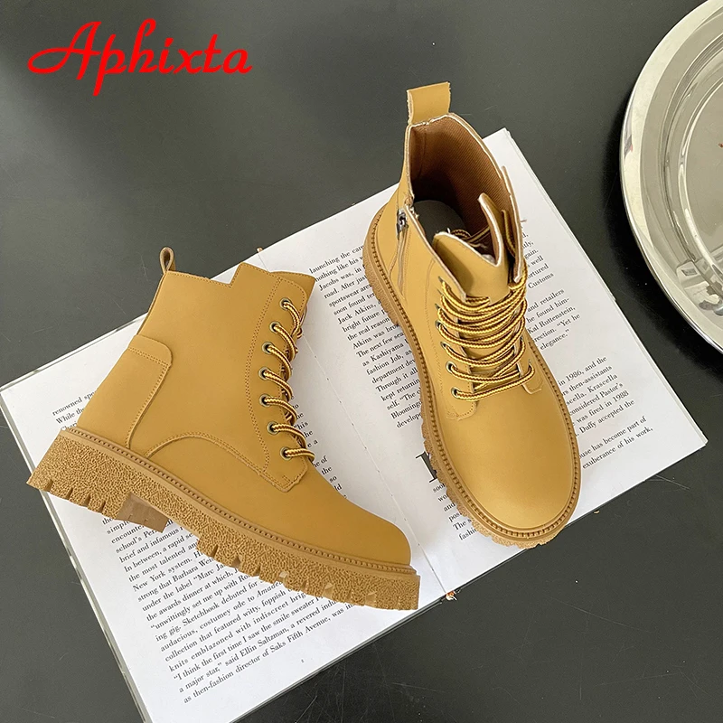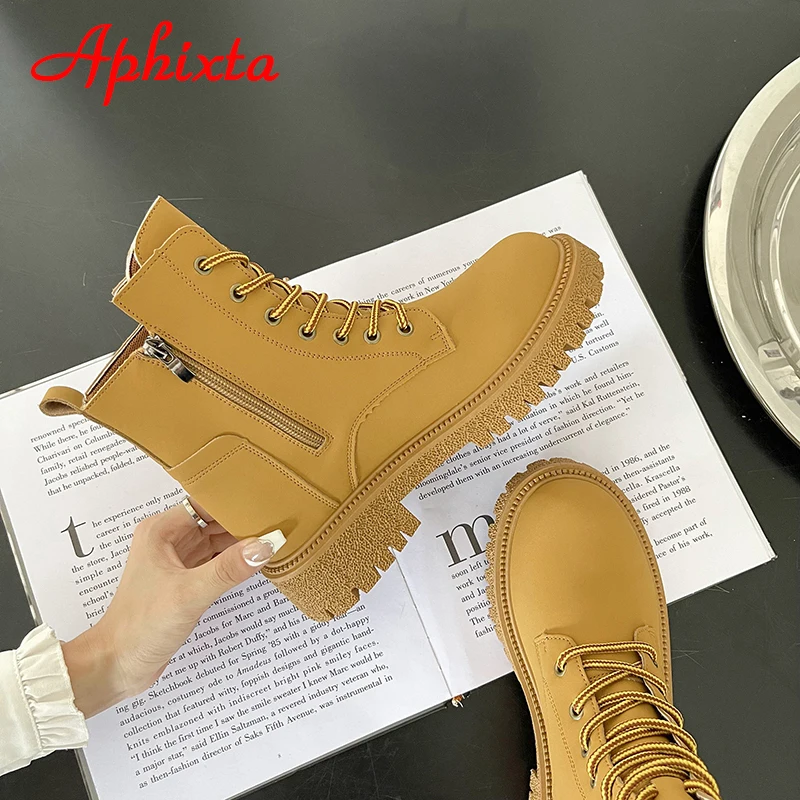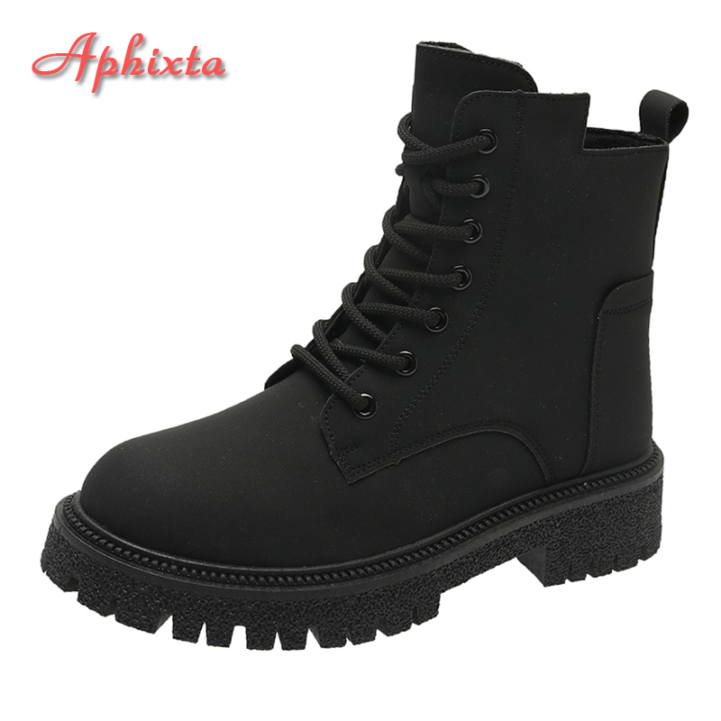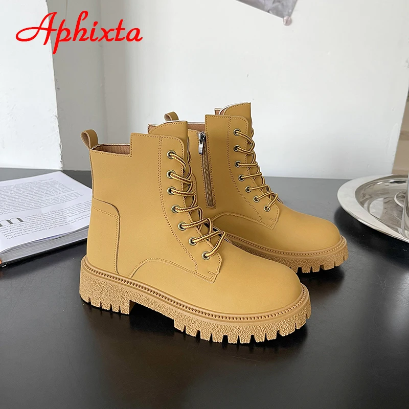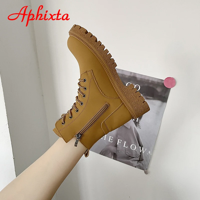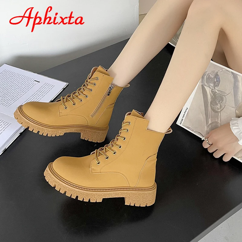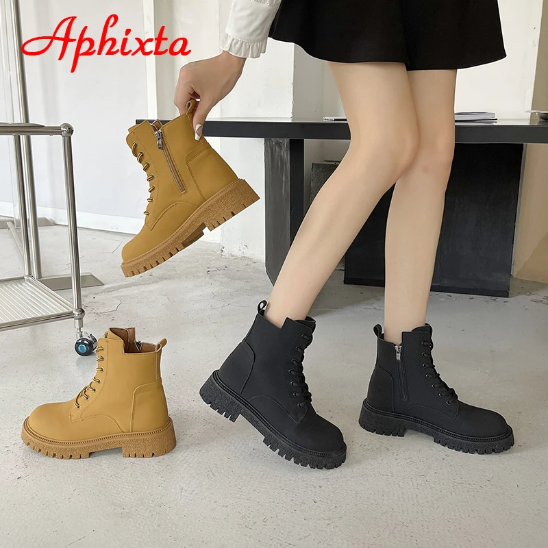 Aphixta Platform Sports Battle Boots Women Leather Winter Anti Slip Lace-up & Zipper Shoes Chunky Sole Motorcycle Short Boots