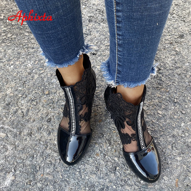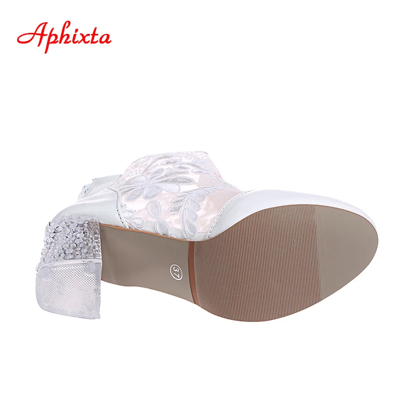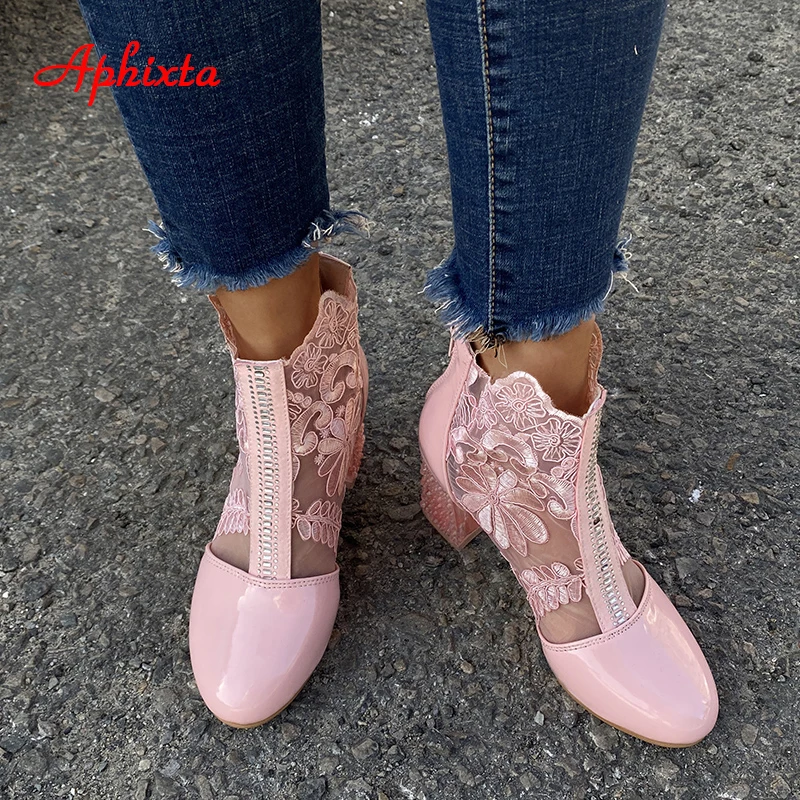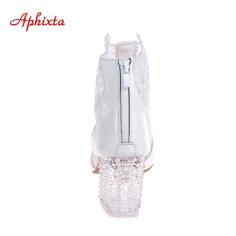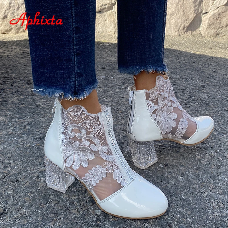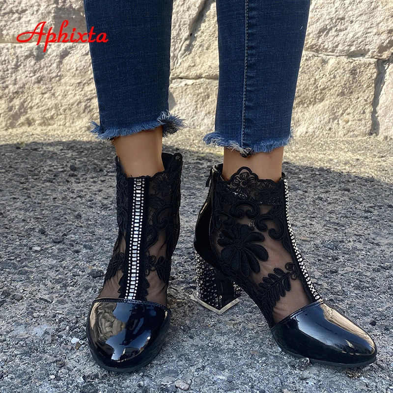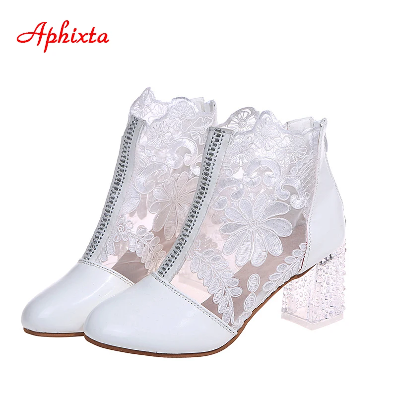 Aphixta Plus Size 43 Summer Breathable Sandals Boots Women Lace Air Mesh Crystals Transparent Square Heels Back Zipper Boots