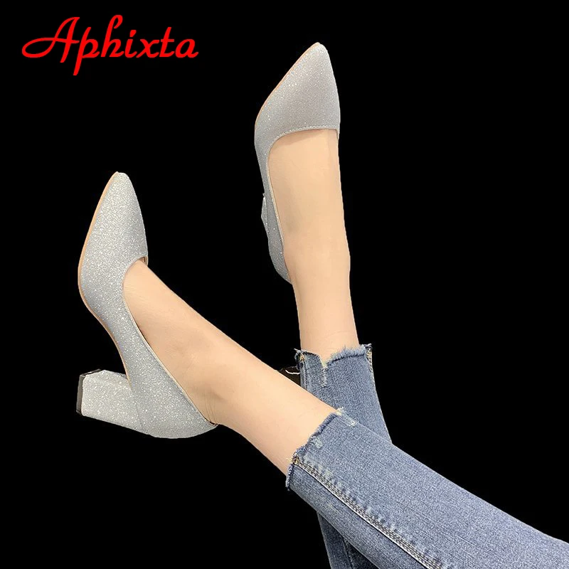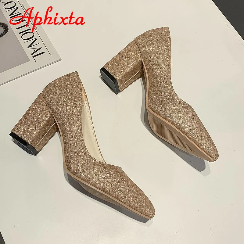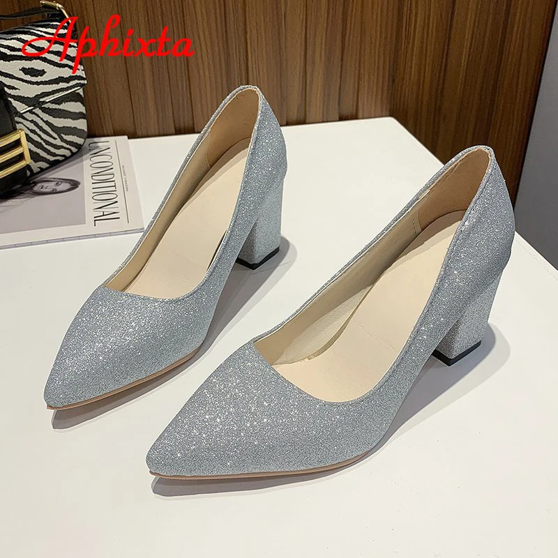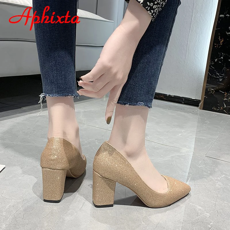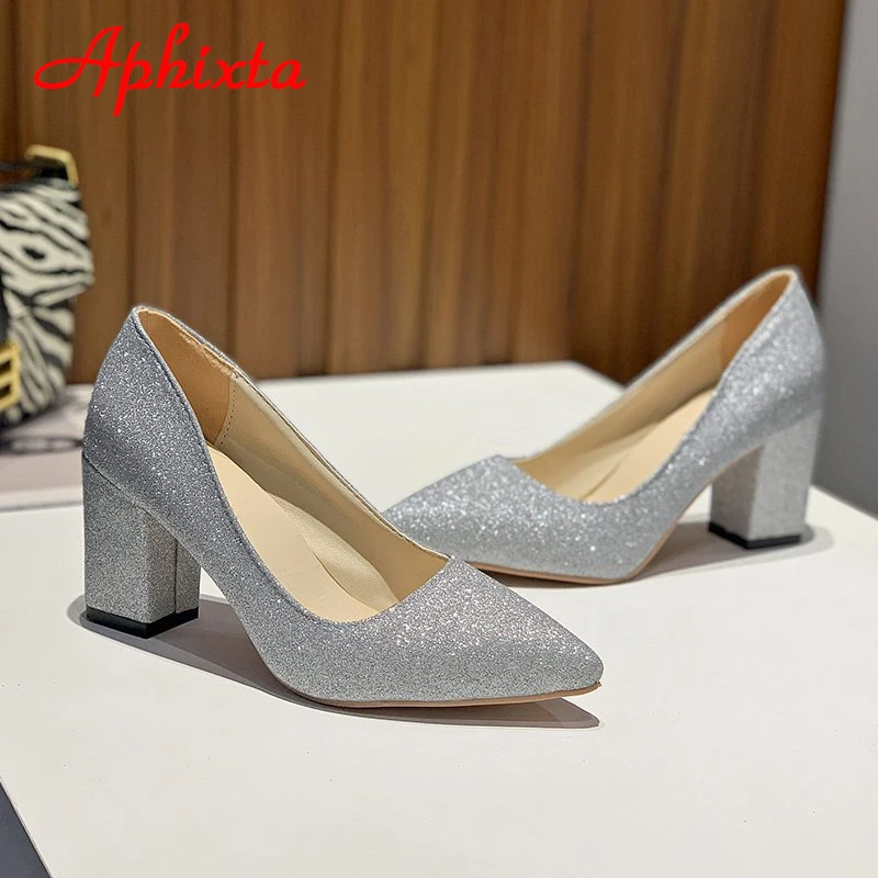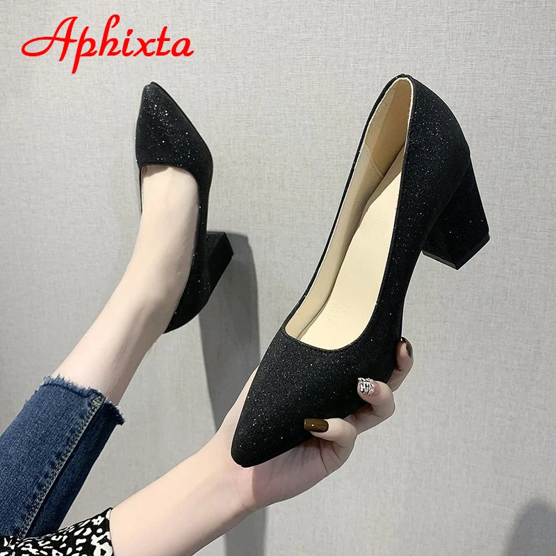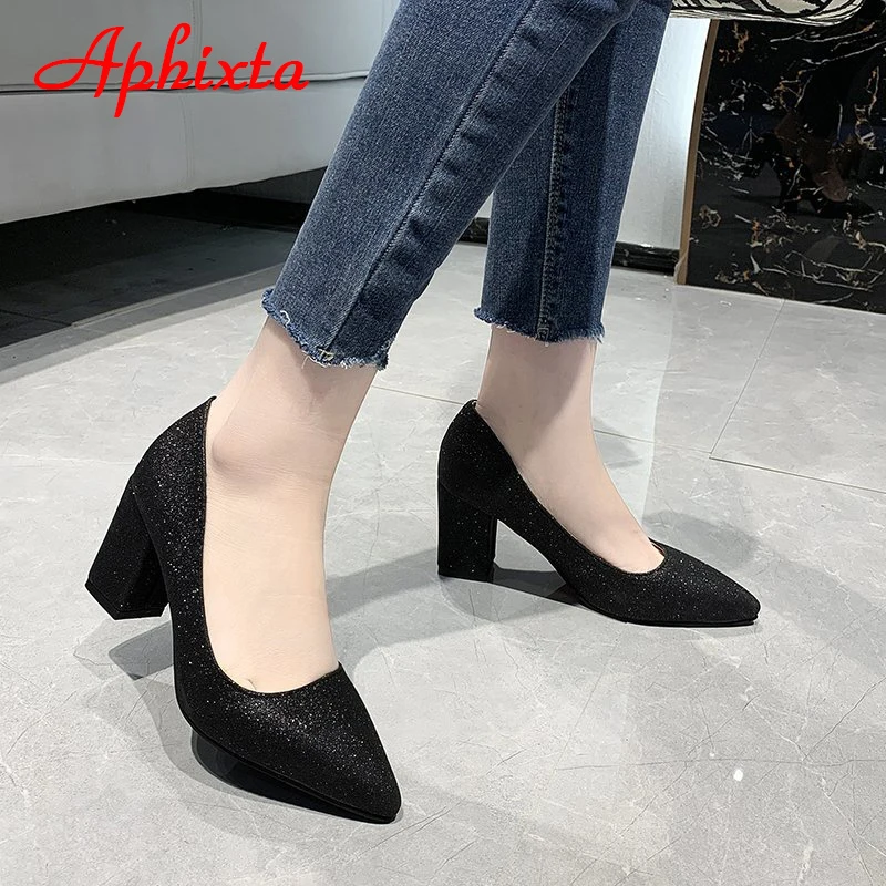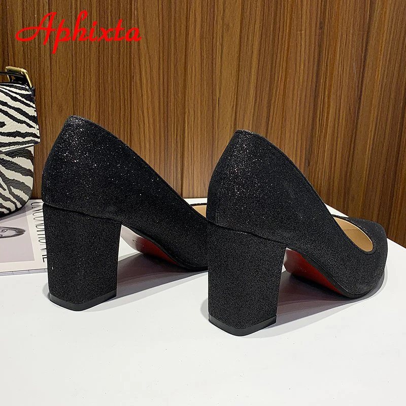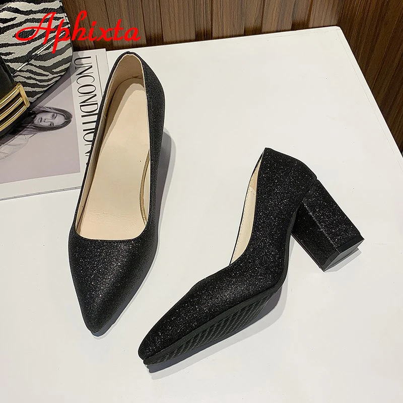 Aphixta Pointed Toe Shoes Women Pumps 7.5cm Career Square Heels Bling Fashion Work Office Party Shoes Super Big Size 49 50