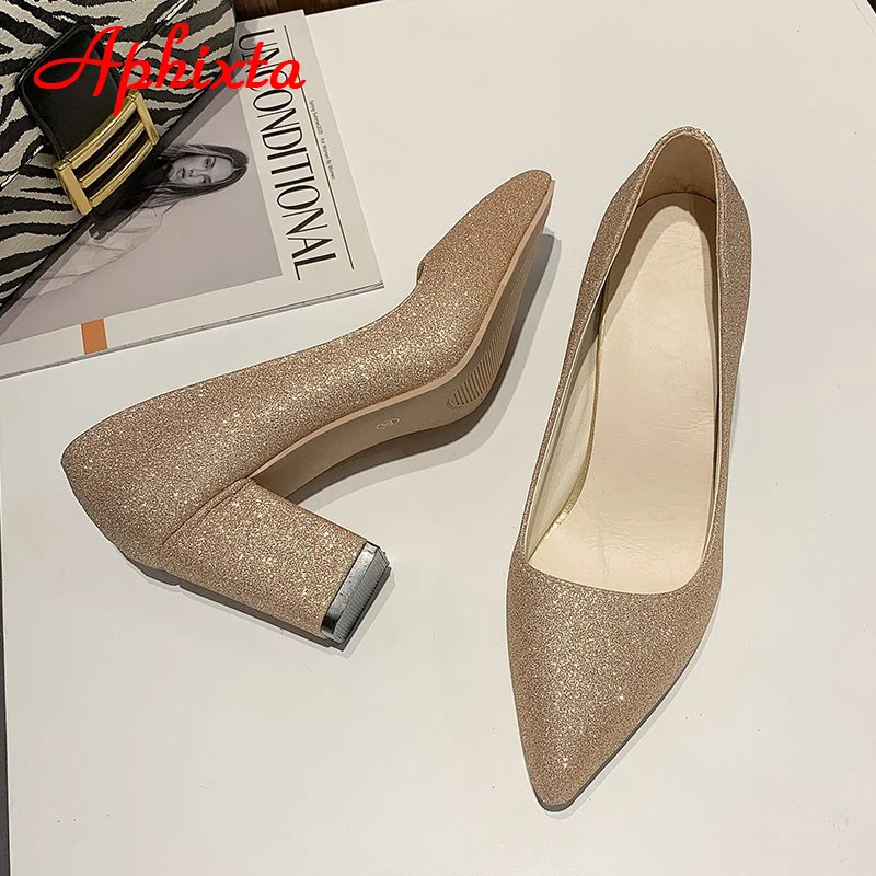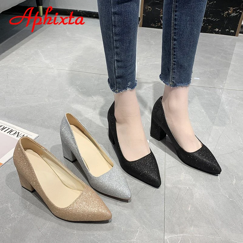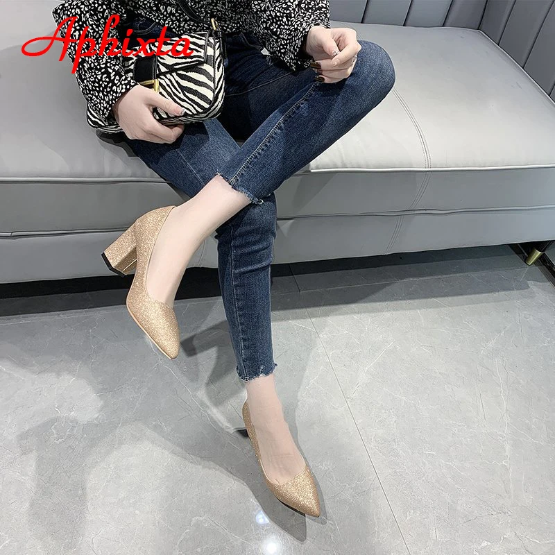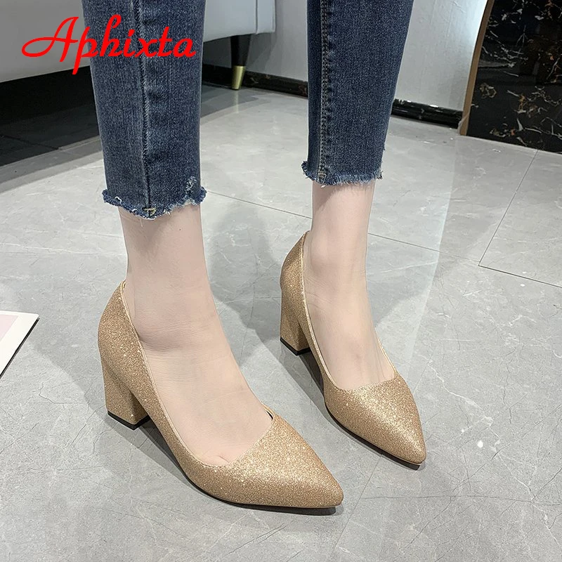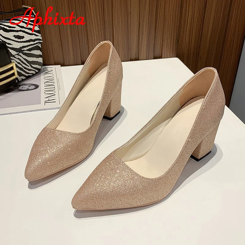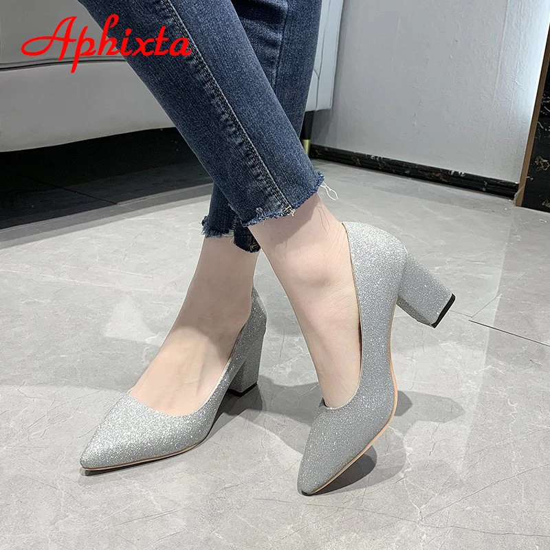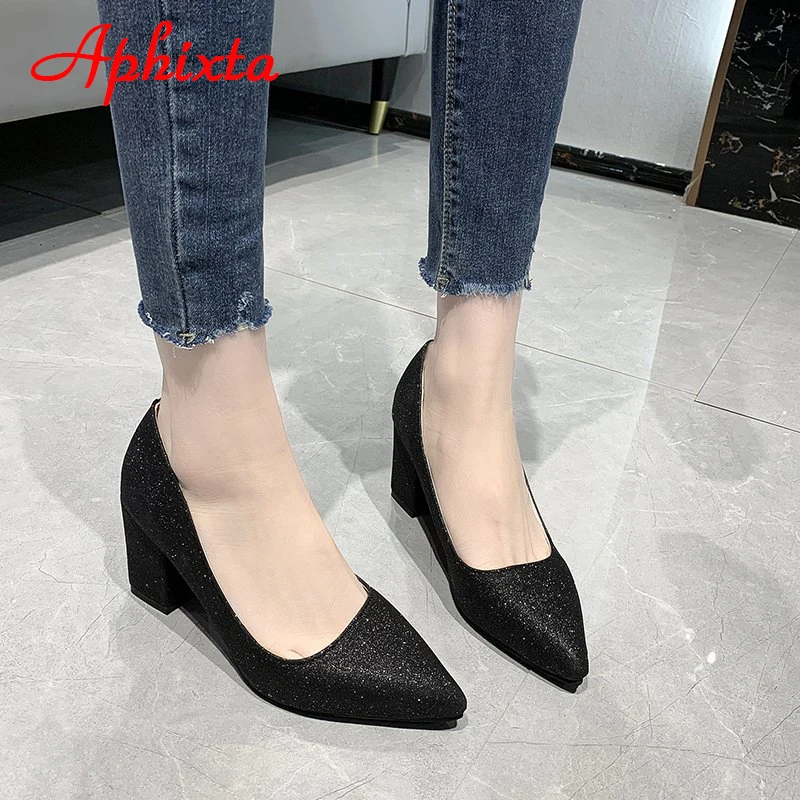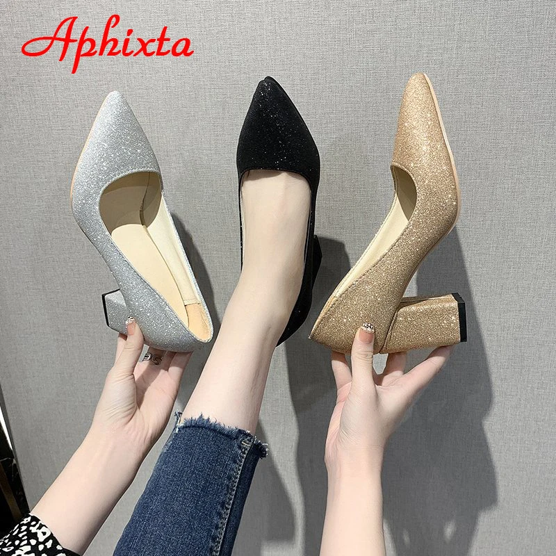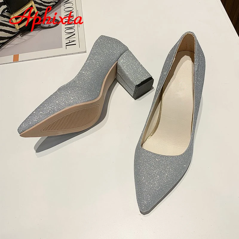 Aphixta Pointed Toe Shoes Women Pumps 7.5cm Career Square Heels Bling Fashion Work Office Party Shoes Super Big Size 49 50