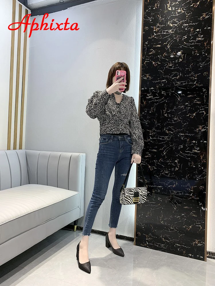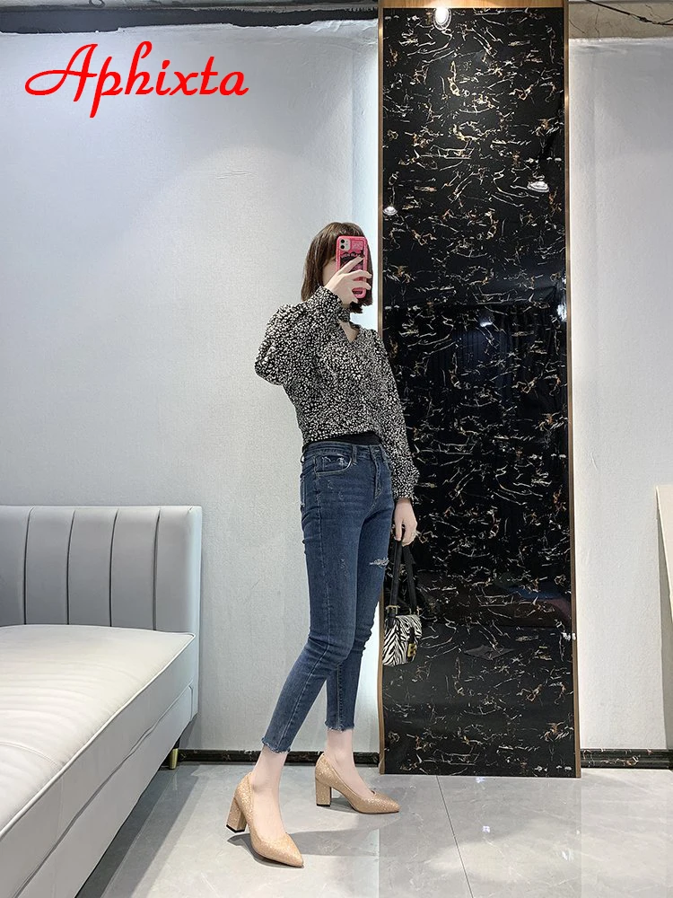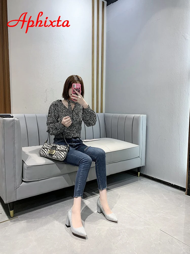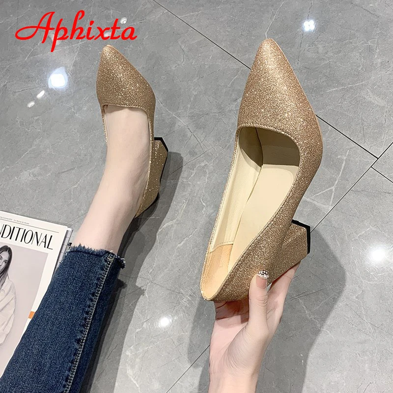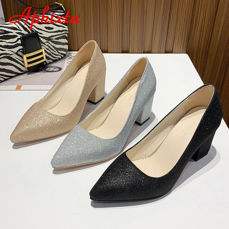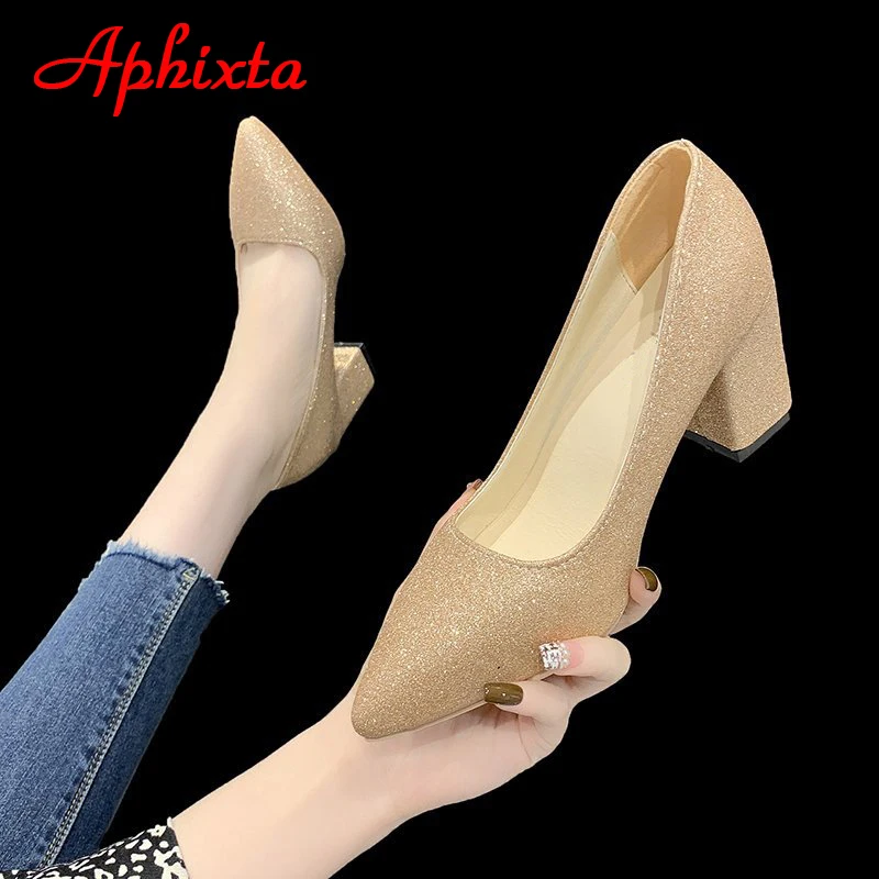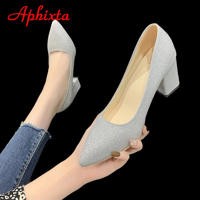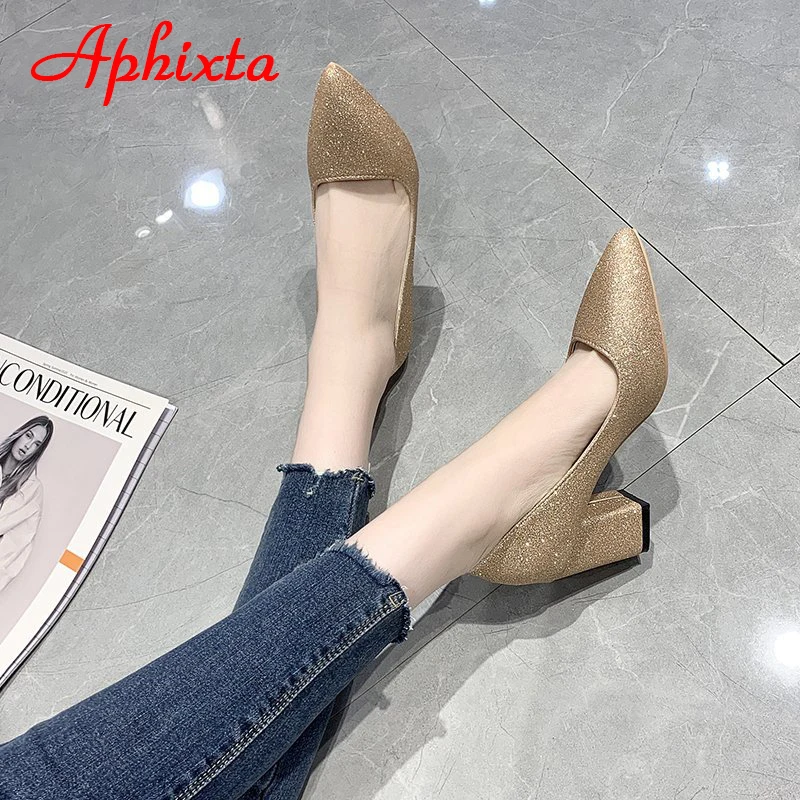 Aphixta Pointed Toe Shoes Women Pumps 7.5cm Career Square Heels Bling Fashion Work Office Party Shoes Super Big Size 49 50
