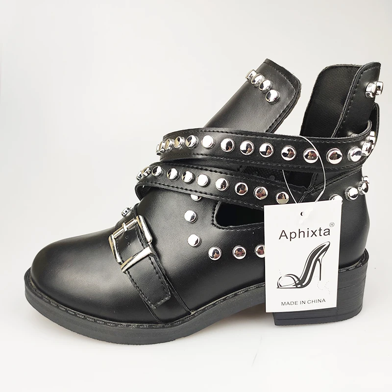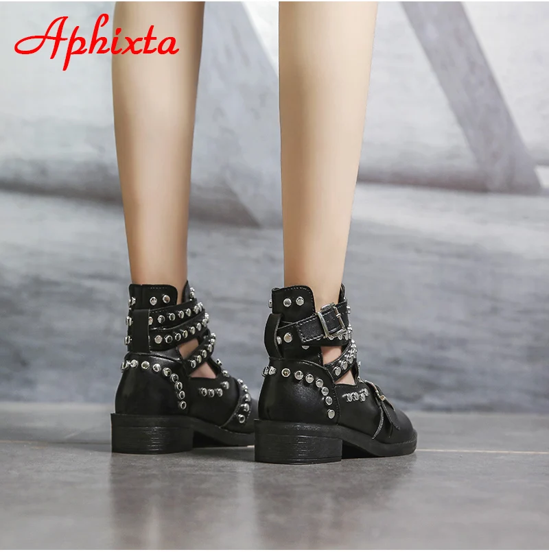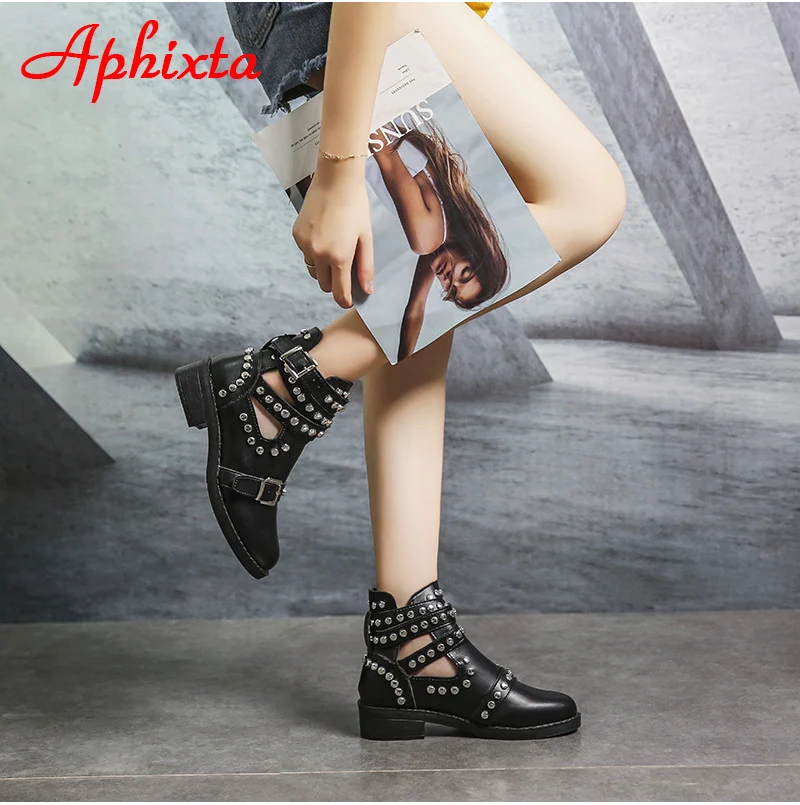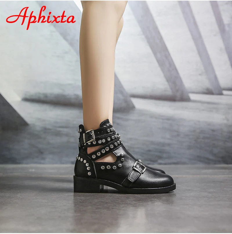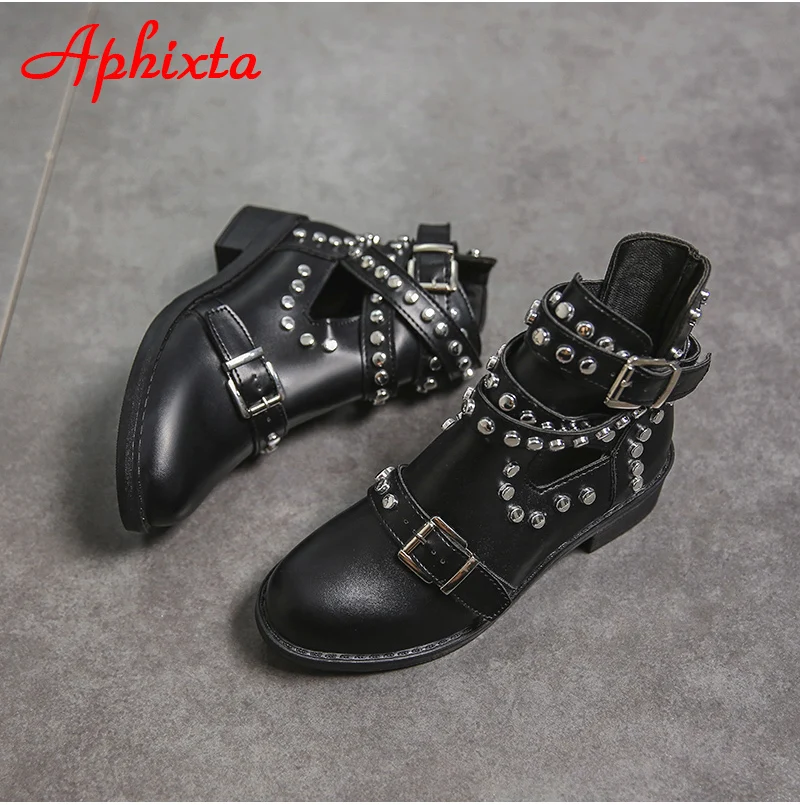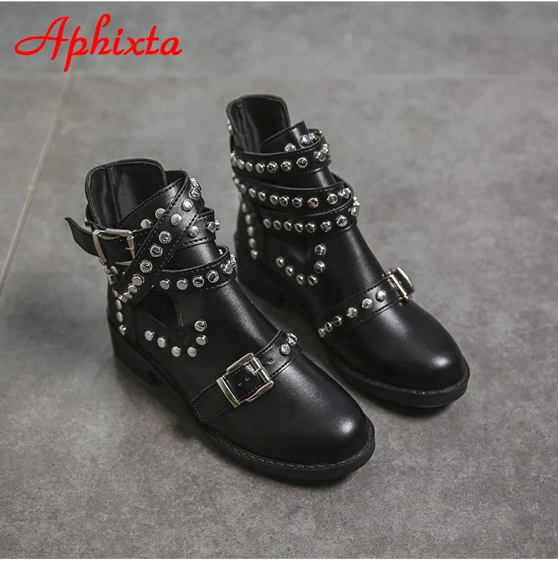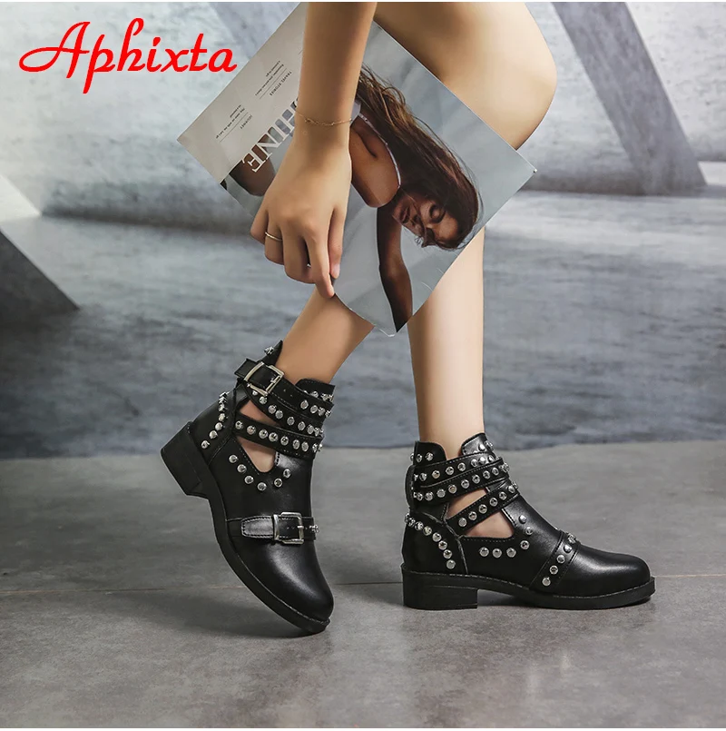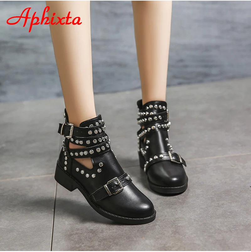 Aphixta Rivets Black Ankle Women Boots Faux Leather Booties Metal Buckle Straps Square Heel Studded Woman Boots Motorcycle Shoes