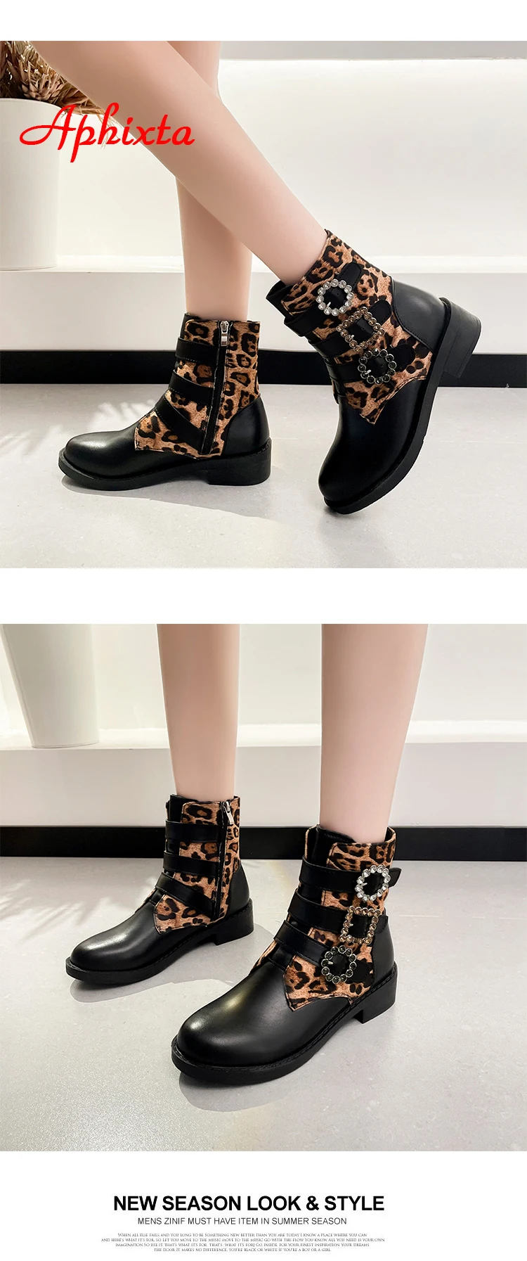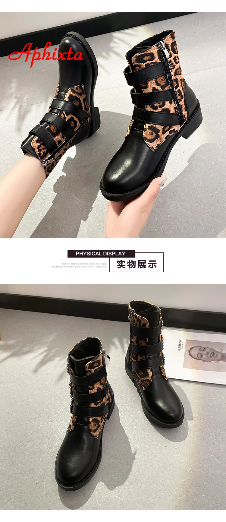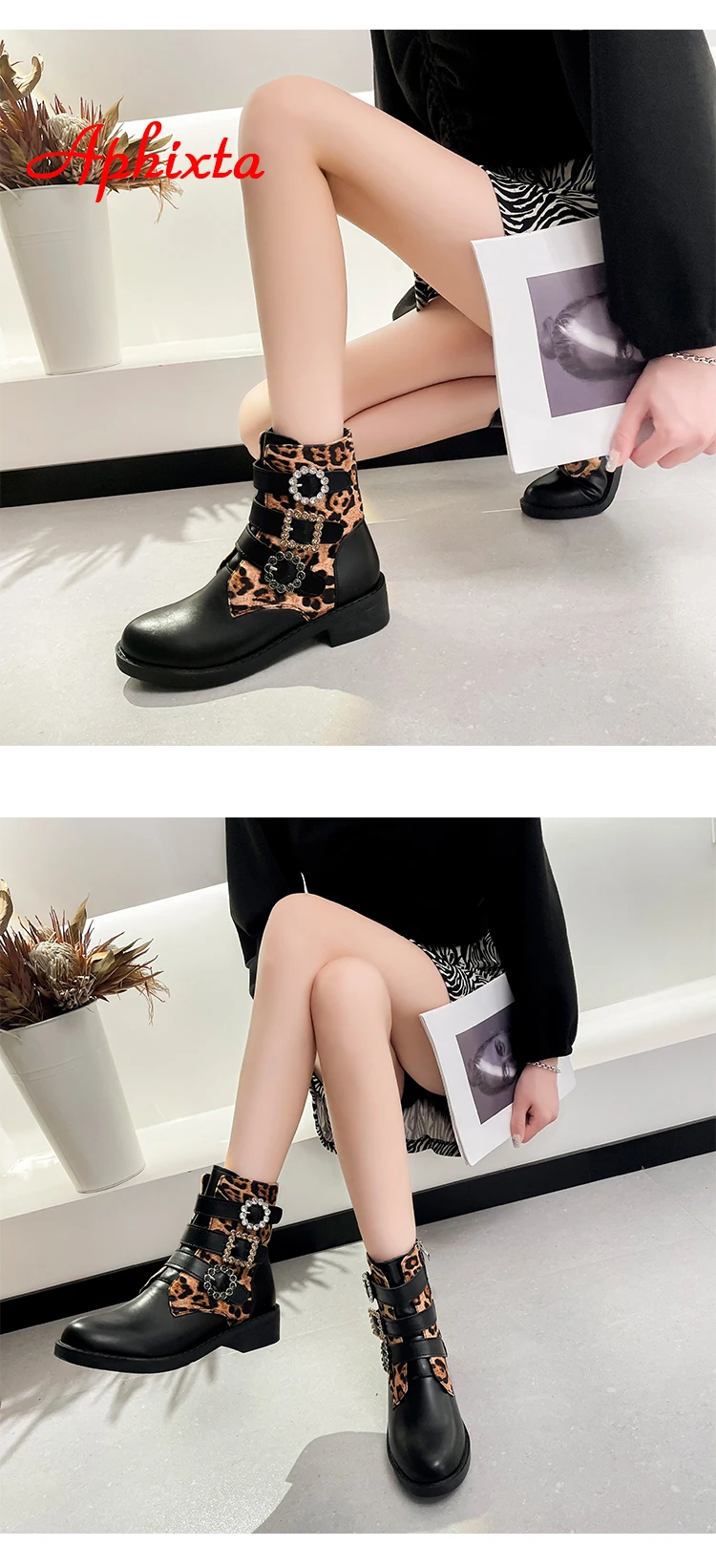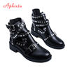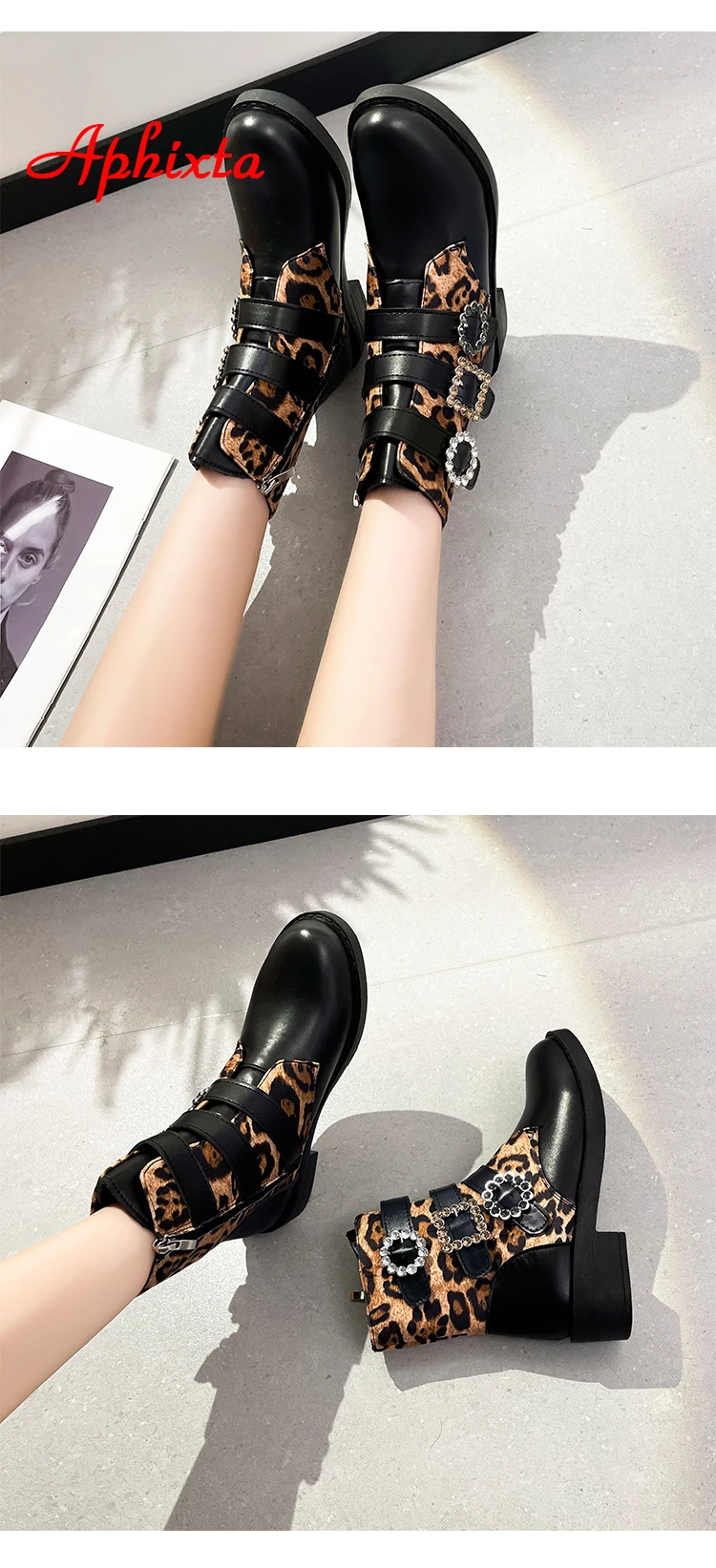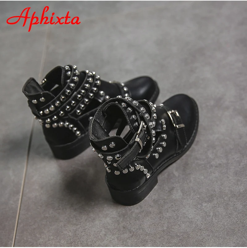 Aphixta Rivets Black Ankle Women Boots Faux Leather Booties Metal Buckle Straps Square Heel Studded Woman Boots Motorcycle Shoes