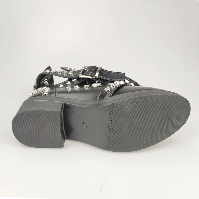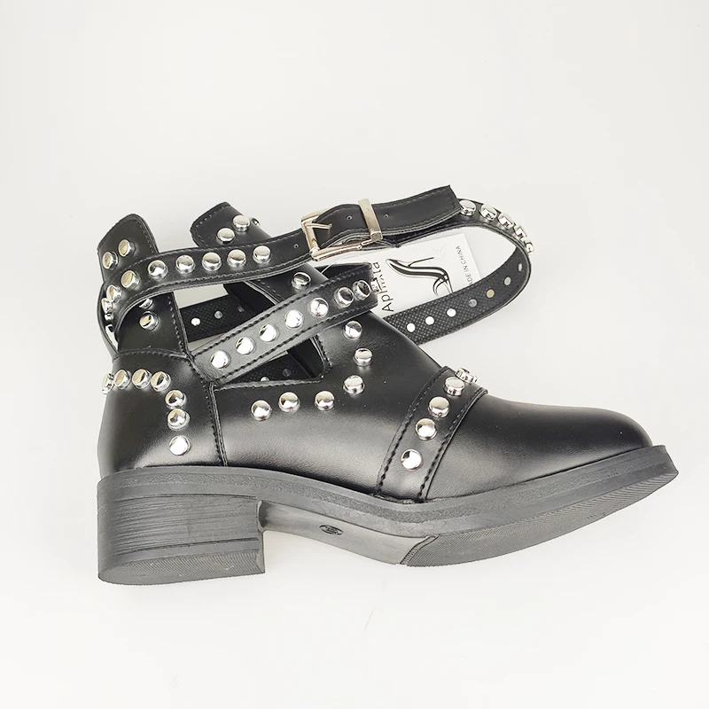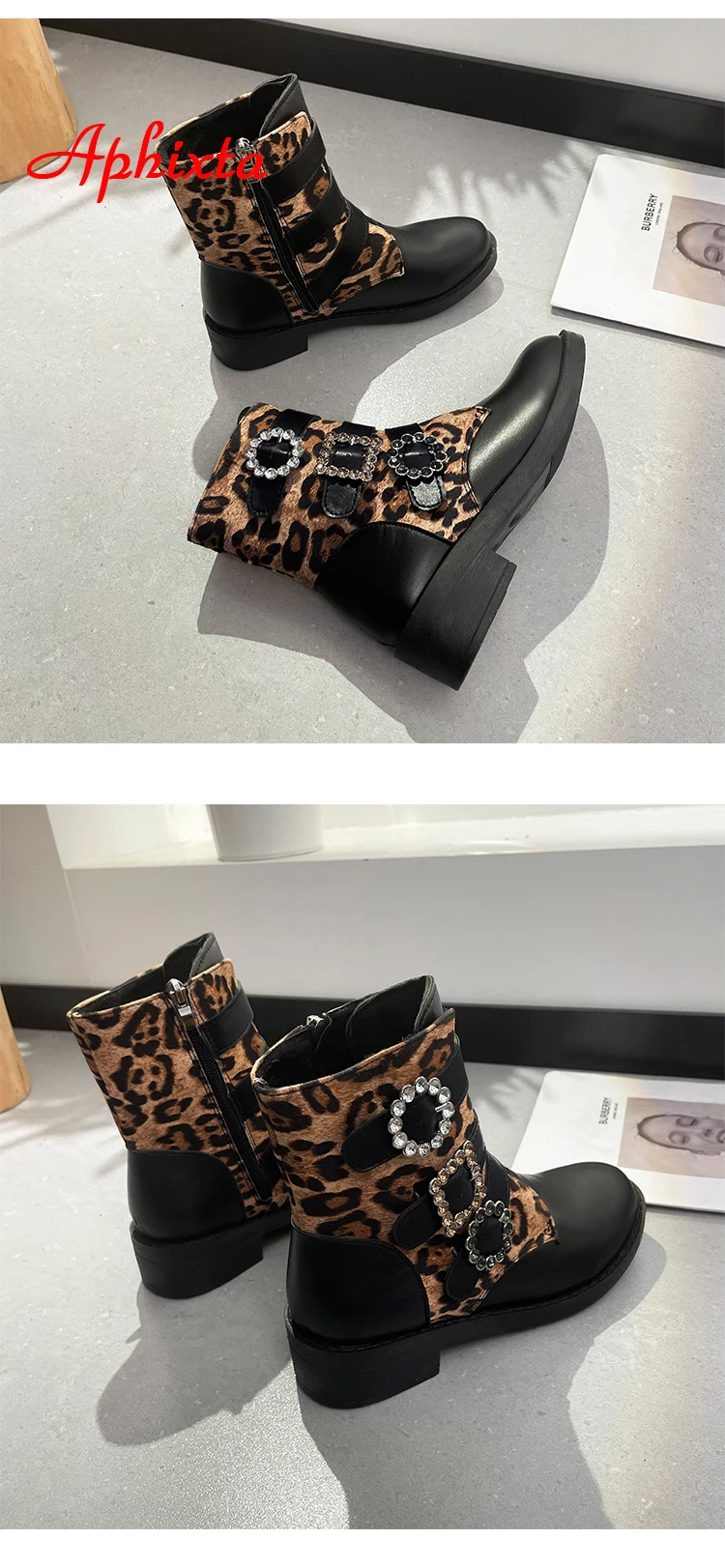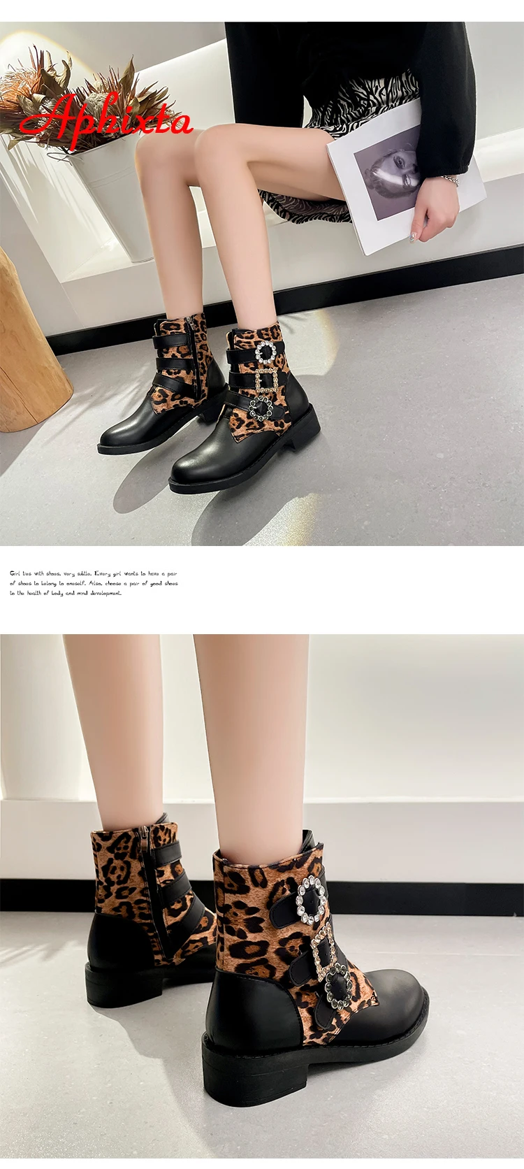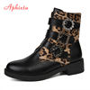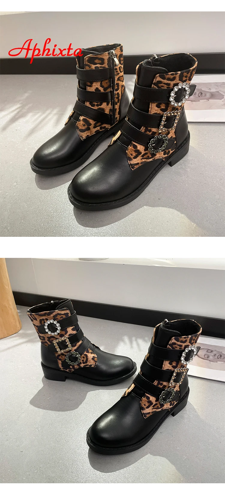 Aphixta Rivets Black Ankle Women Boots Faux Leather Booties Metal Buckle Straps Square Heel Studded Woman Boots Motorcycle Shoes