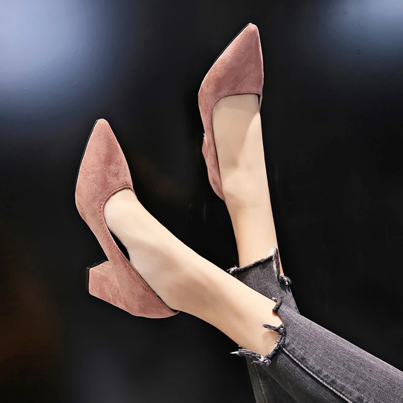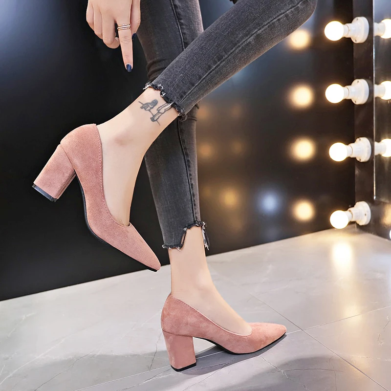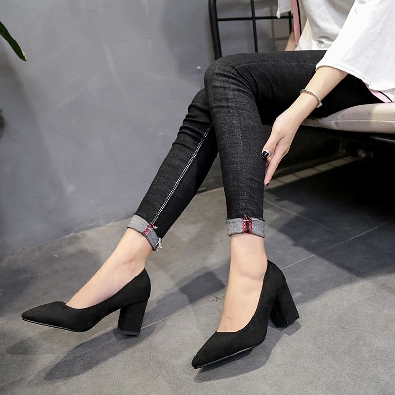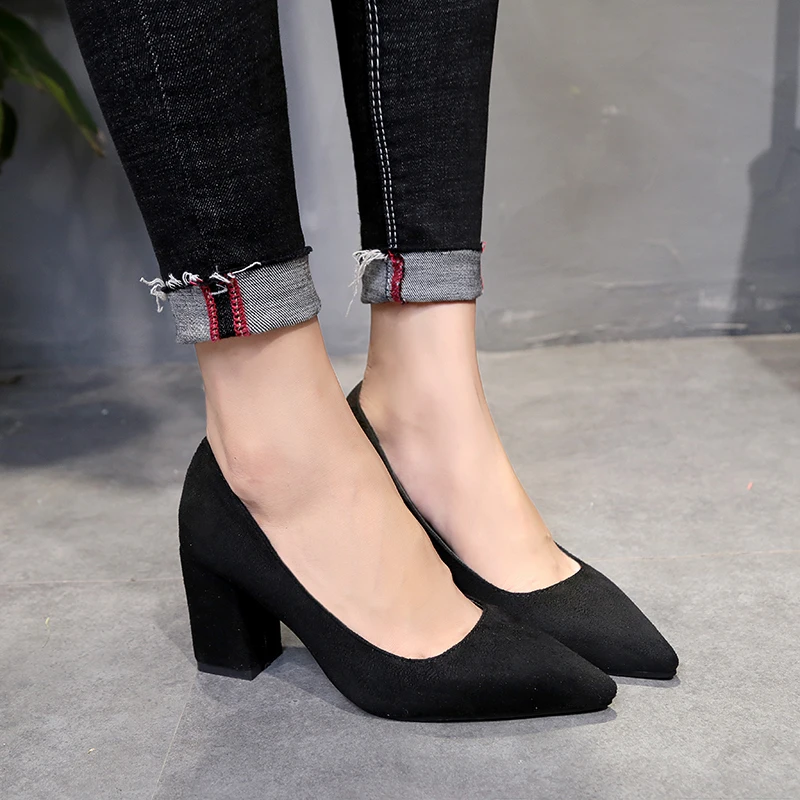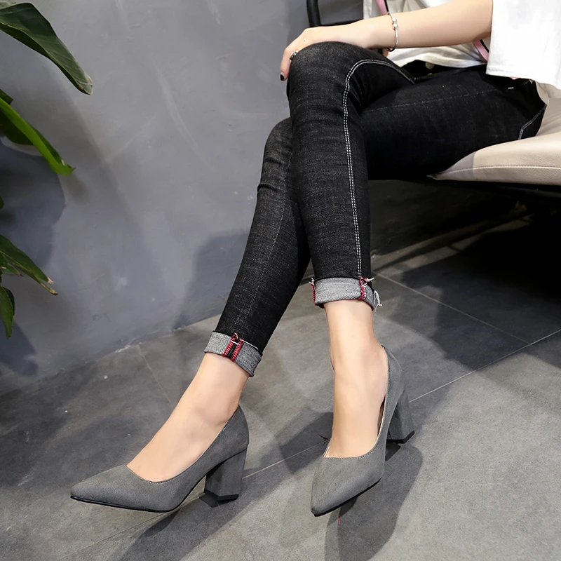 Aphixta Shoes Square Heel Women Pointed Toe Pumps Fashion Gray High Heels Flock Leather Black Party Shoes Plus Big size 47 48 50