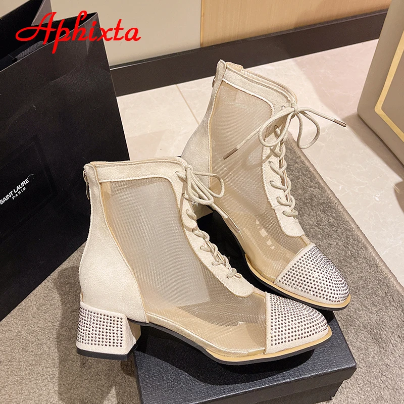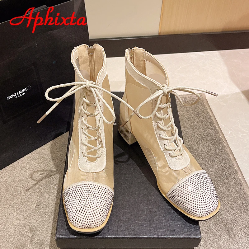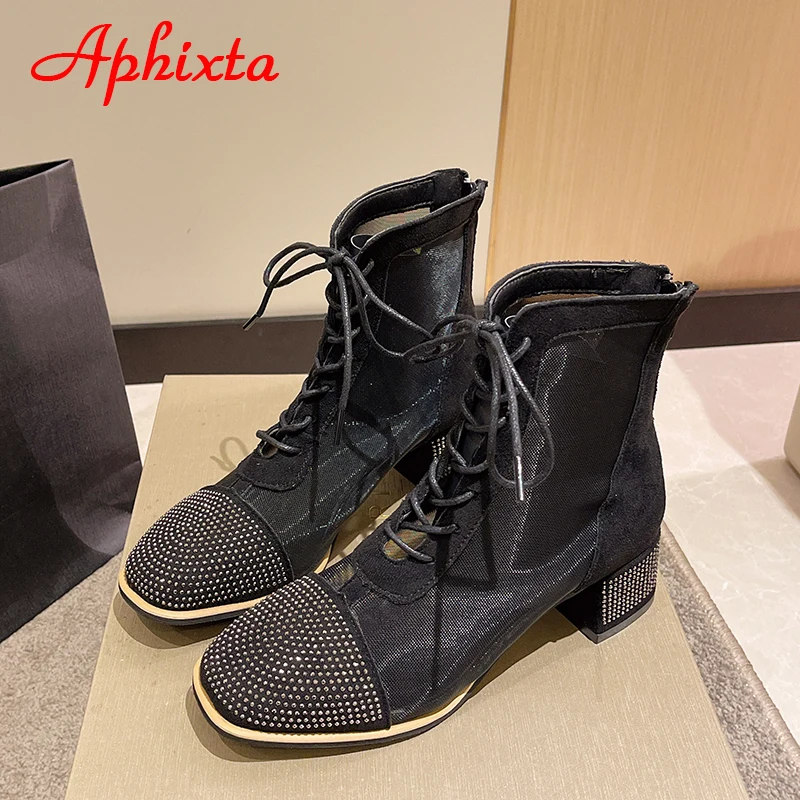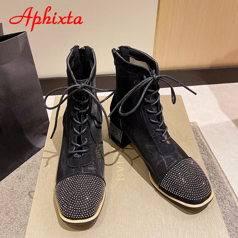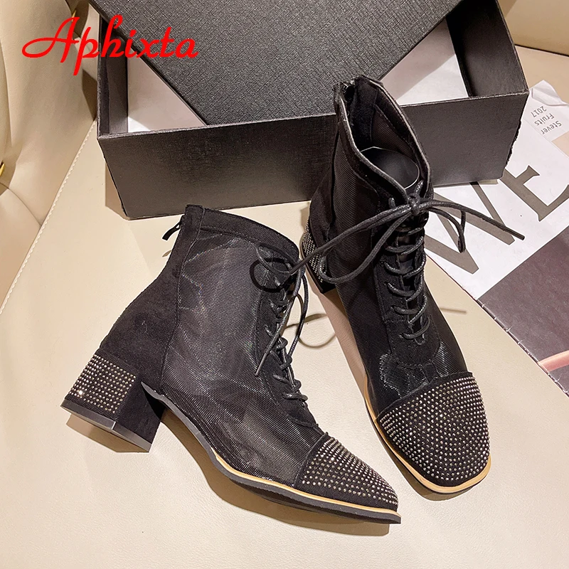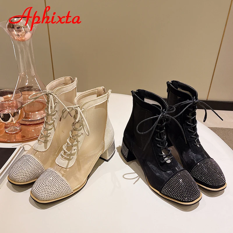 Aphixta Spring Crystals Air Breathable Ankle Boots Summer Lace-up Square Chunky Heels Women Back Zipper Boots Cool Big Size 42