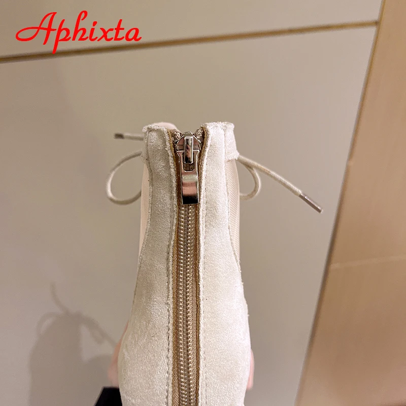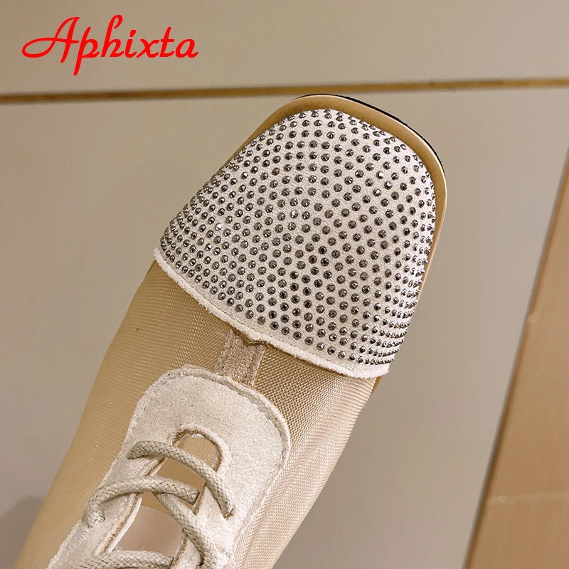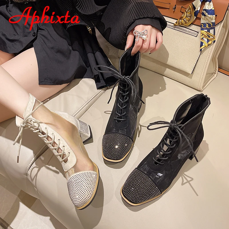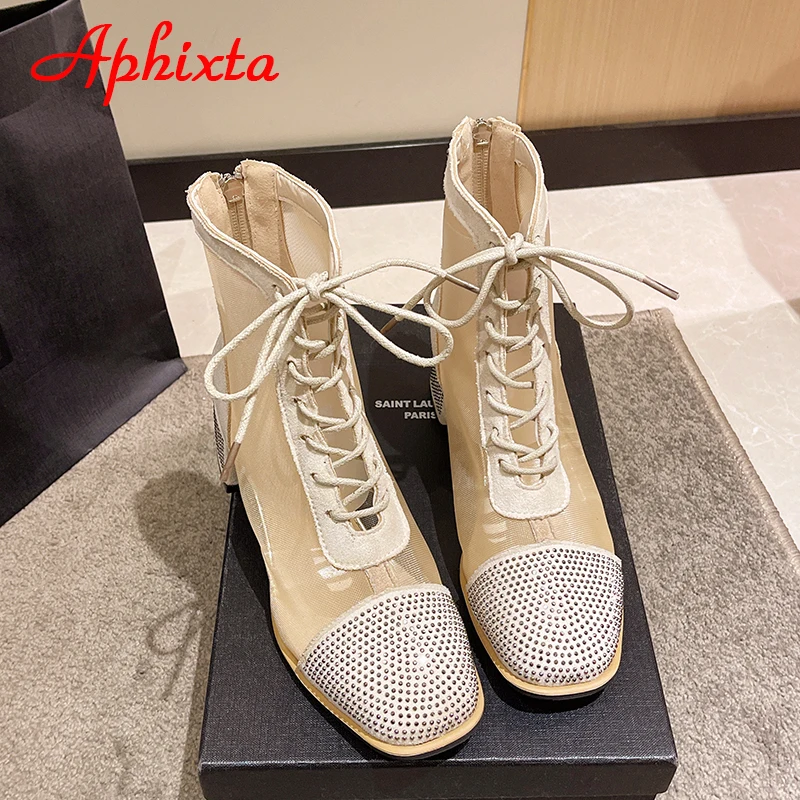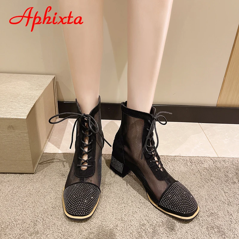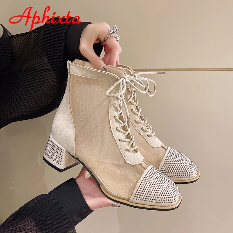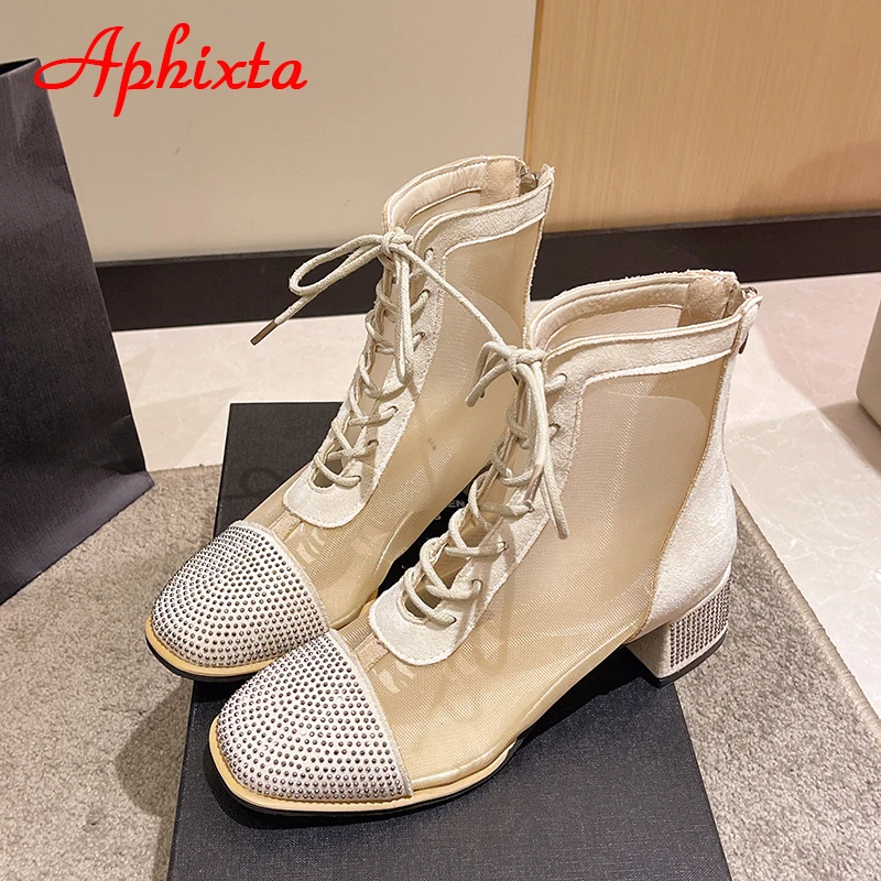 Aphixta Spring Crystals Air Breathable Ankle Boots Summer Lace-up Square Chunky Heels Women Back Zipper Boots Cool Big Size 42