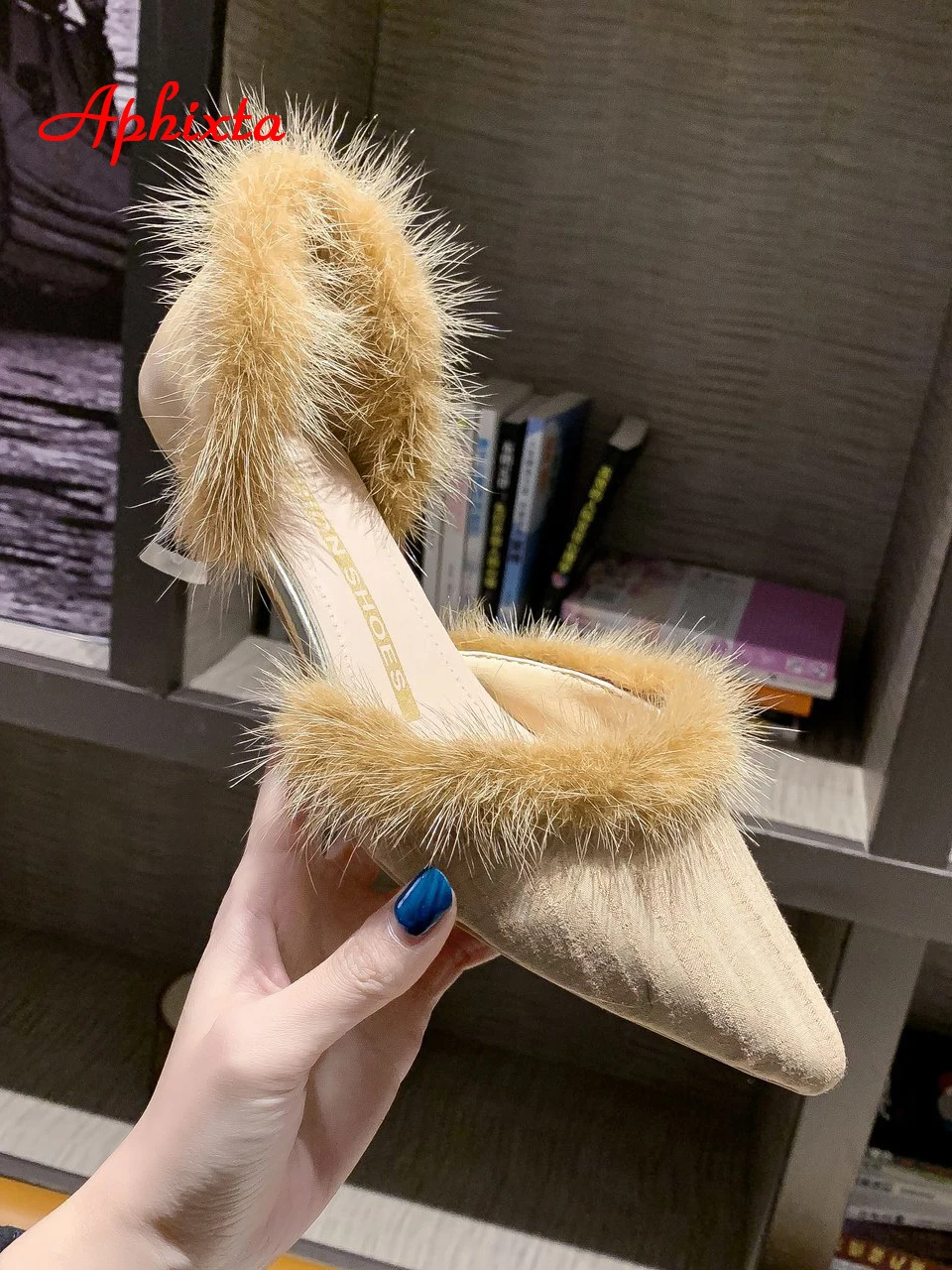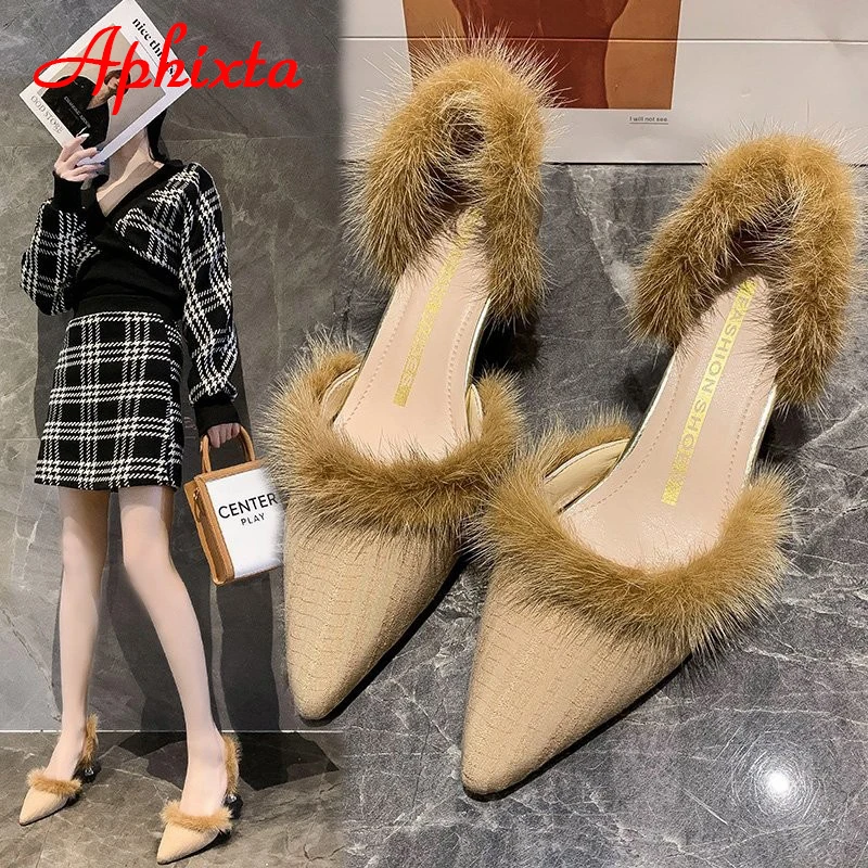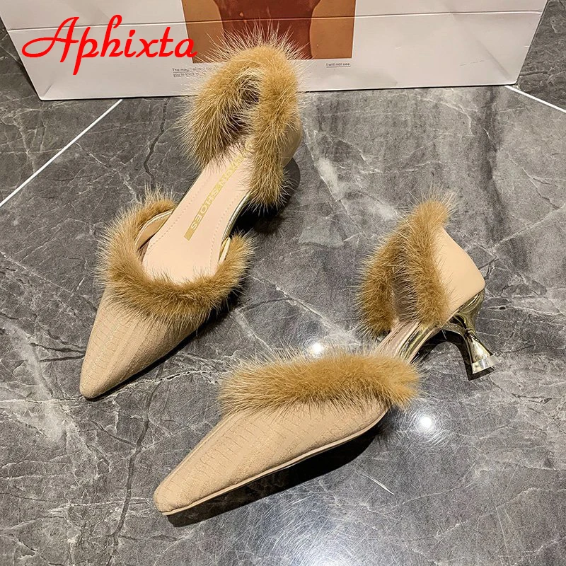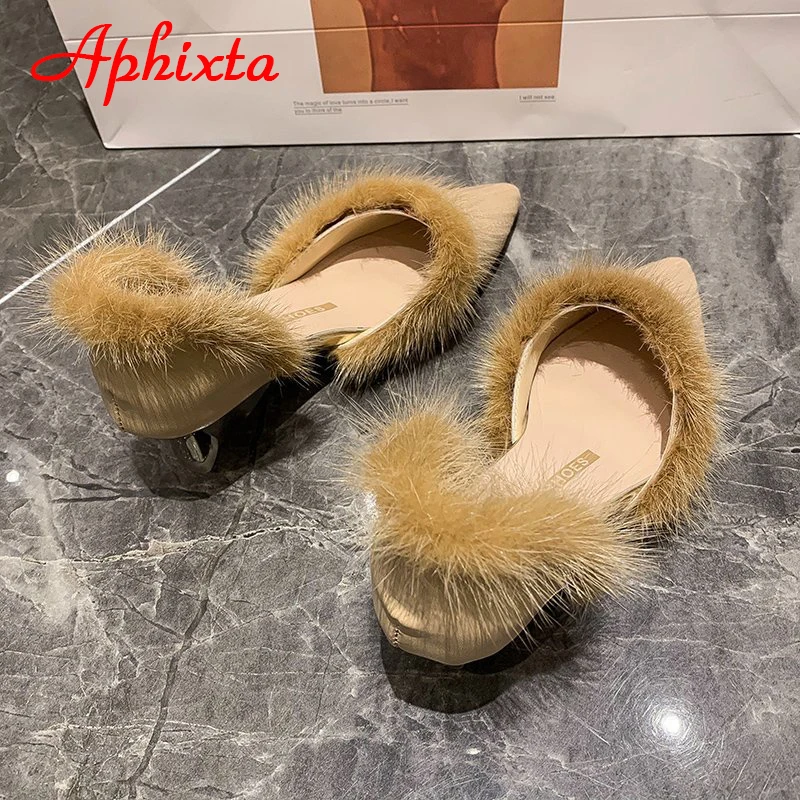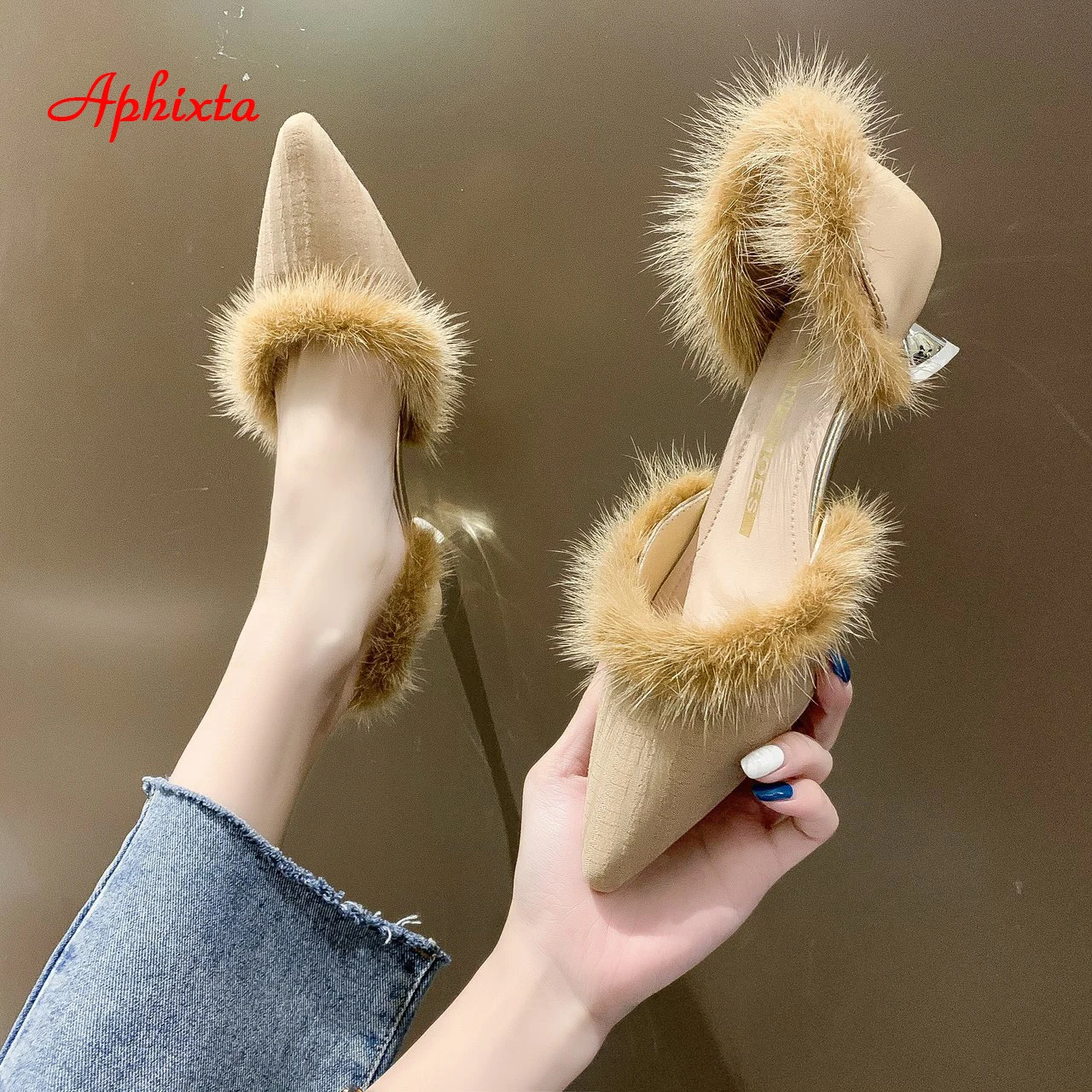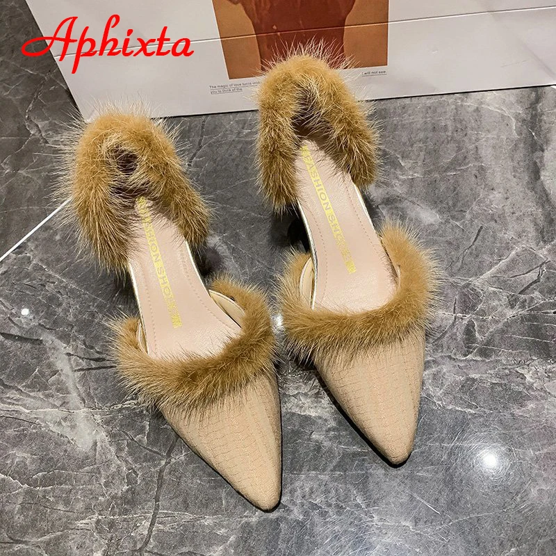 Aphixta Spring Real Fur Women Pumps Casual Office Lady Shoes Pointed Toe Thin Heel Party Shoes Shallow Elegant Summer Heels