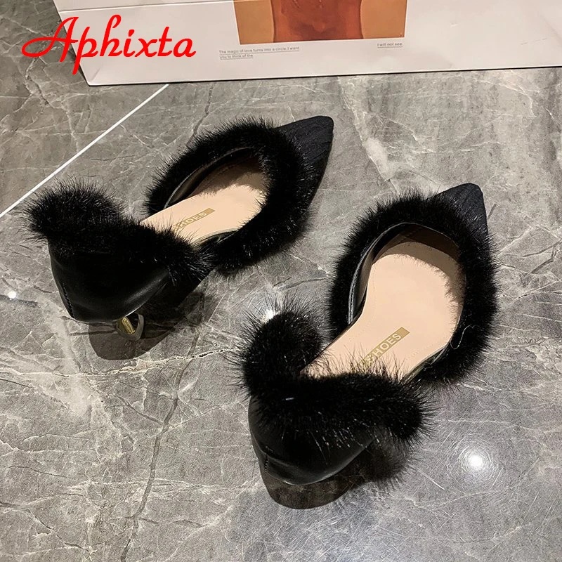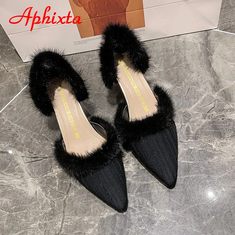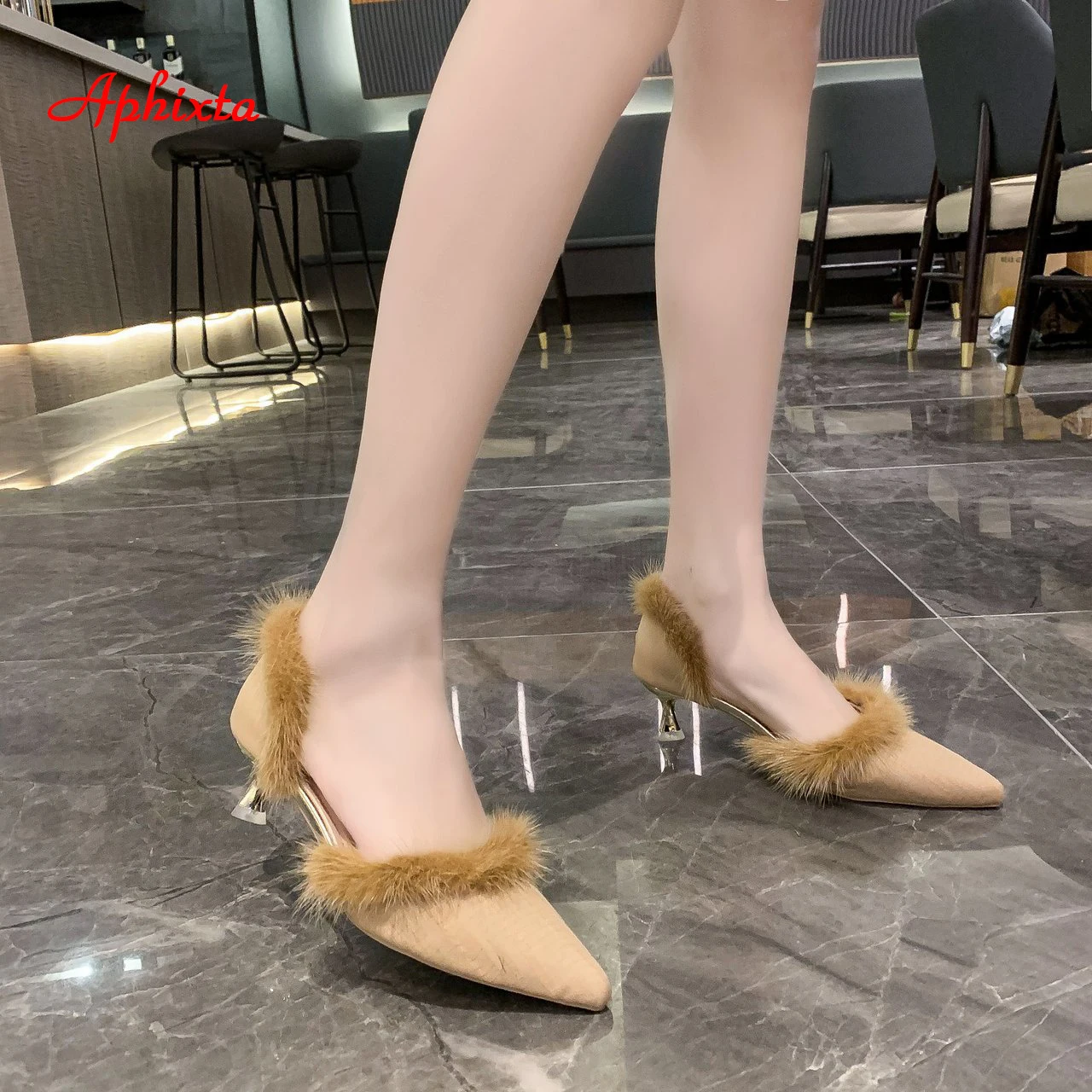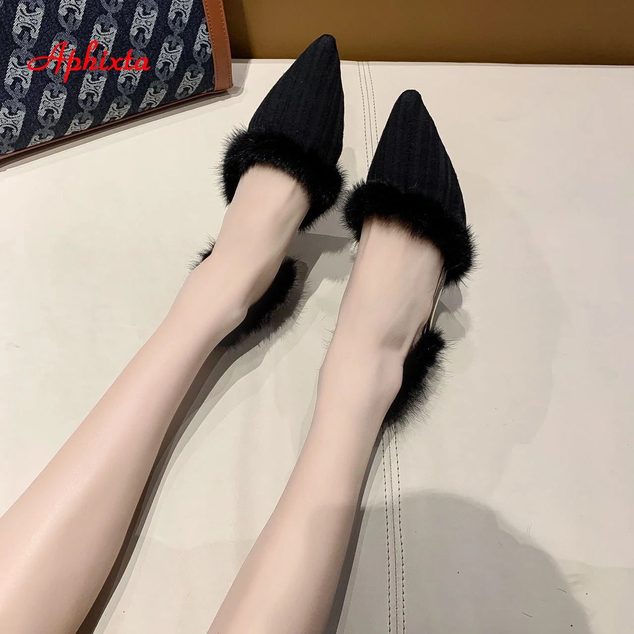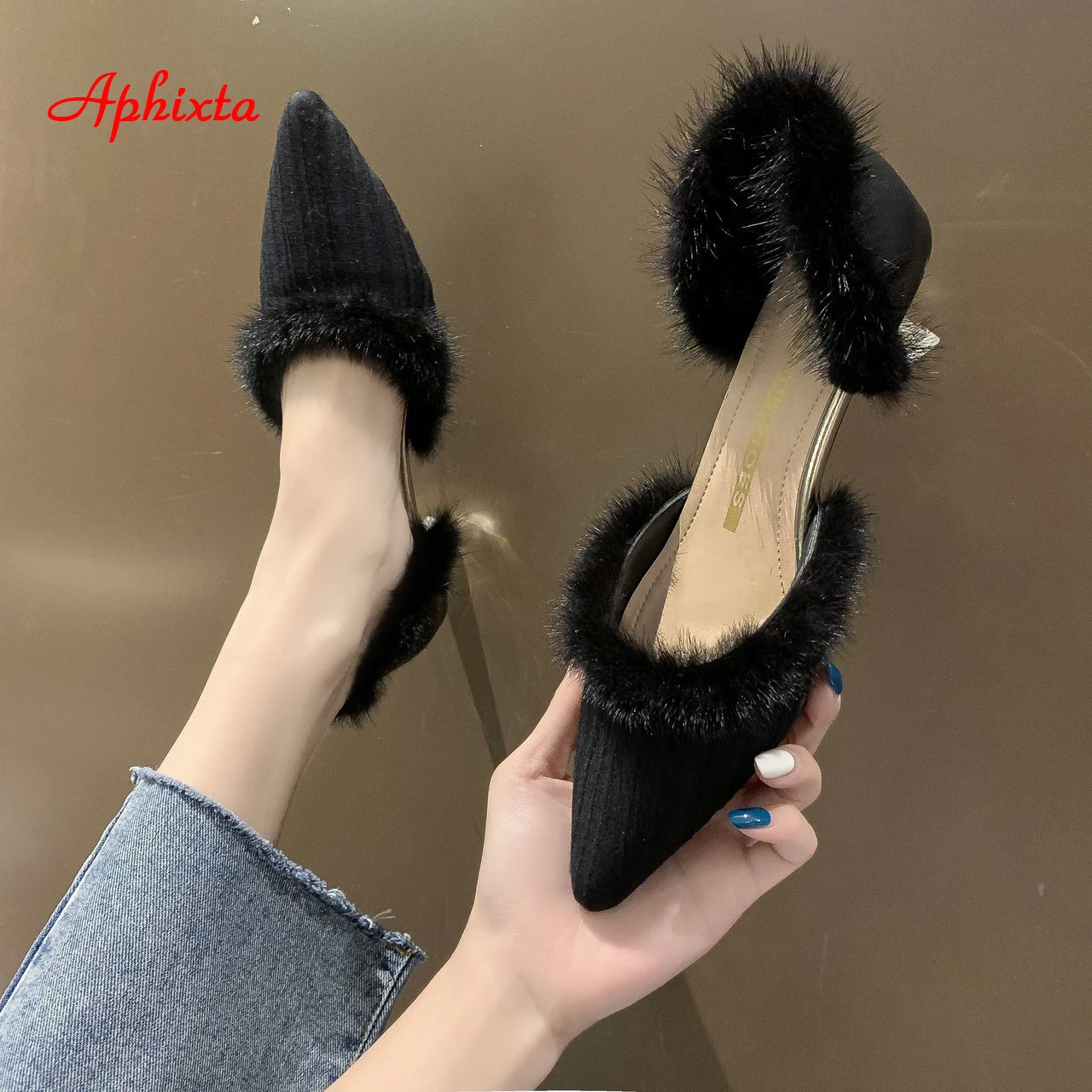 Aphixta Spring Real Fur Women Pumps Casual Office Lady Shoes Pointed Toe Thin Heel Party Shoes Shallow Elegant Summer Heels