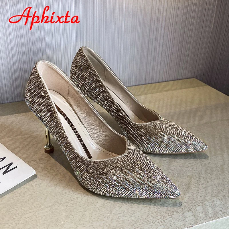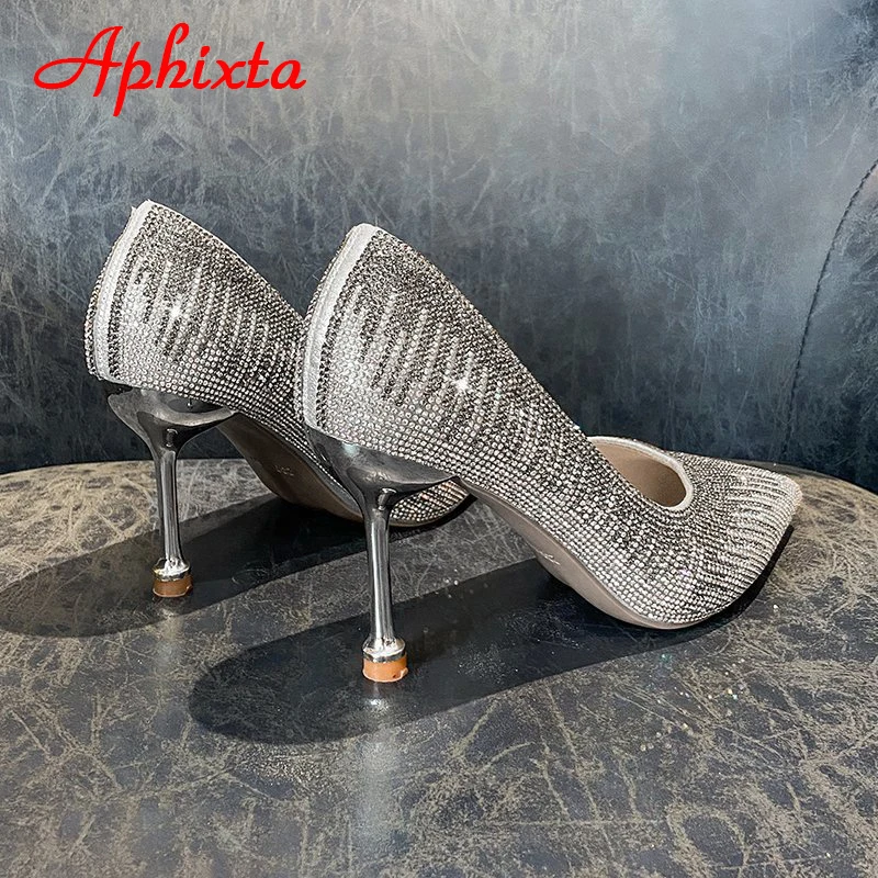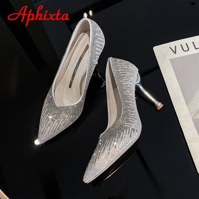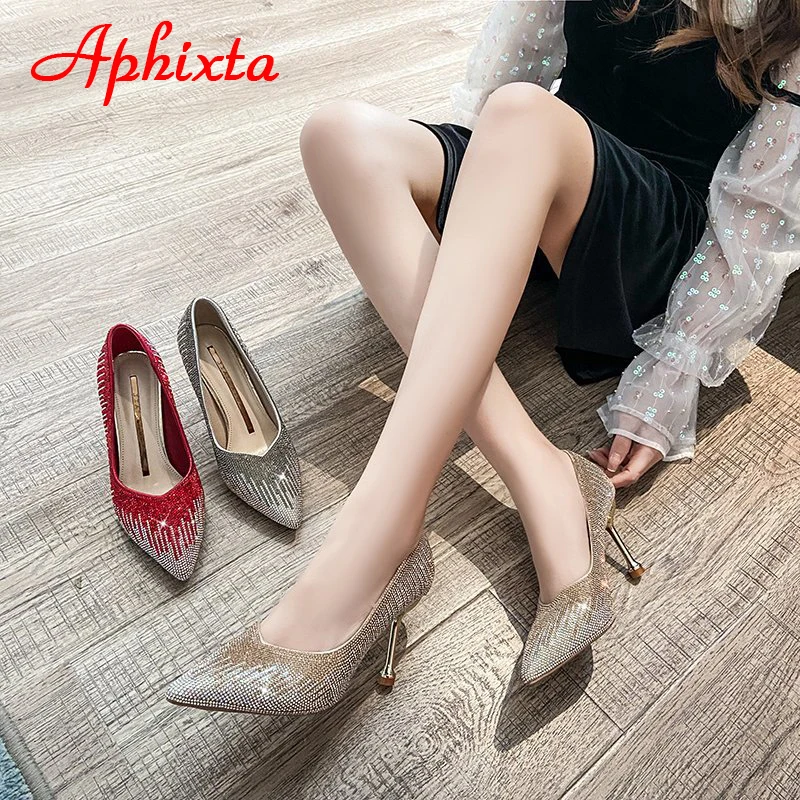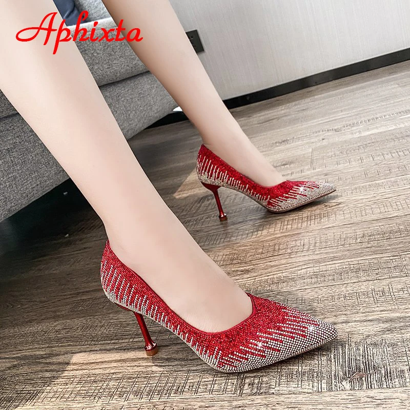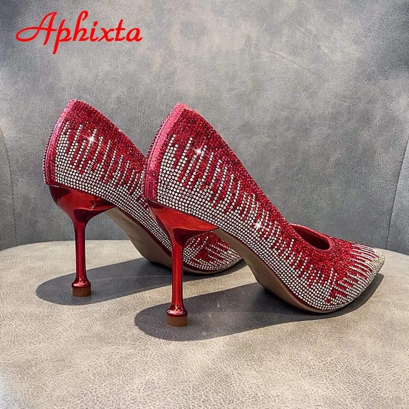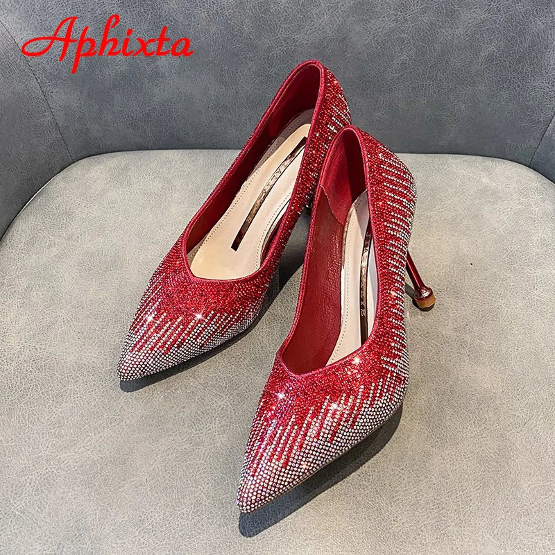 Aphixta Spring Summer Crystal Luxury Design 9cm Women Thin Heels Pumps Red Pointed Toe Official Dress Weding Bling Elegant Shoes