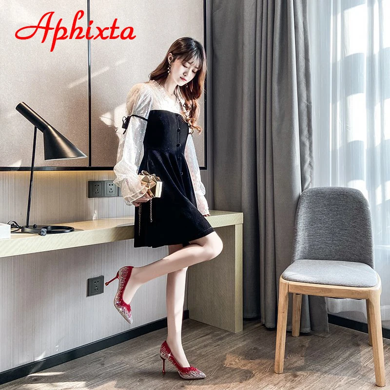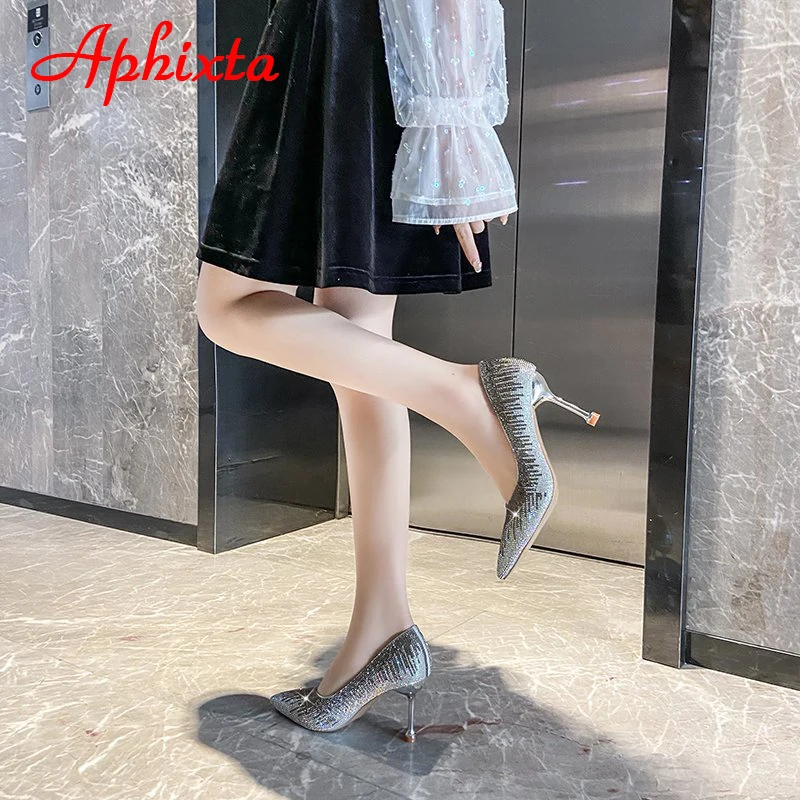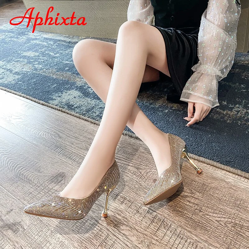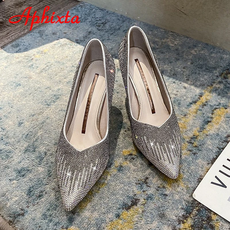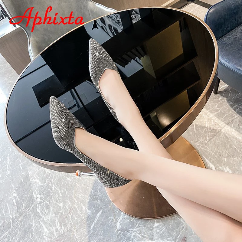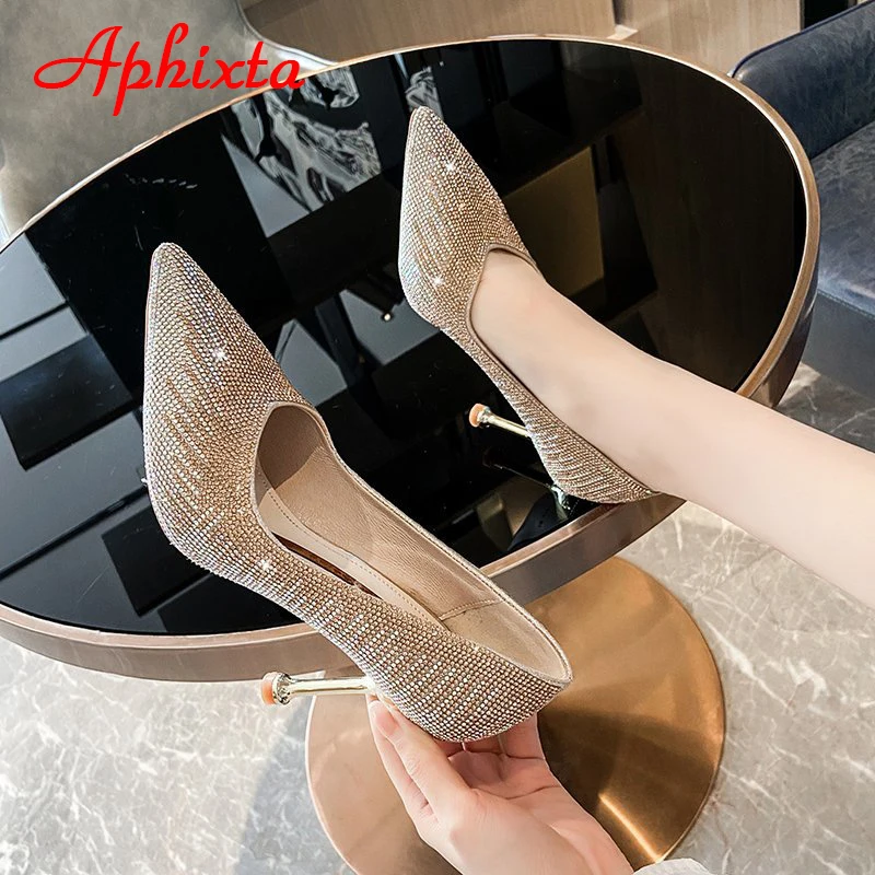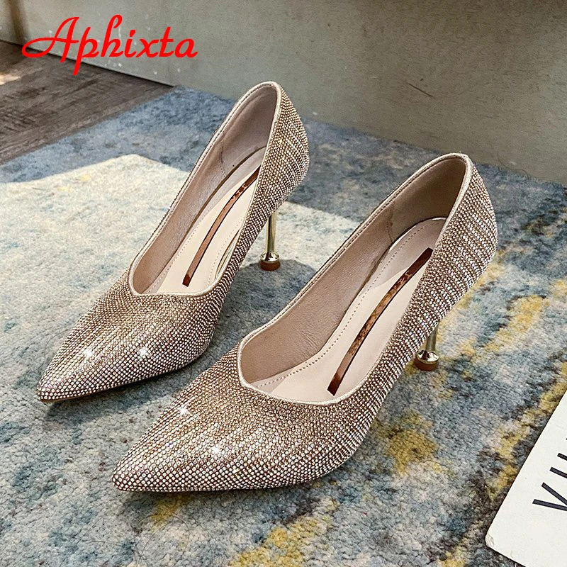 Aphixta Spring Summer Crystal Luxury Design 9cm Women Thin Heels Pumps Red Pointed Toe Official Dress Weding Bling Elegant Shoes