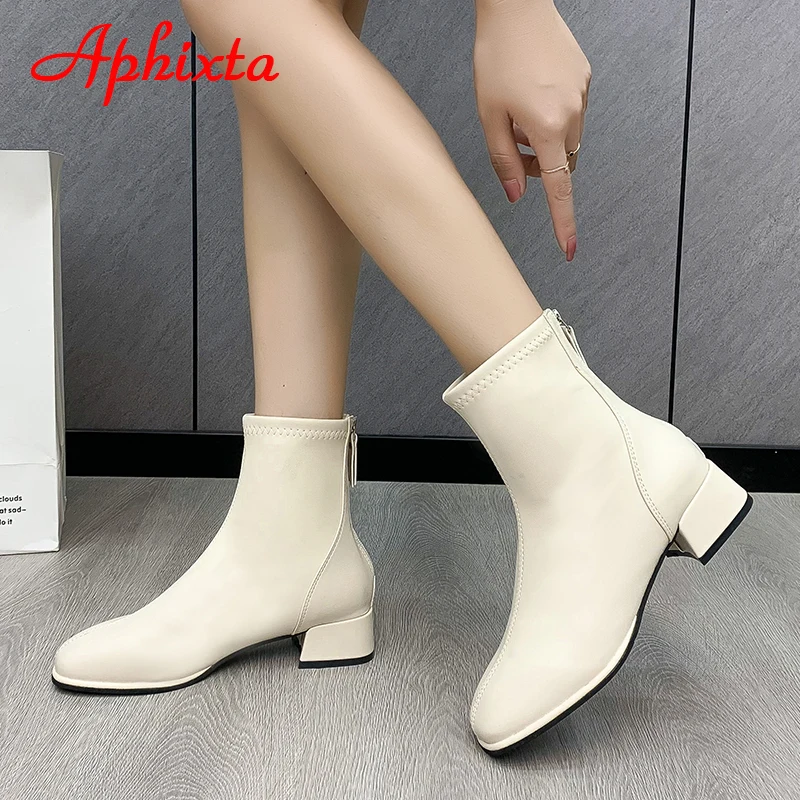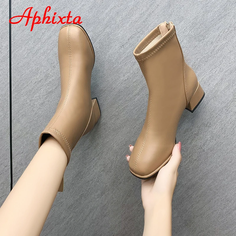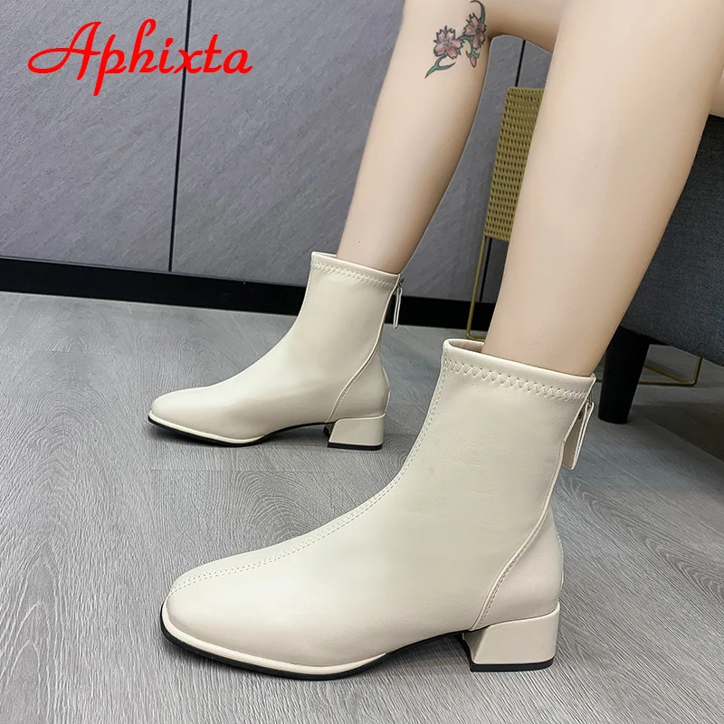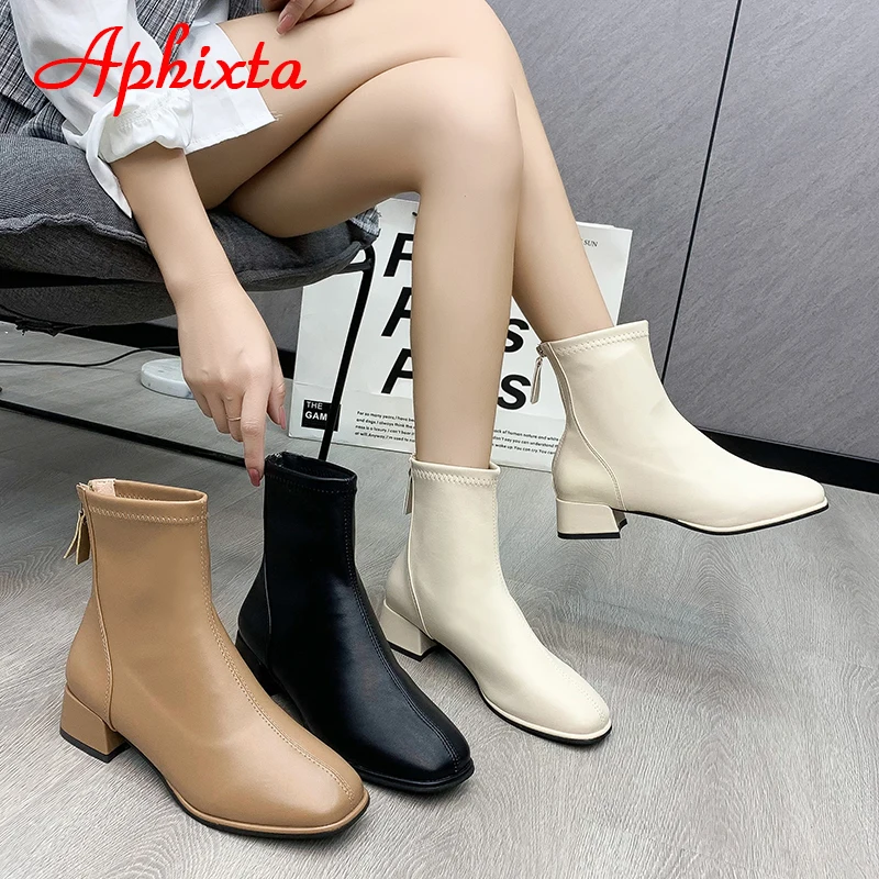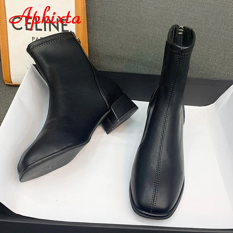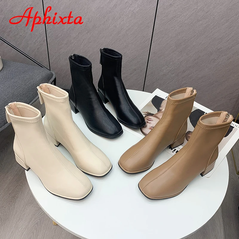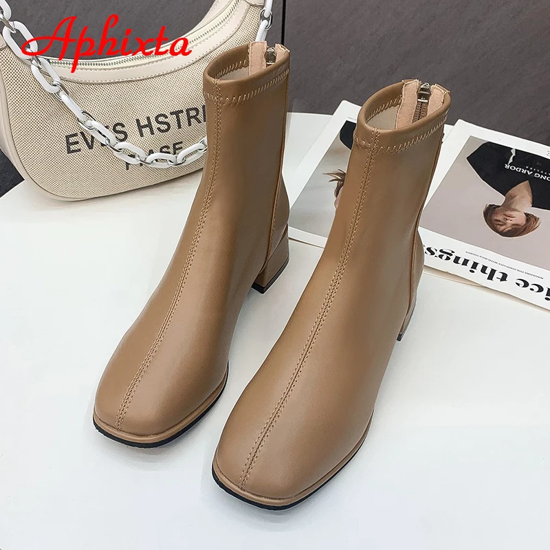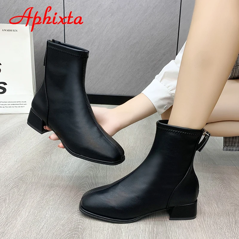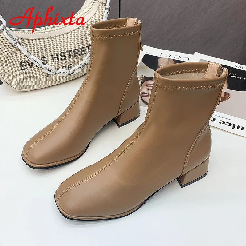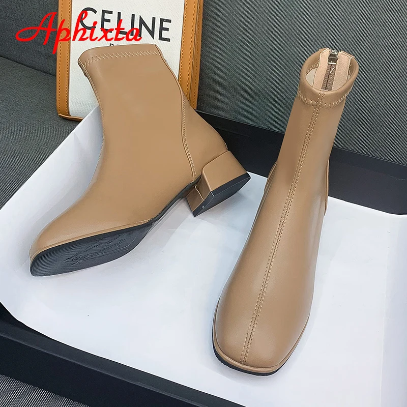 Aphixta Square Toe Ankle Boots Women Fashion Brown Plus Size 42 43 Leather Zip Lady Footwear Casual Shoes