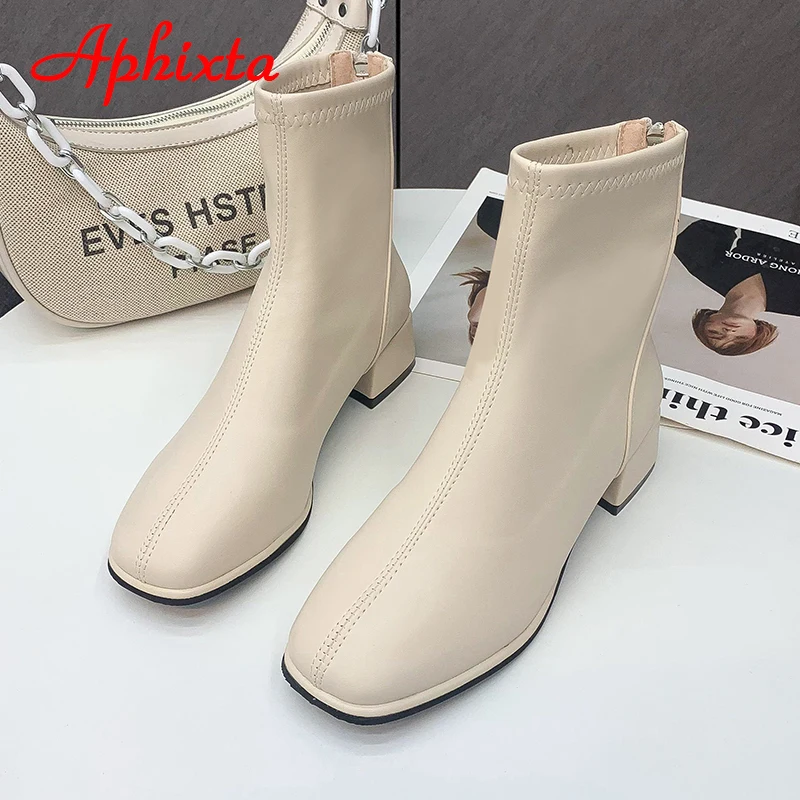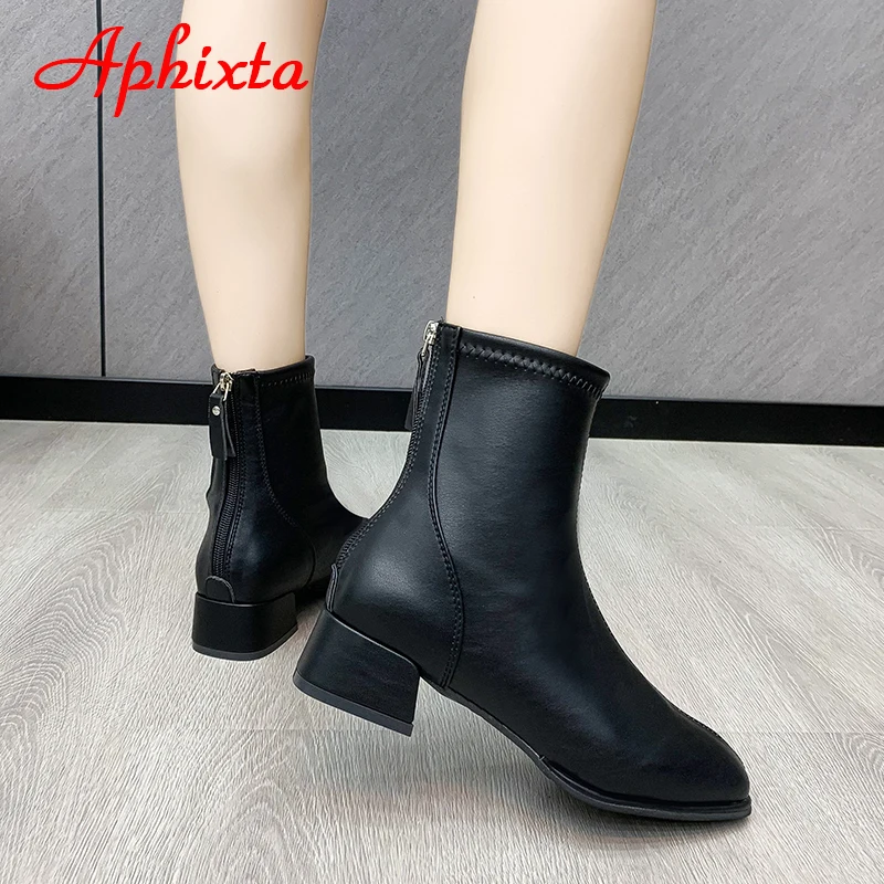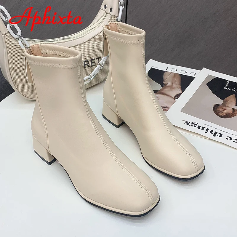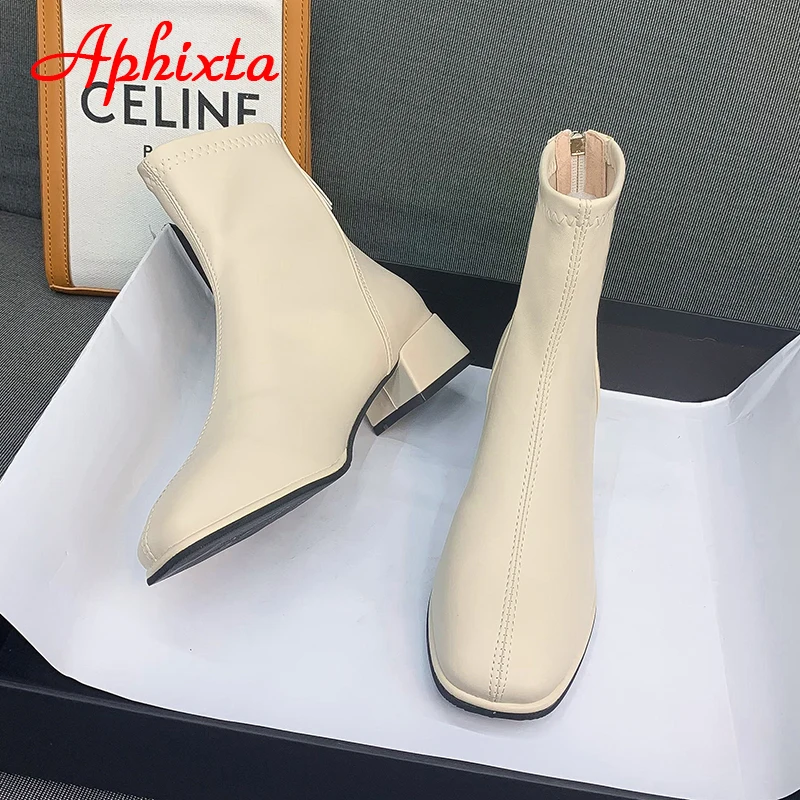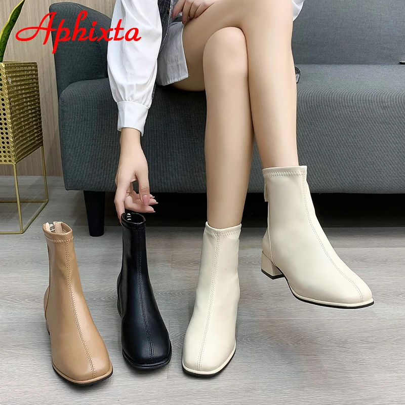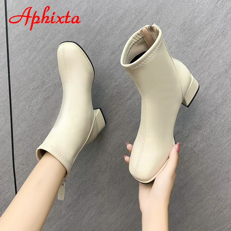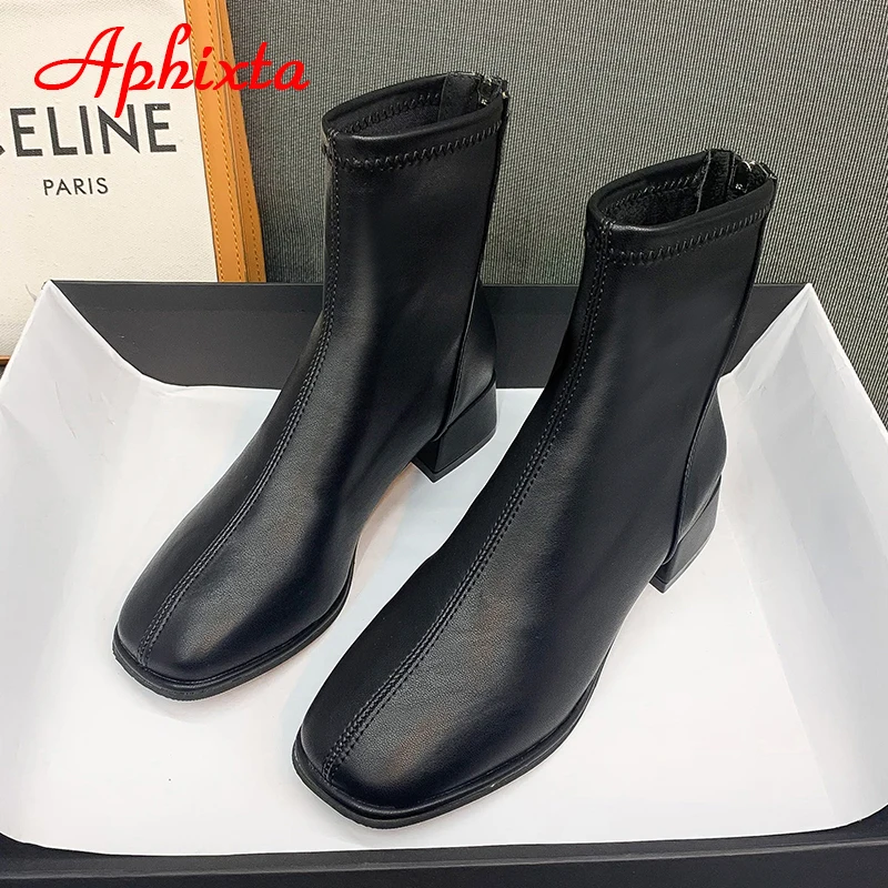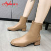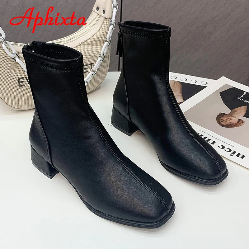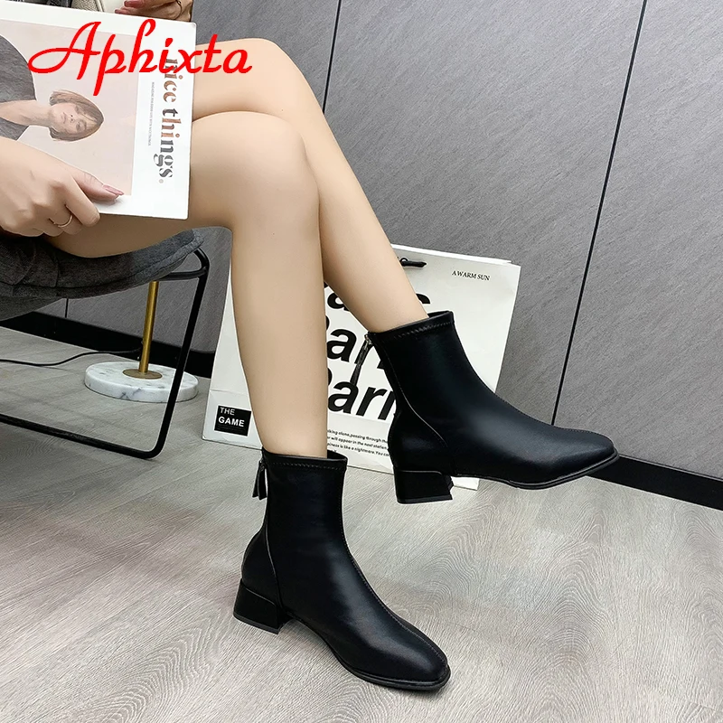 Aphixta Square Toe Ankle Boots Women Fashion Brown Plus Size 42 43 Leather Zip Lady Footwear Casual Shoes