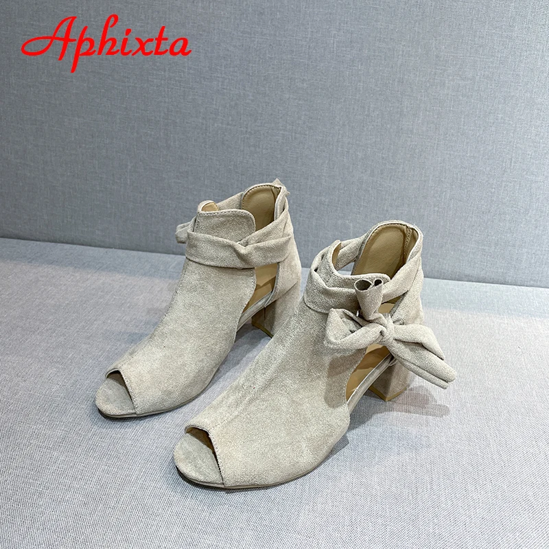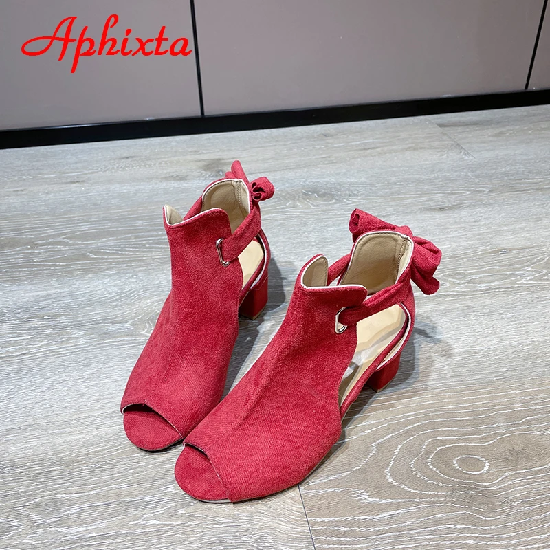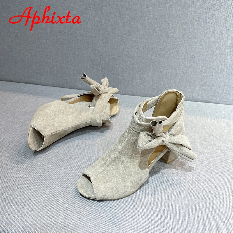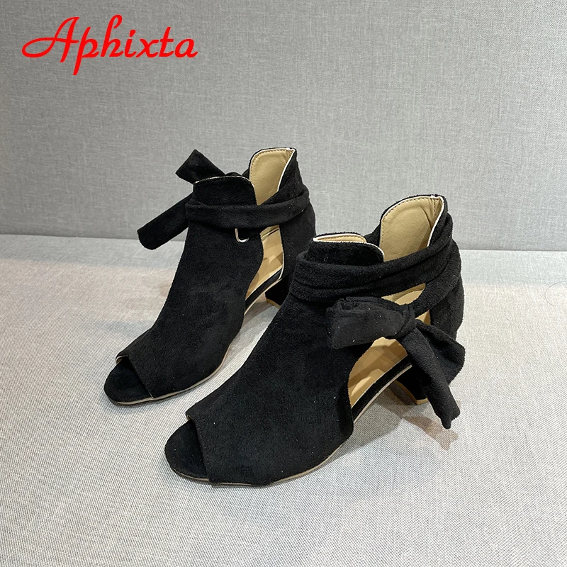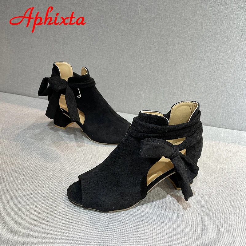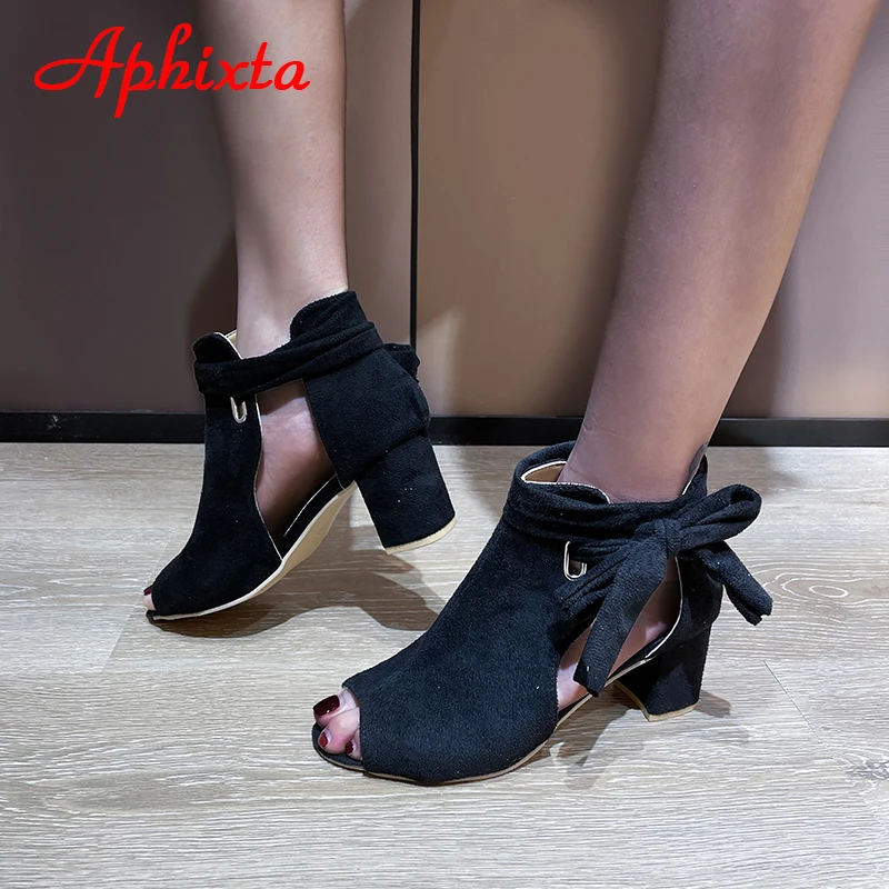 Aphixta Summer Peep Toe Cool Women Boots Sandals Lace-up Square Heels Narrow Band Rosette Shoes Plus Size 43