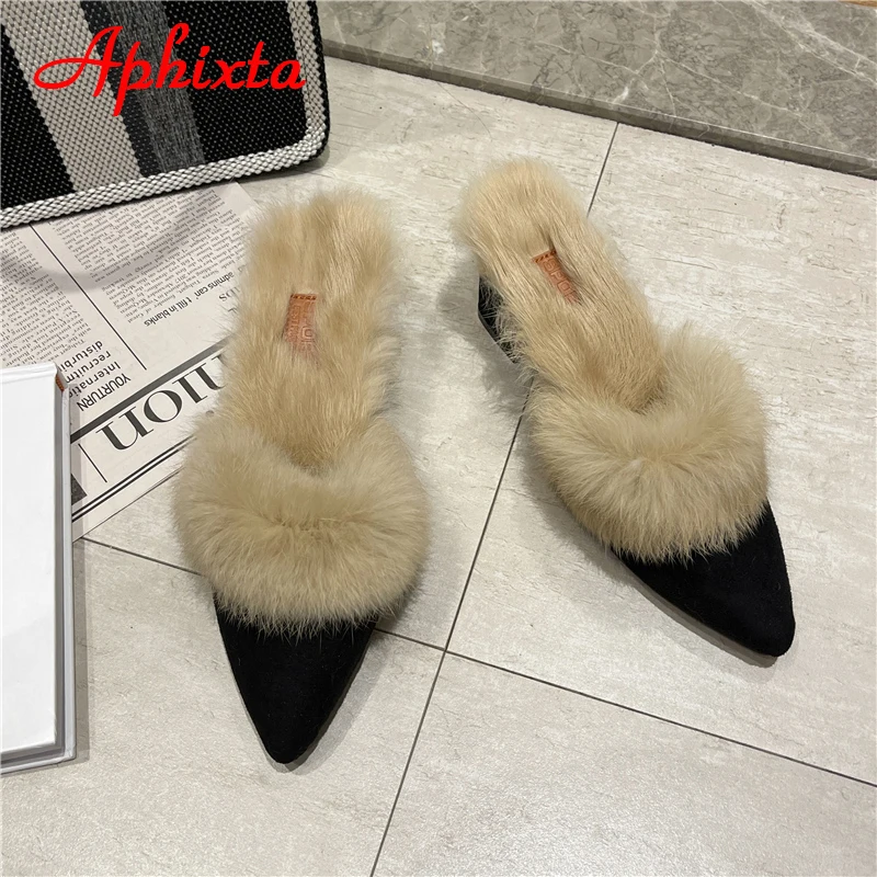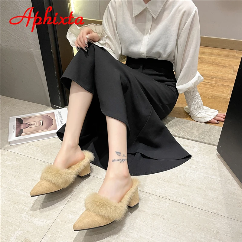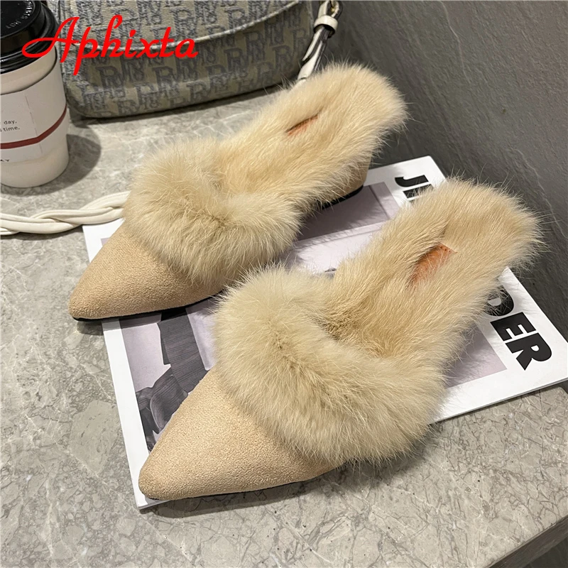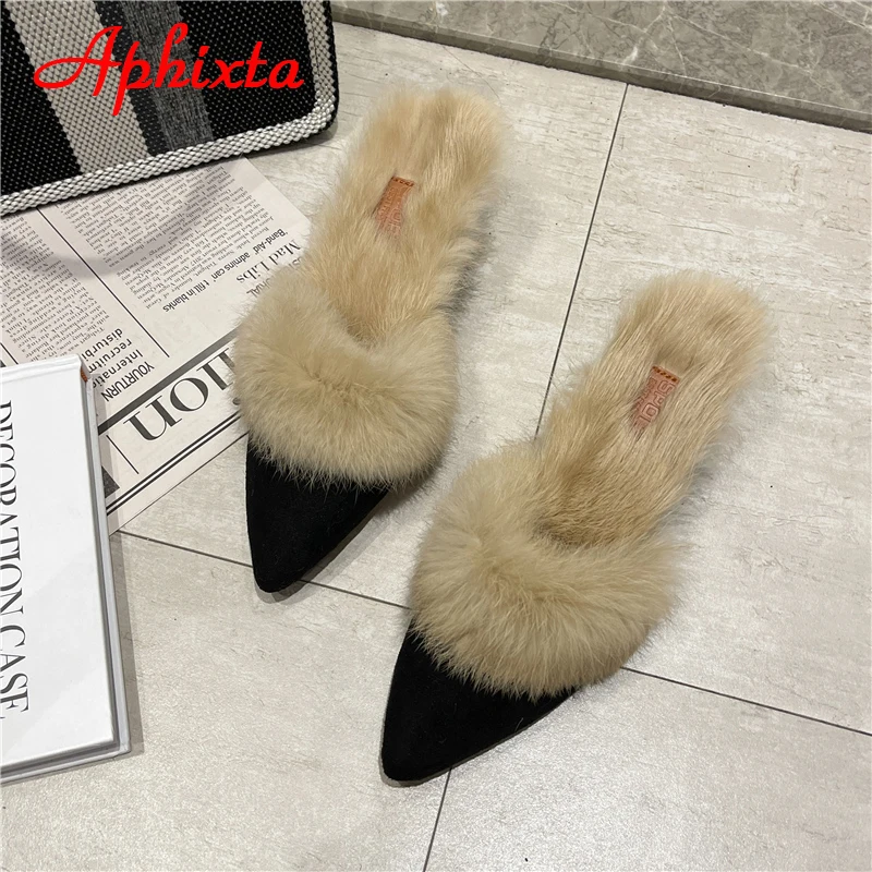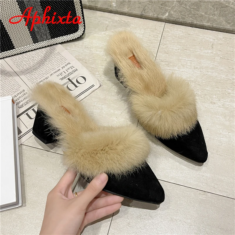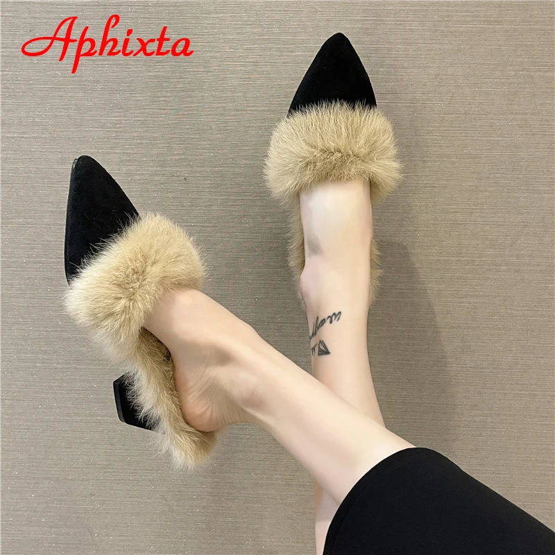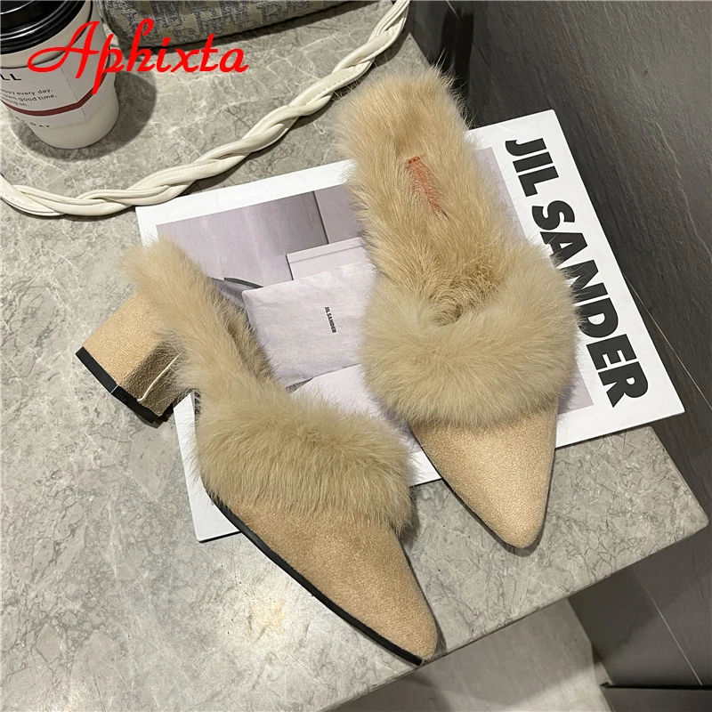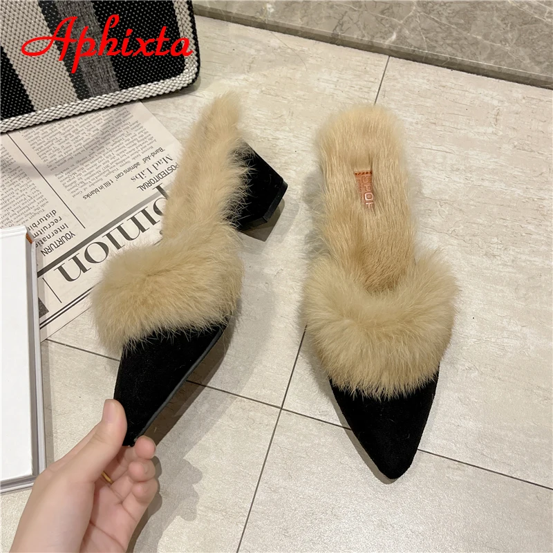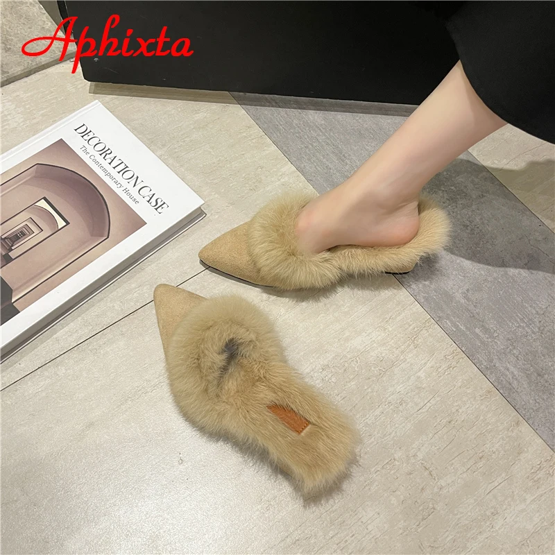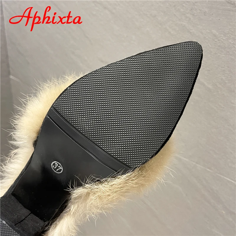 Aphixta Warm Real Rabbit Hair Slippers Women Shoes Winter Pointed Toe Luxury Real Fur Square Heel Lady Mujer Indoor Slides