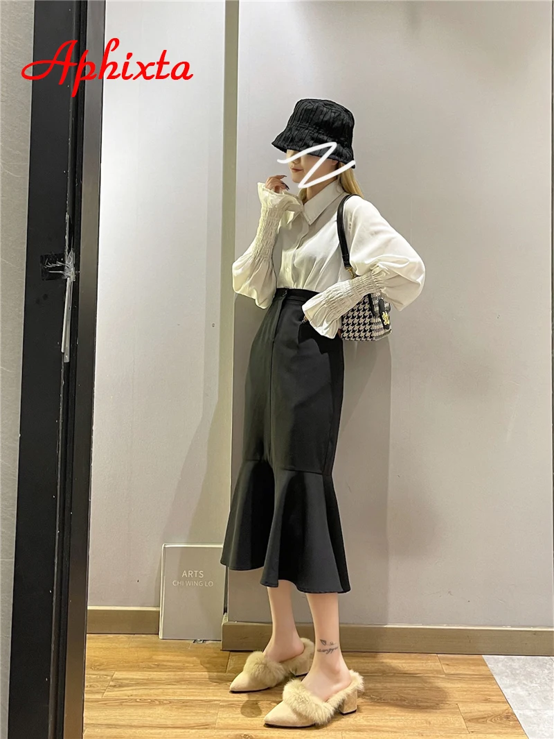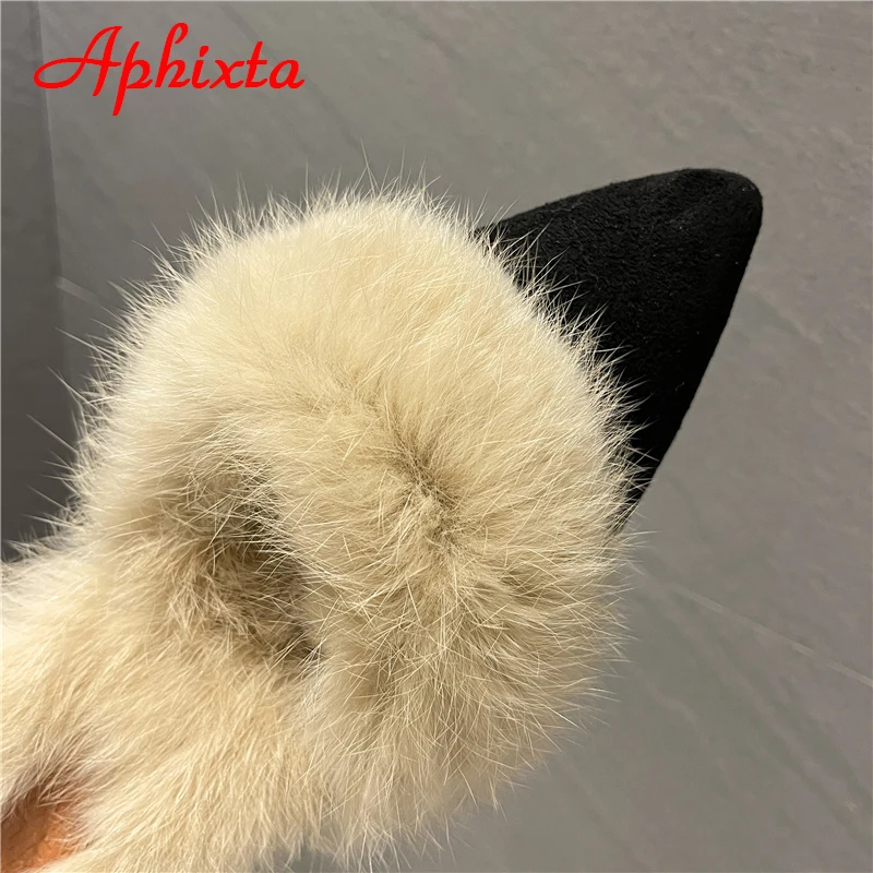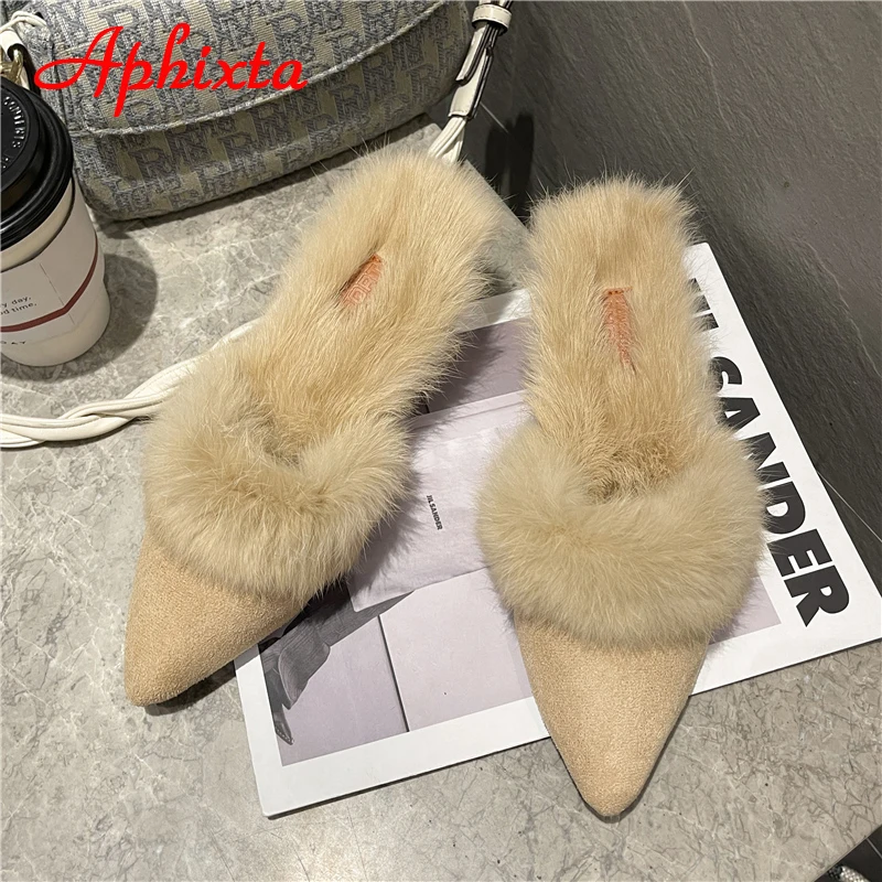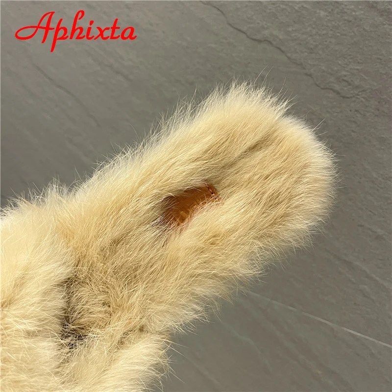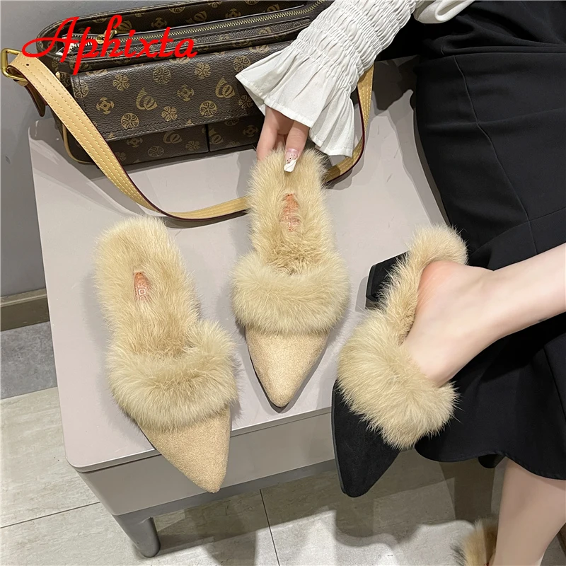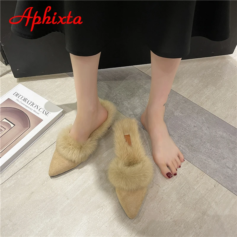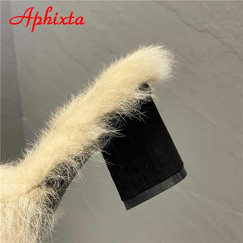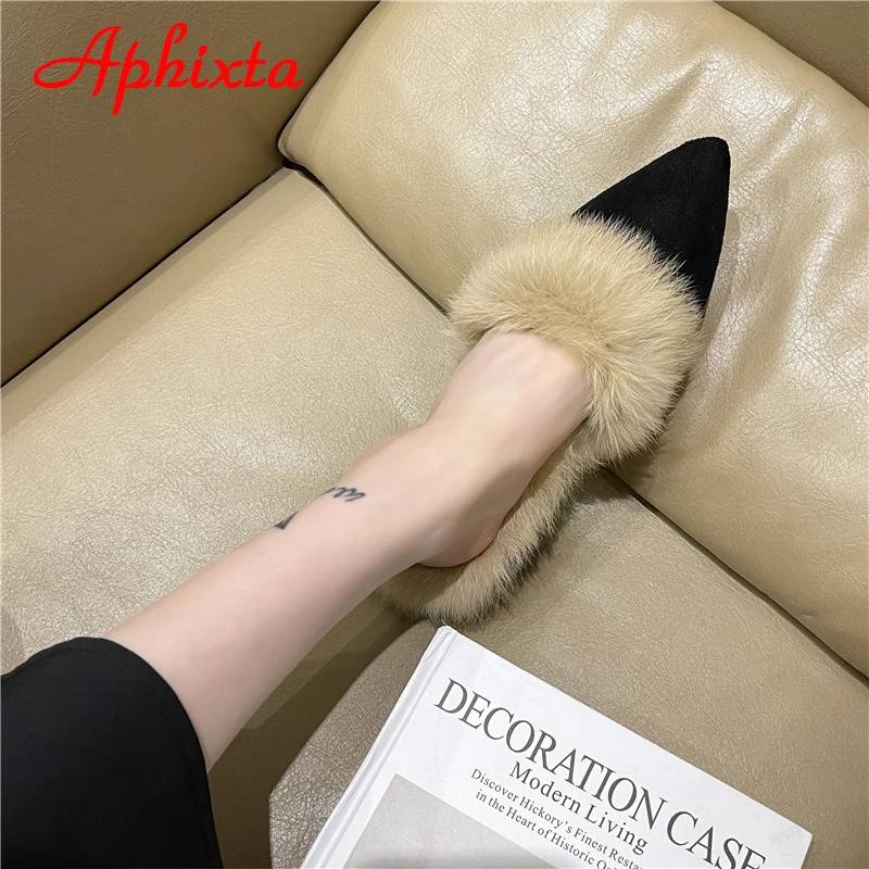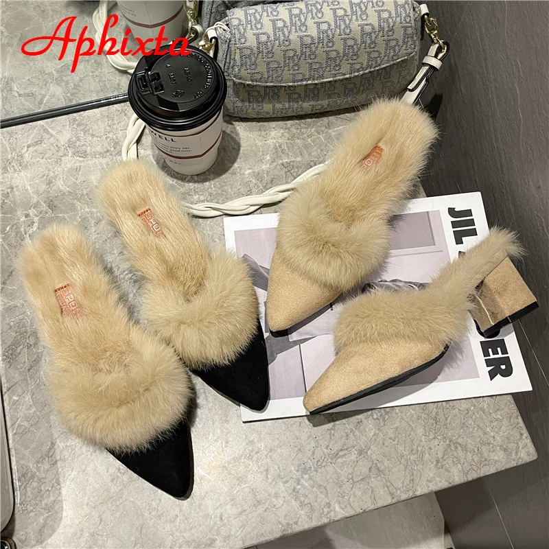 Aphixta Warm Real Rabbit Hair Slippers Women Shoes Winter Pointed Toe Luxury Real Fur Square Heel Lady Mujer Indoor Slides