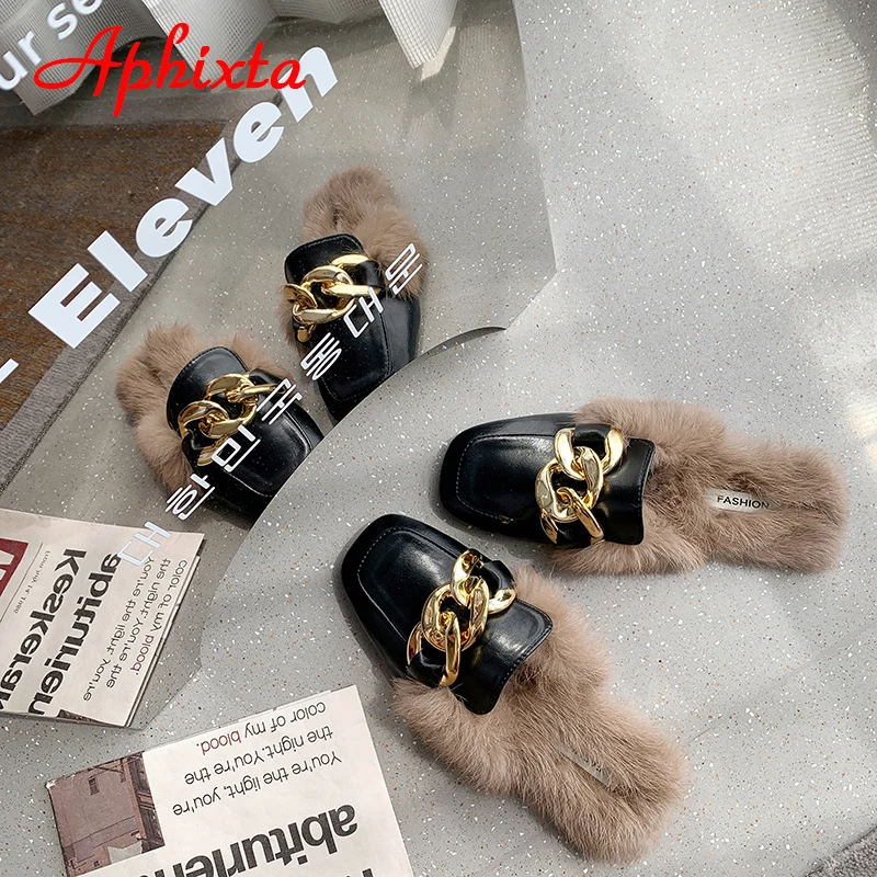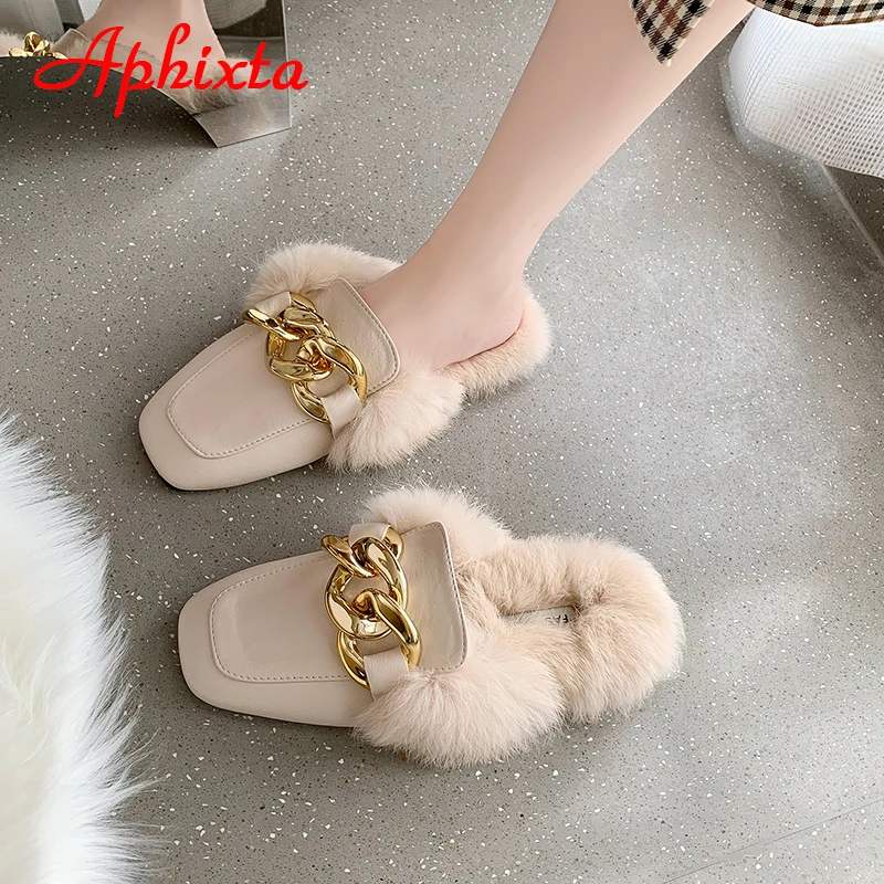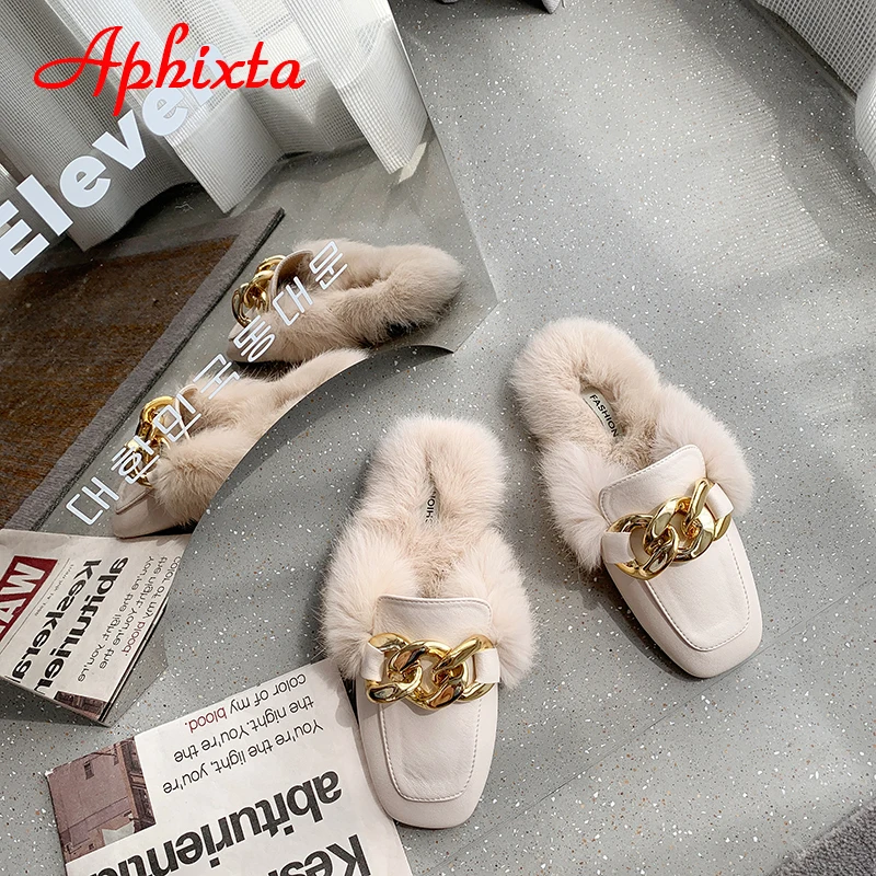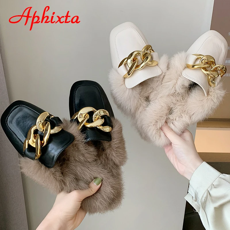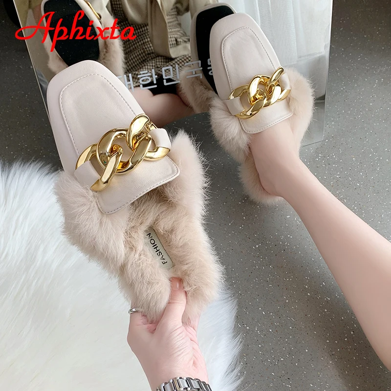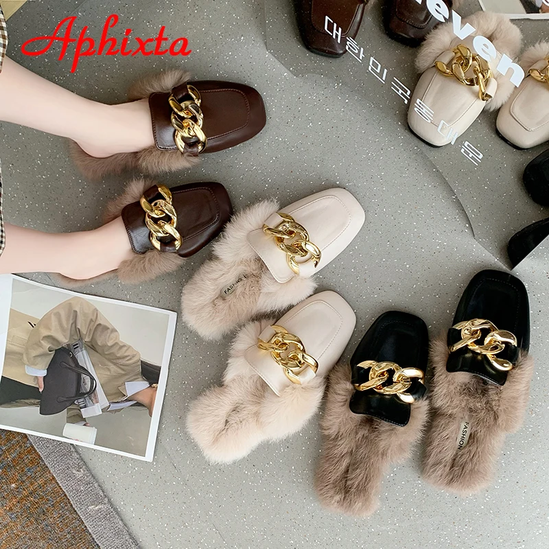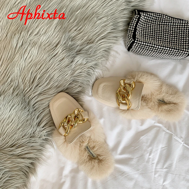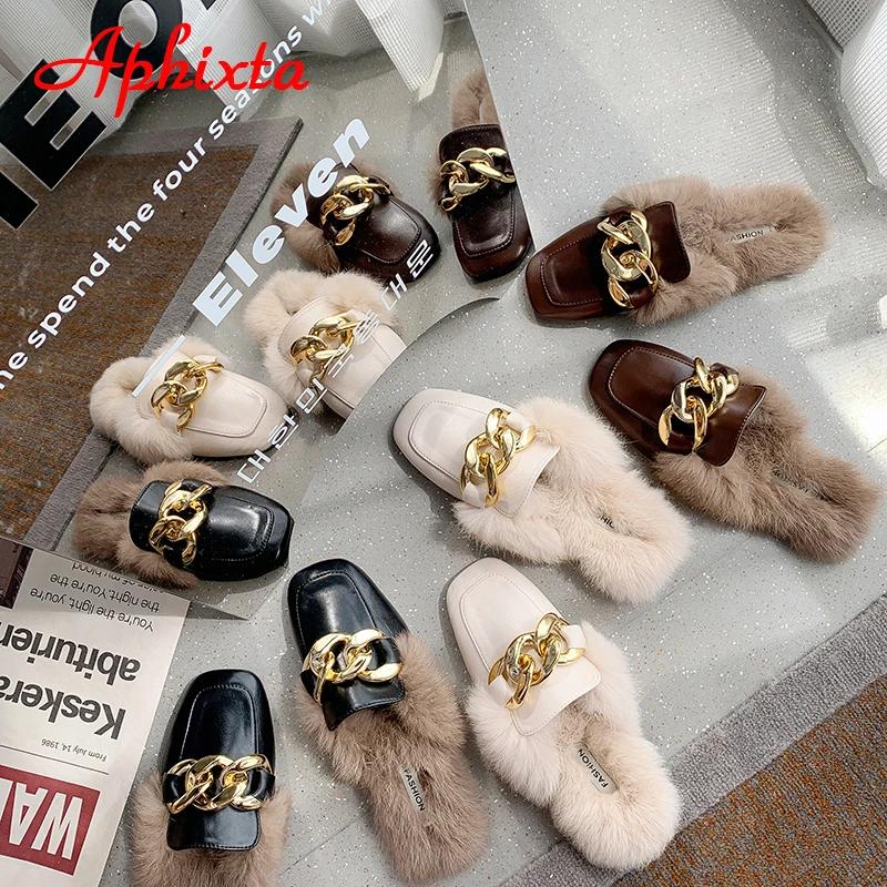 Aphixta Winter Big Chain Long Real Rabbit Fur Plush Women Slippers Nature Warm Furry Shoes Square Toe Flat Heel Hair Slides
