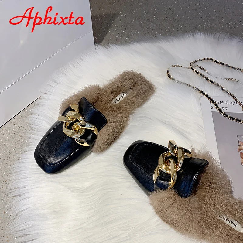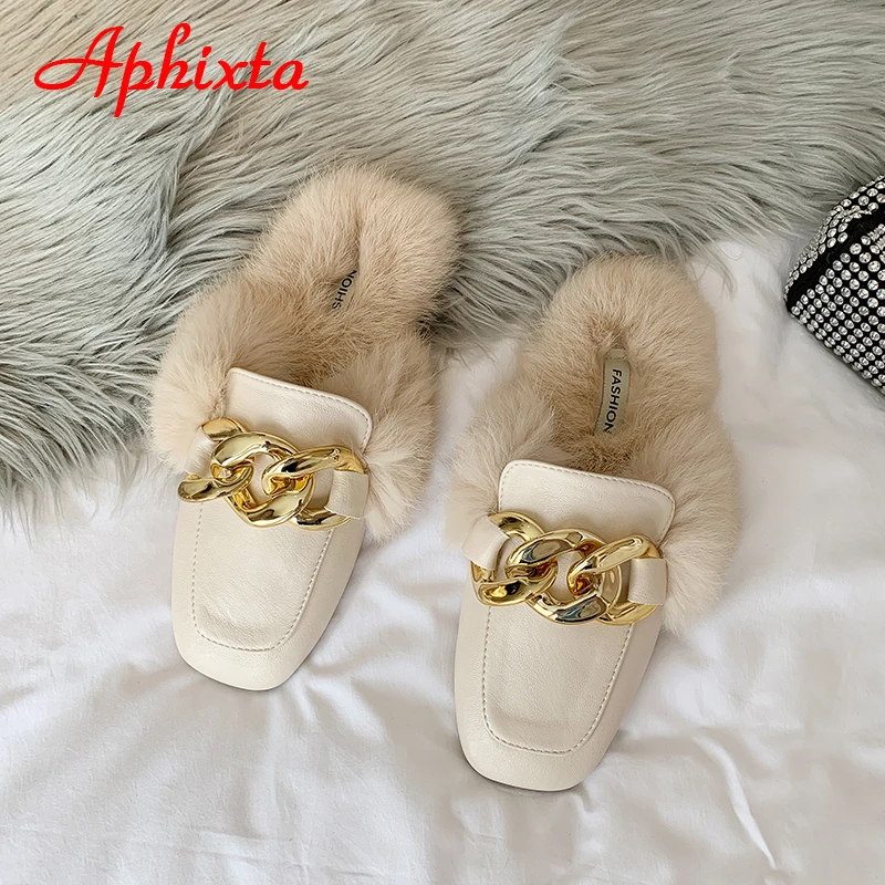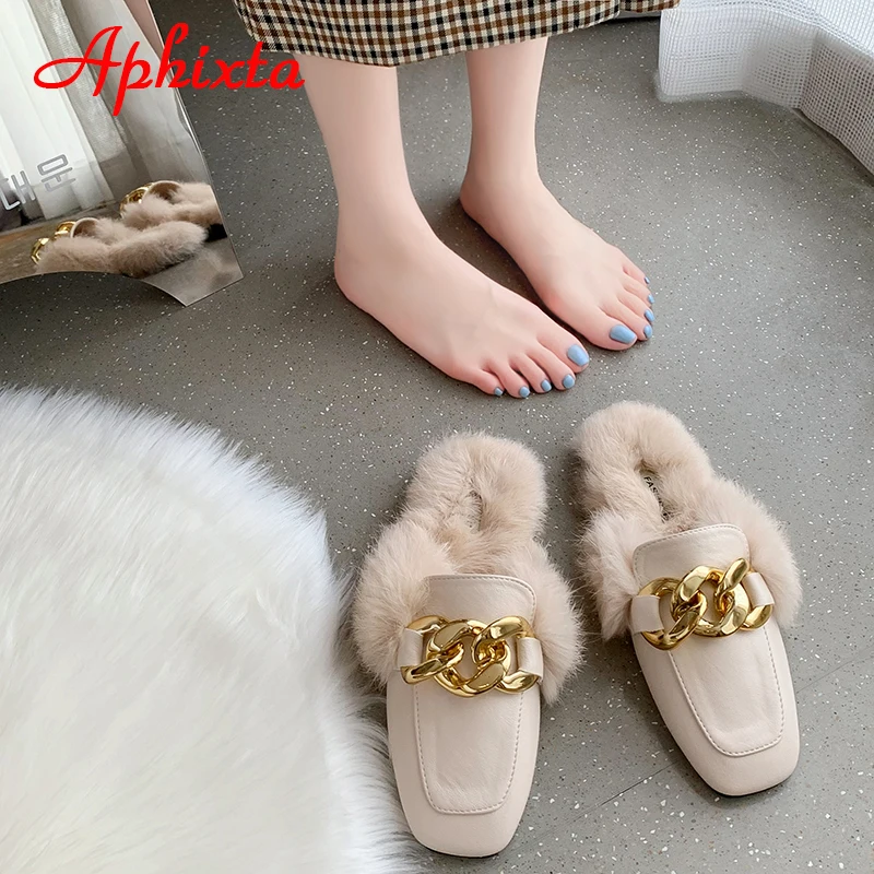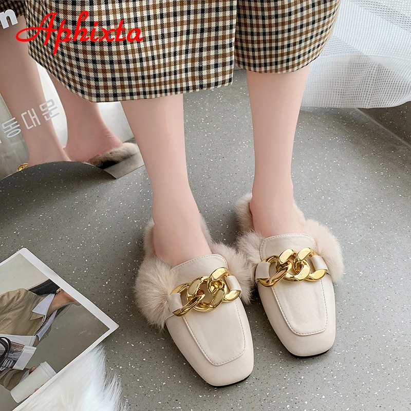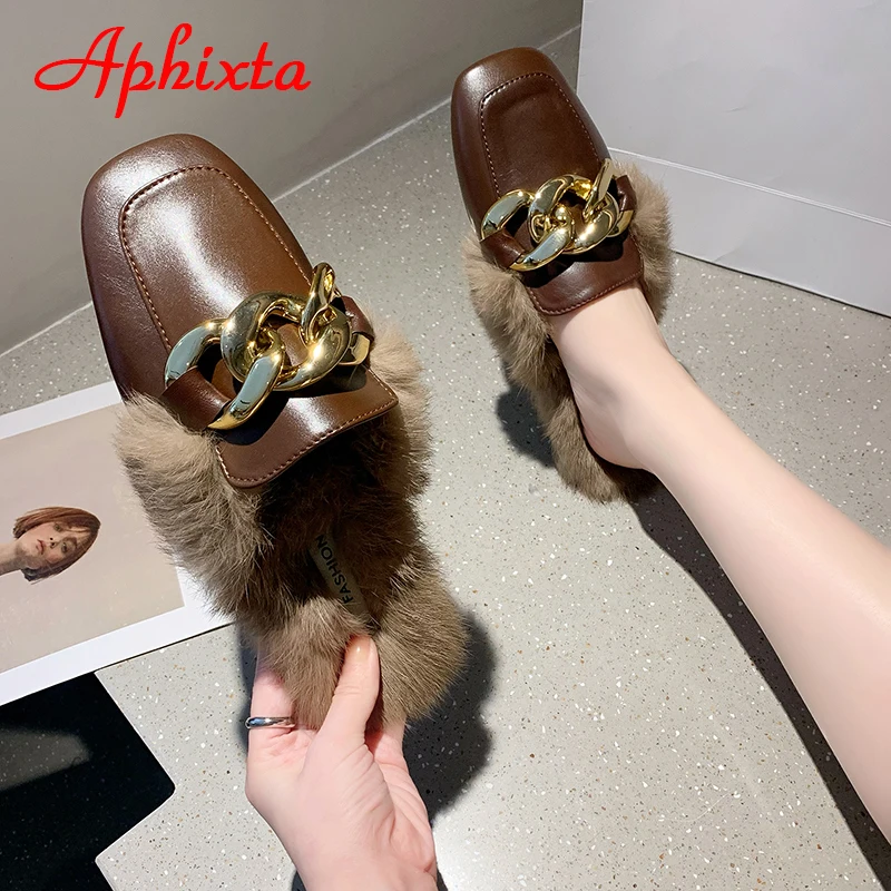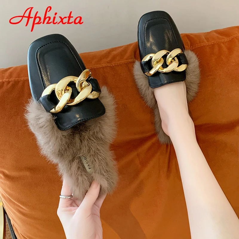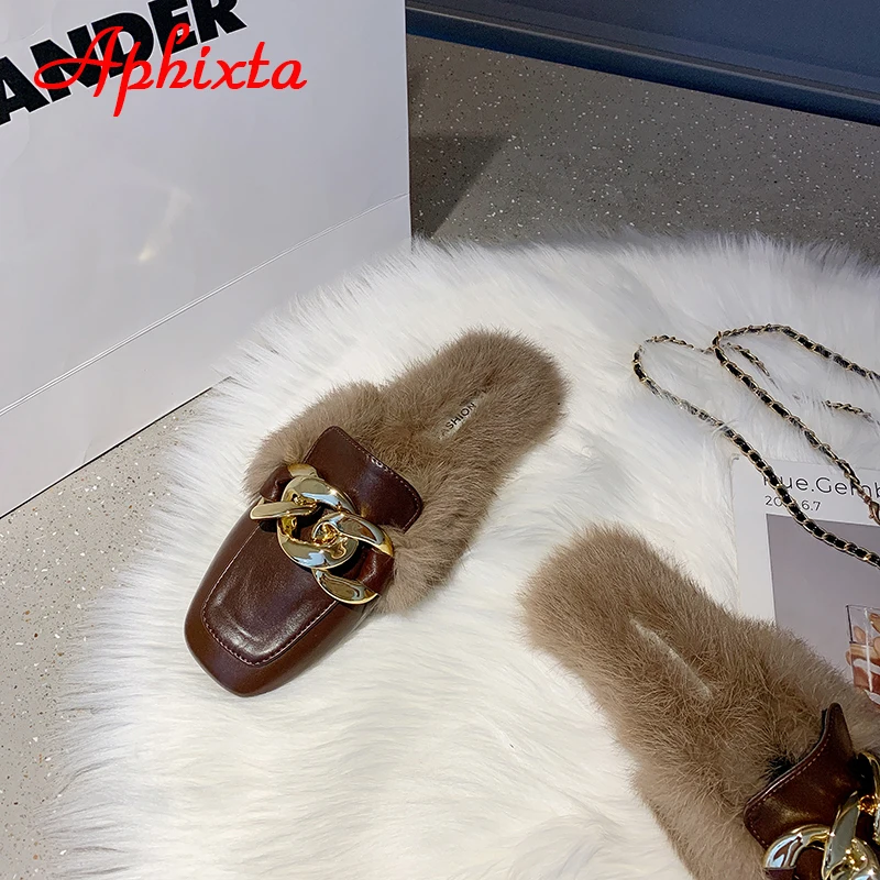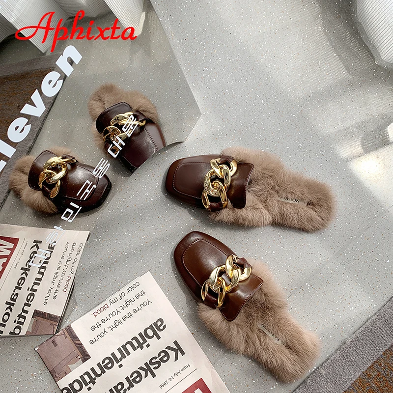 Aphixta Winter Big Chain Long Real Rabbit Fur Plush Women Slippers Nature Warm Furry Shoes Square Toe Flat Heel Hair Slides