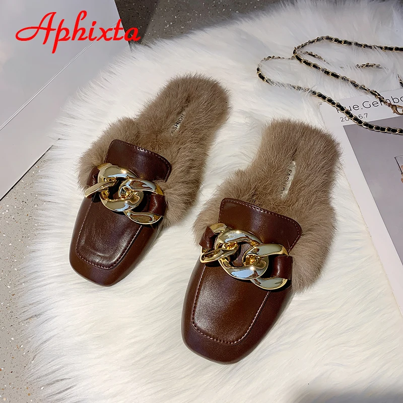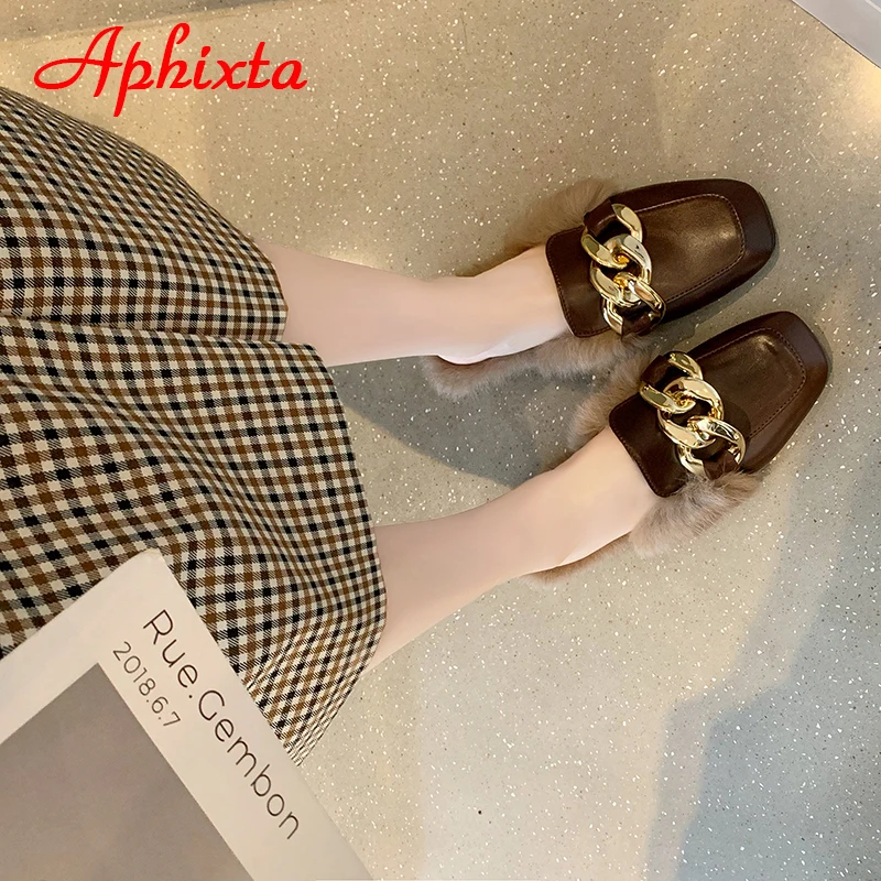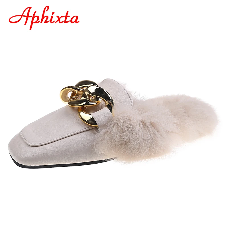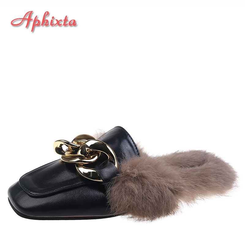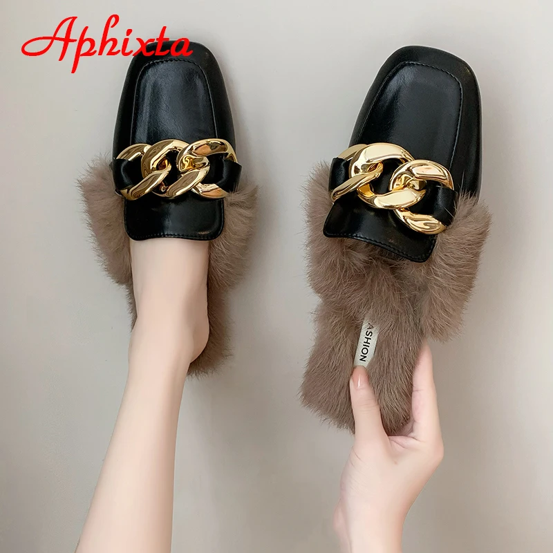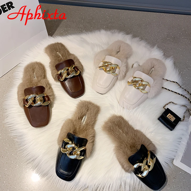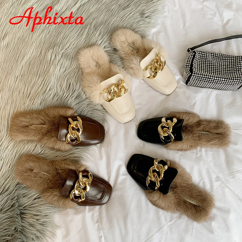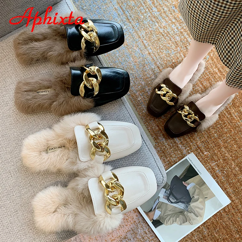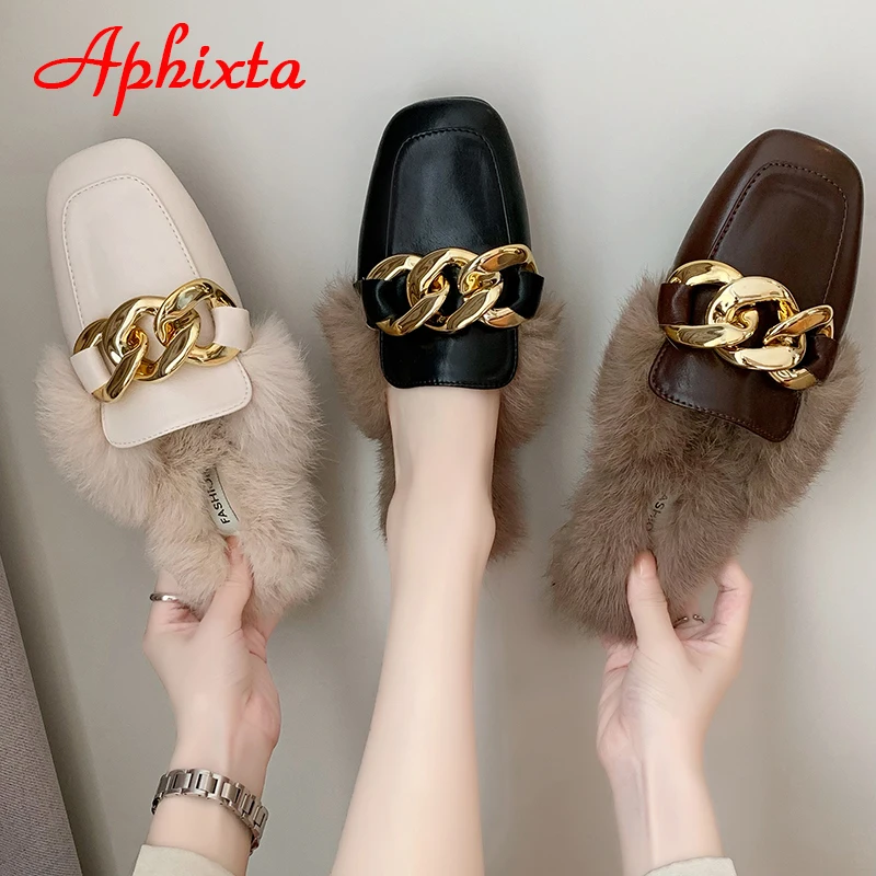 Aphixta Winter Big Chain Long Real Rabbit Fur Plush Women Slippers Nature Warm Furry Shoes Square Toe Flat Heel Hair Slides