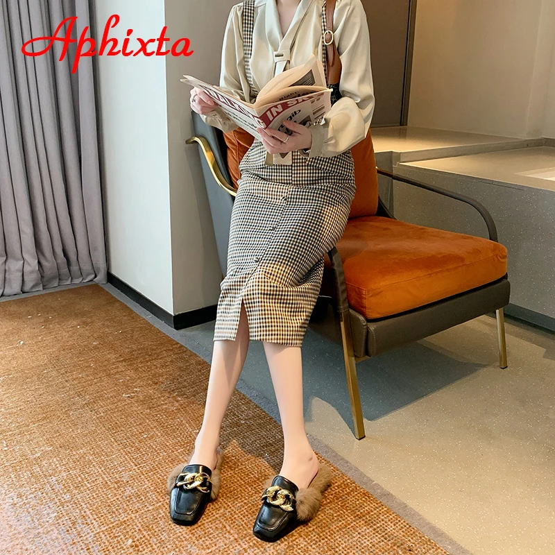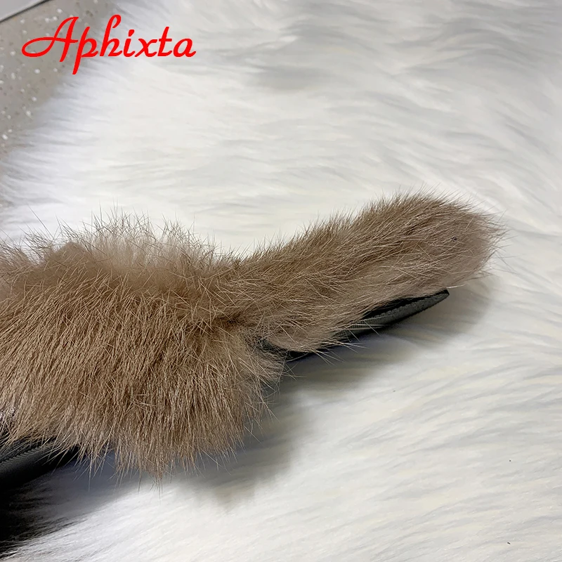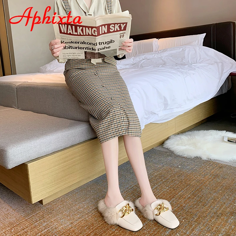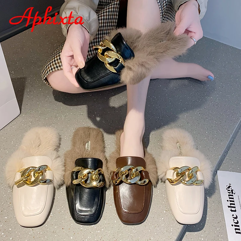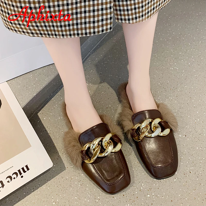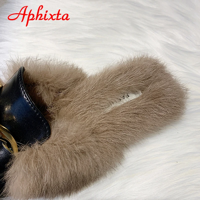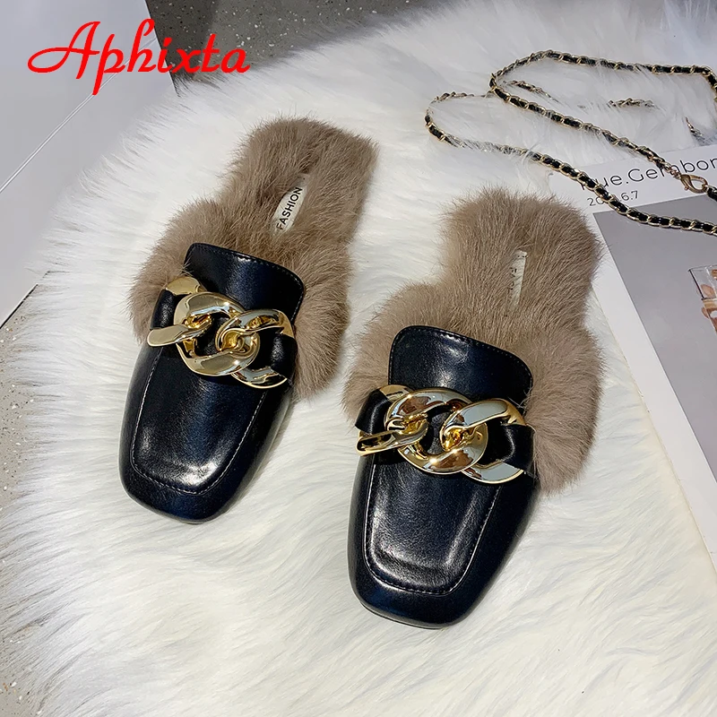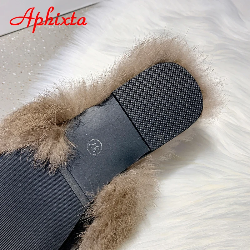 Aphixta Winter Big Chain Long Real Rabbit Fur Plush Women Slippers Nature Warm Furry Shoes Square Toe Flat Heel Hair Slides