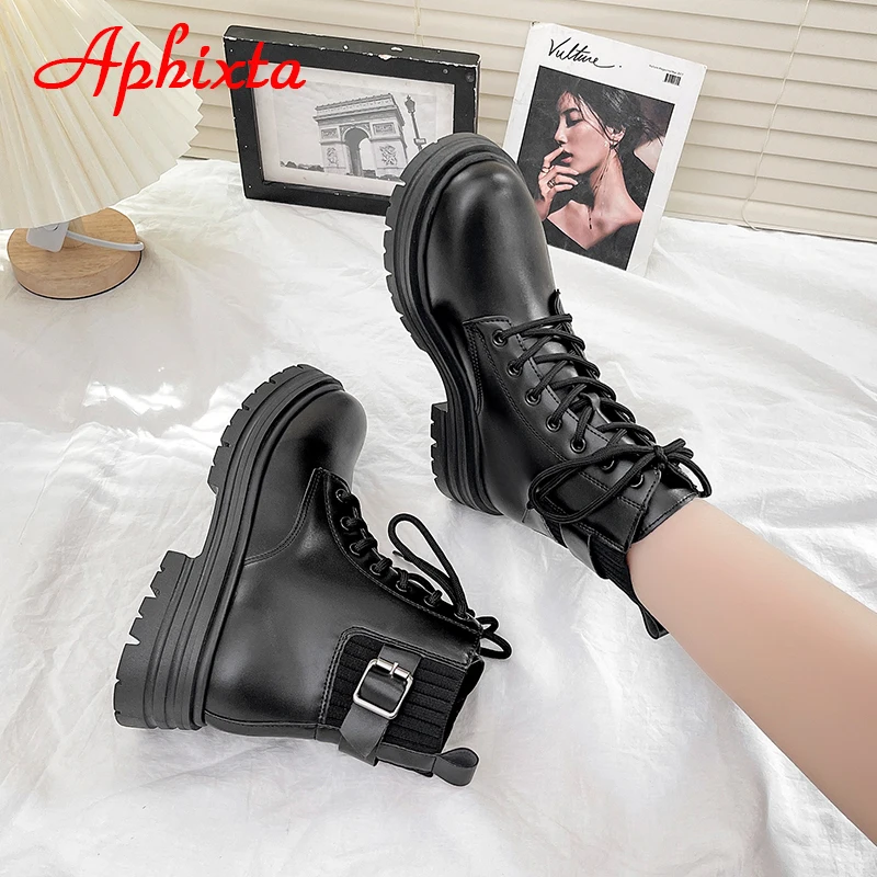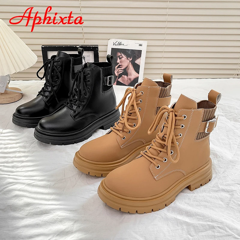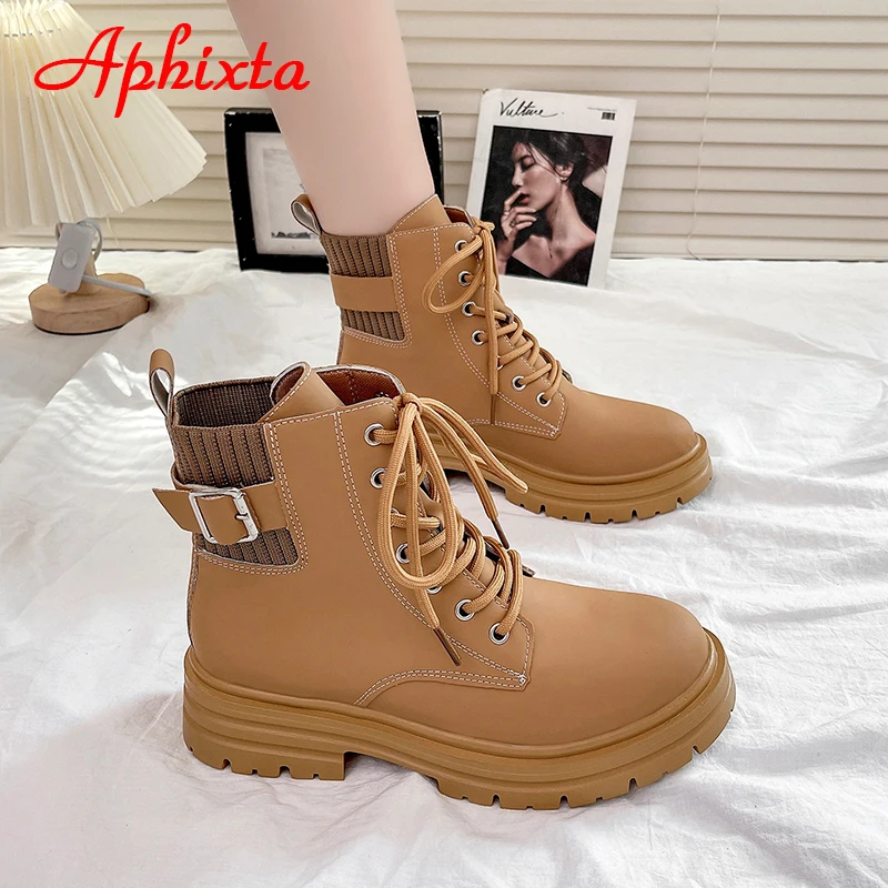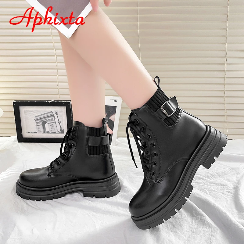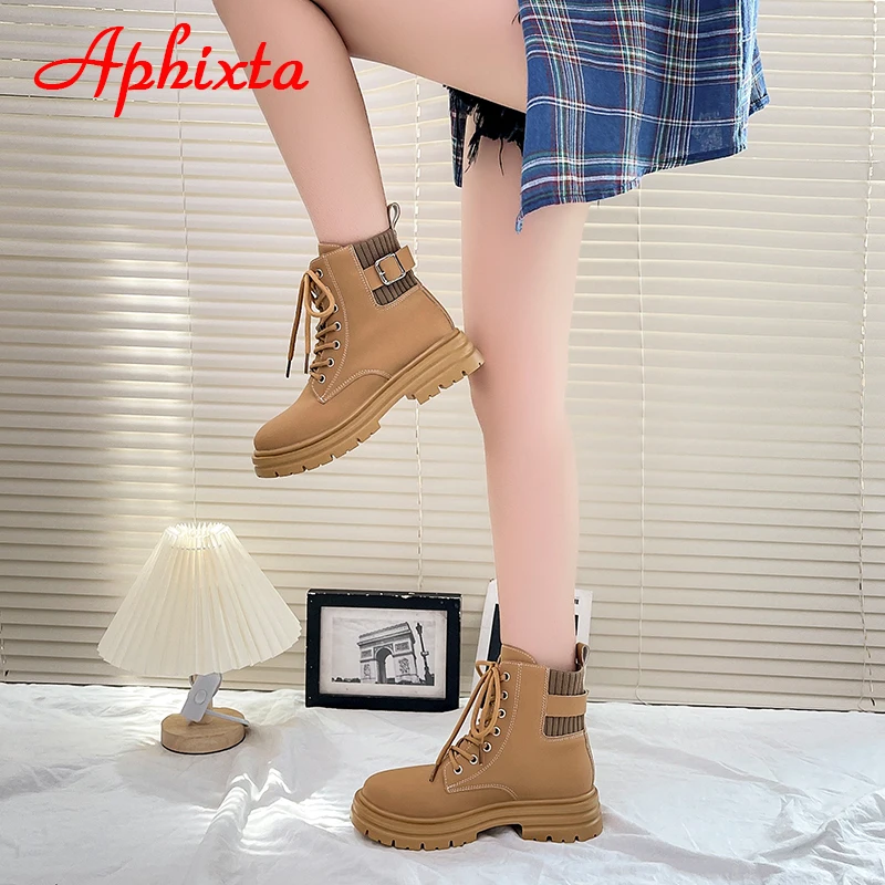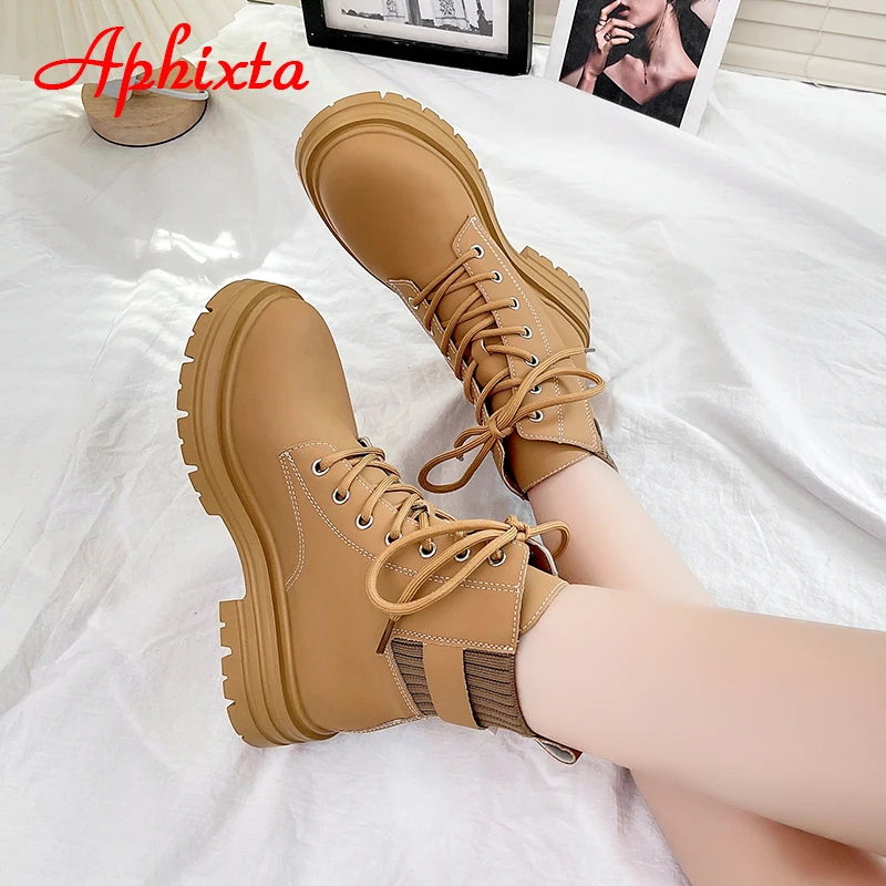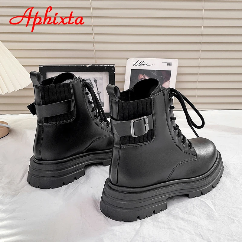 Aphixta Winter Platform Stretch Woolen Shoe Mouth Buckle Thick Sole Boots Women Non-slip Lace-up Waterproof Shoes