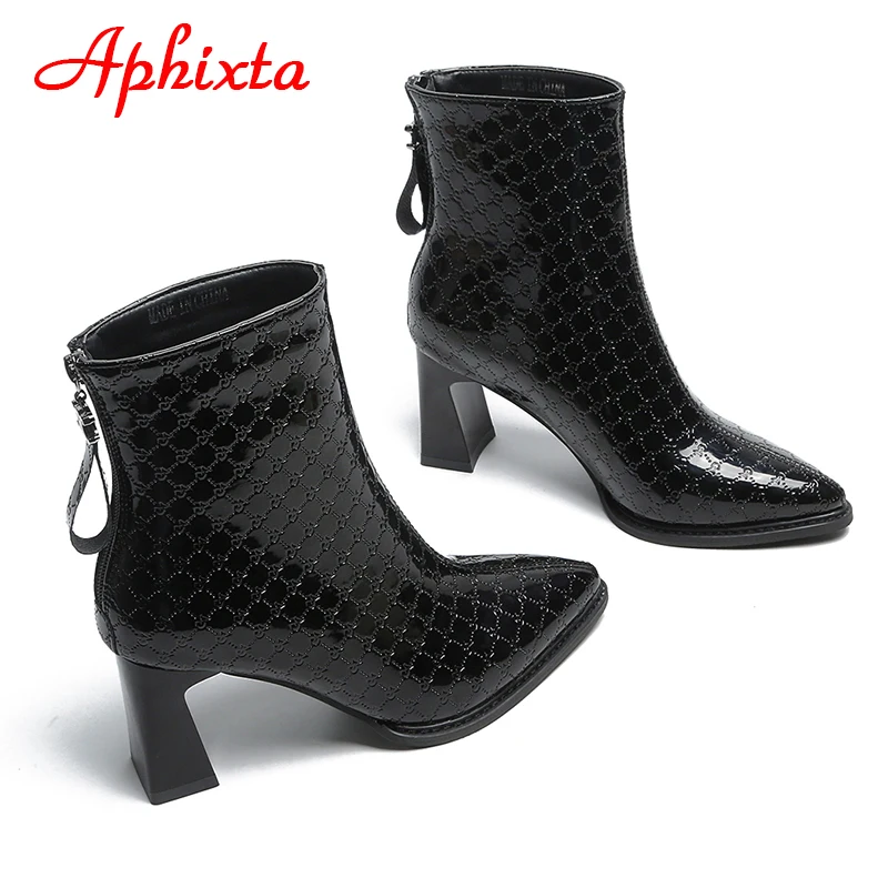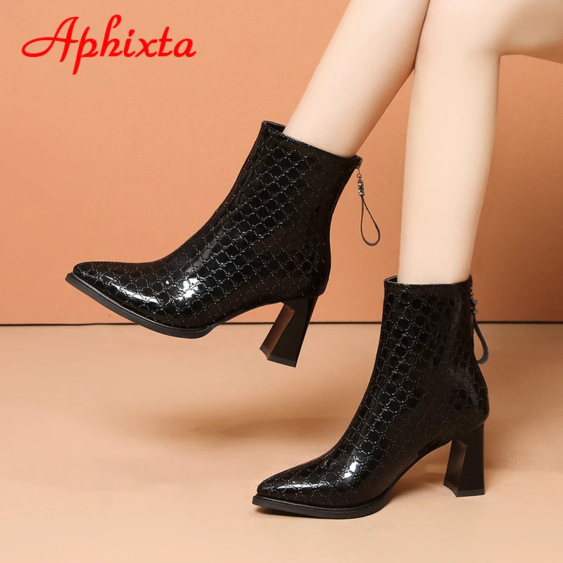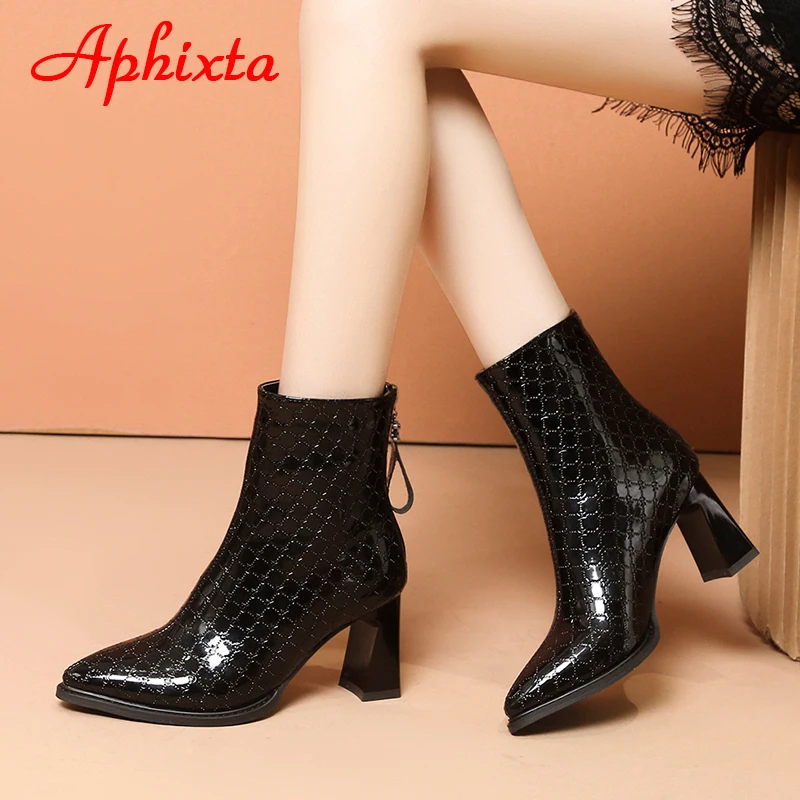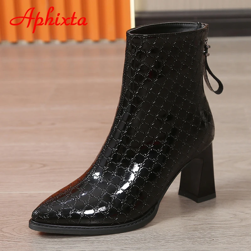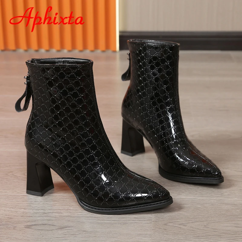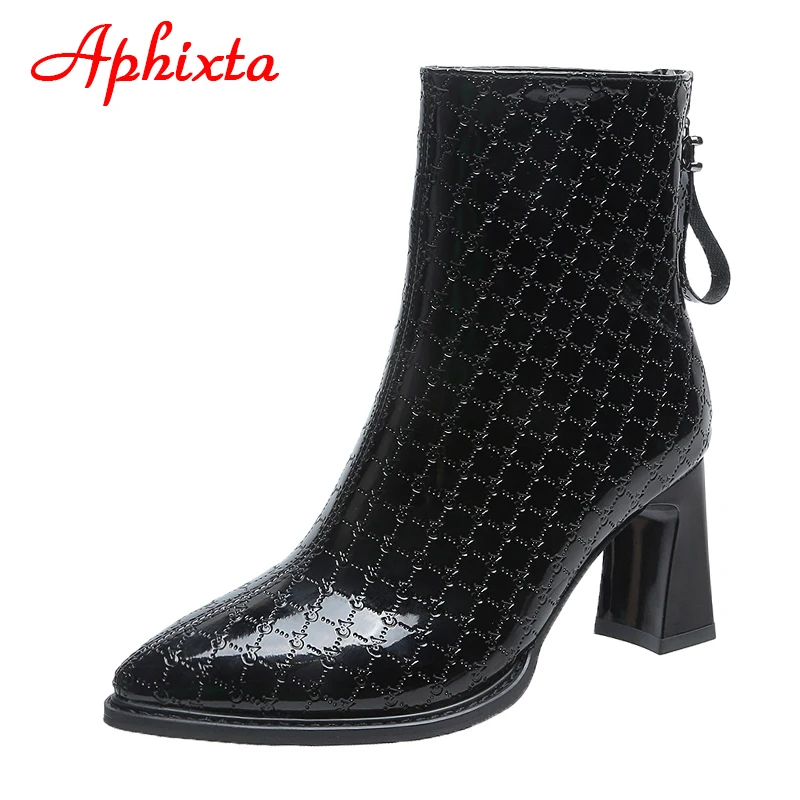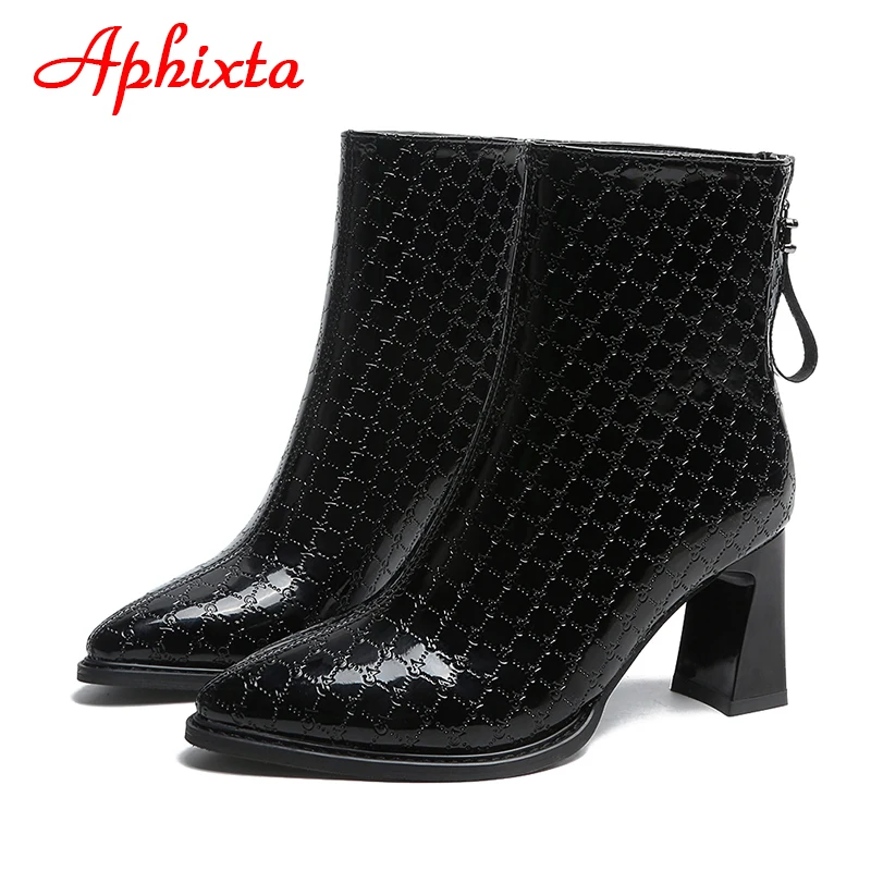 Aphixta Winter Short Women Boots Plaid Leather Pointed Toe 8.5cm Square Heel Ankle Boots Tassels Zipper Shoes Woman Boats
