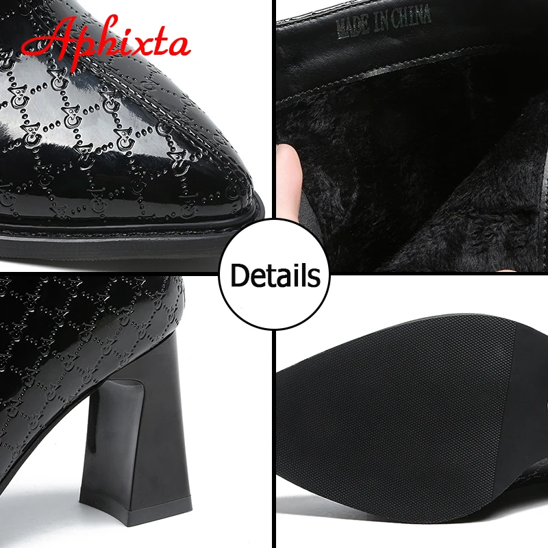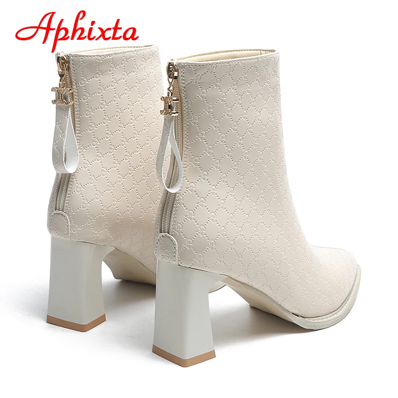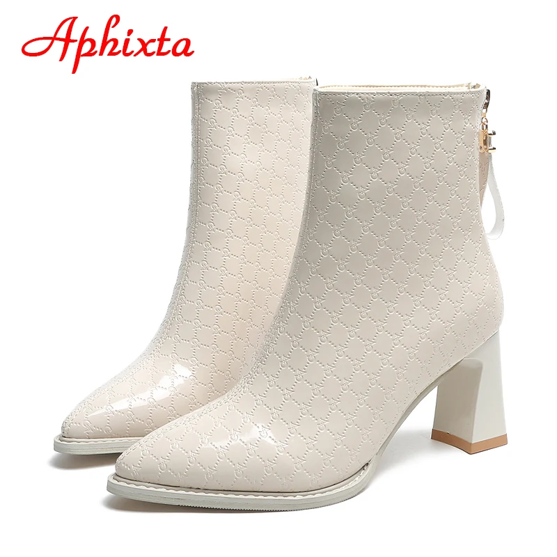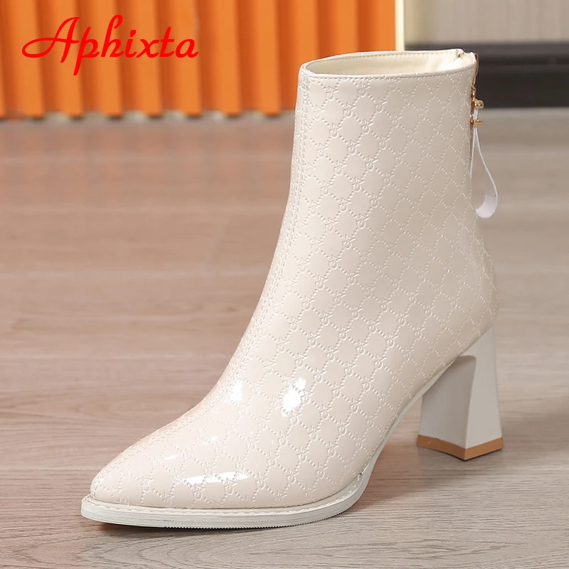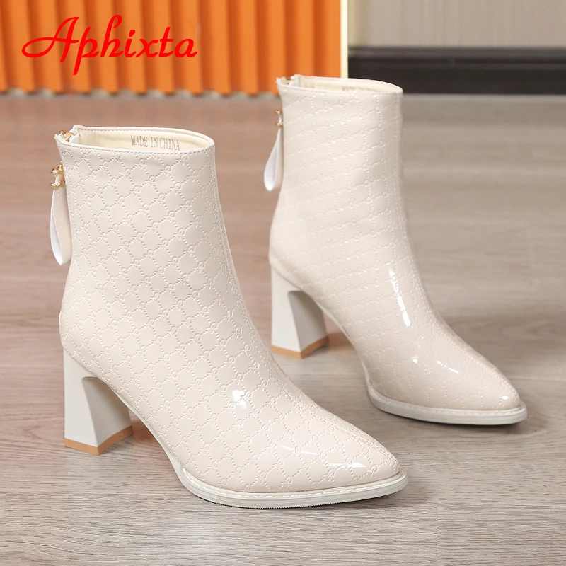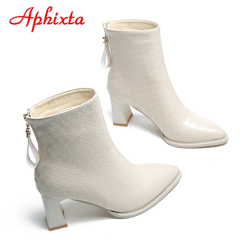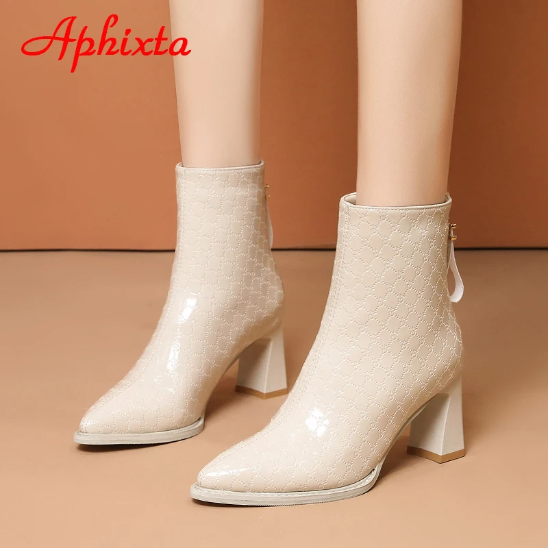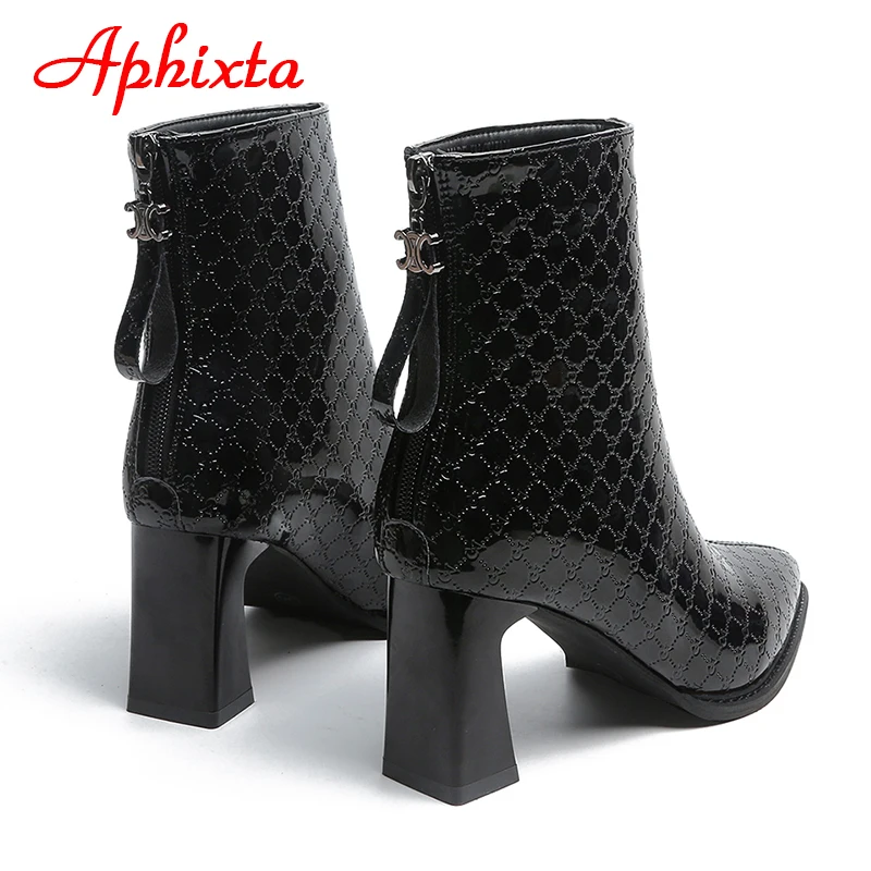 Aphixta Winter Short Women Boots Plaid Leather Pointed Toe 8.5cm Square Heel Ankle Boots Tassels Zipper Shoes Woman Boats