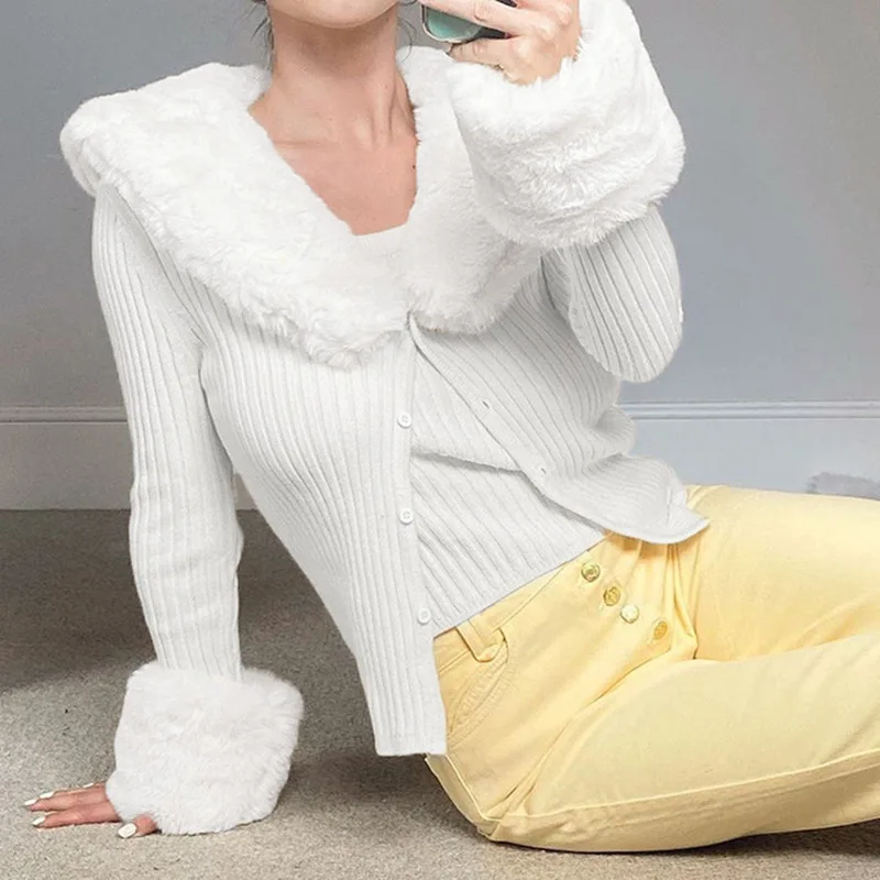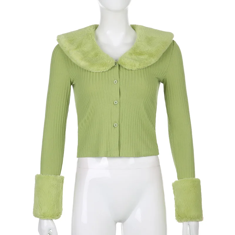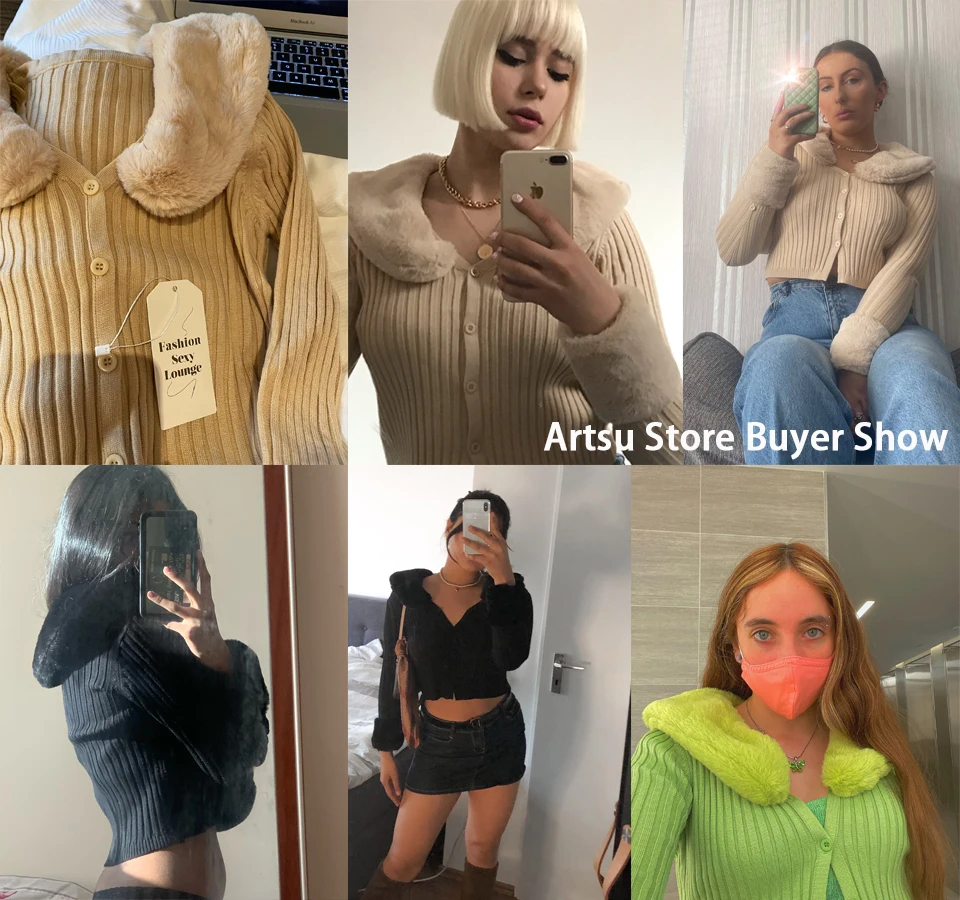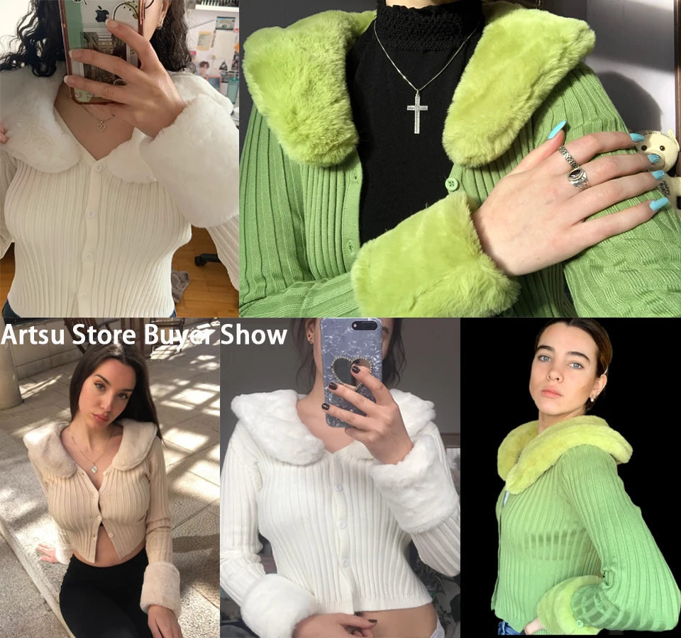 Artsu Ribbed Knitted Cardigans Sweaters With Fur Trim Collar Long Sleeve Slim Autumn Winter Jumpers Women Knitwear Chic 42015
