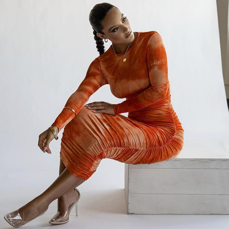 Autumn And Winter Dress Female Long Sleeves Round Collar Slim Temperament Joker Printing And Dyeing Skirt Female