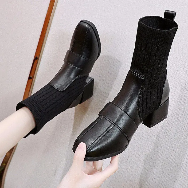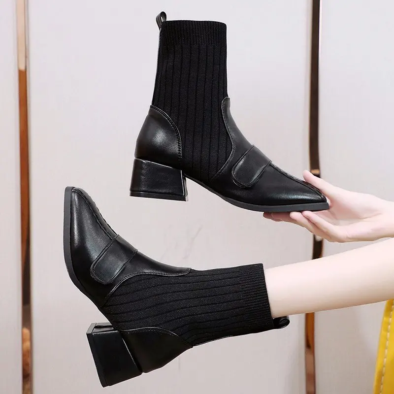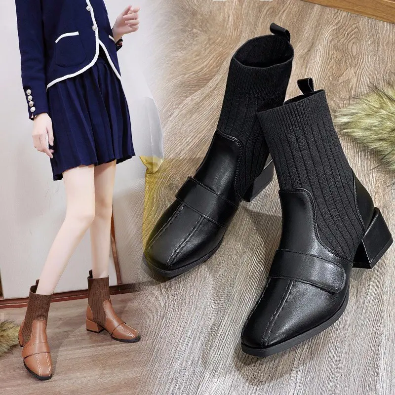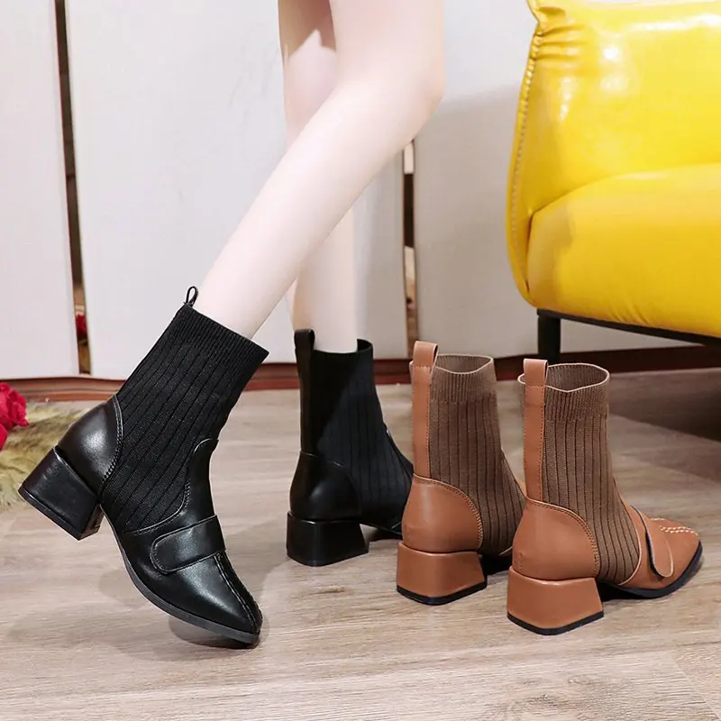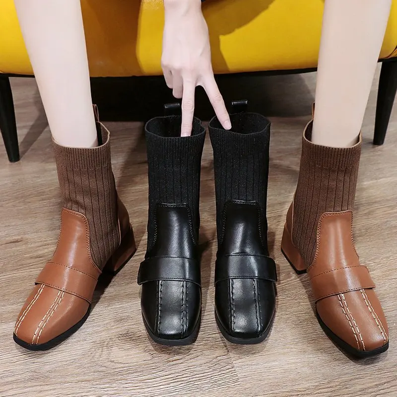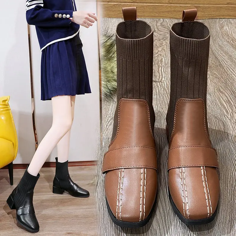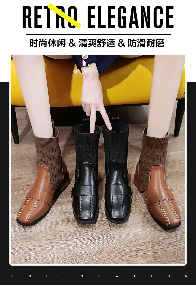 Autumn New Dress British Shoes Knitted Sock Booties Low Heel Vintage Ankle Boots for Women2021