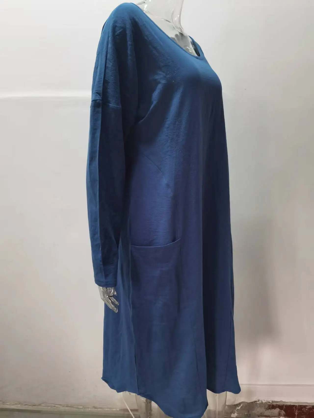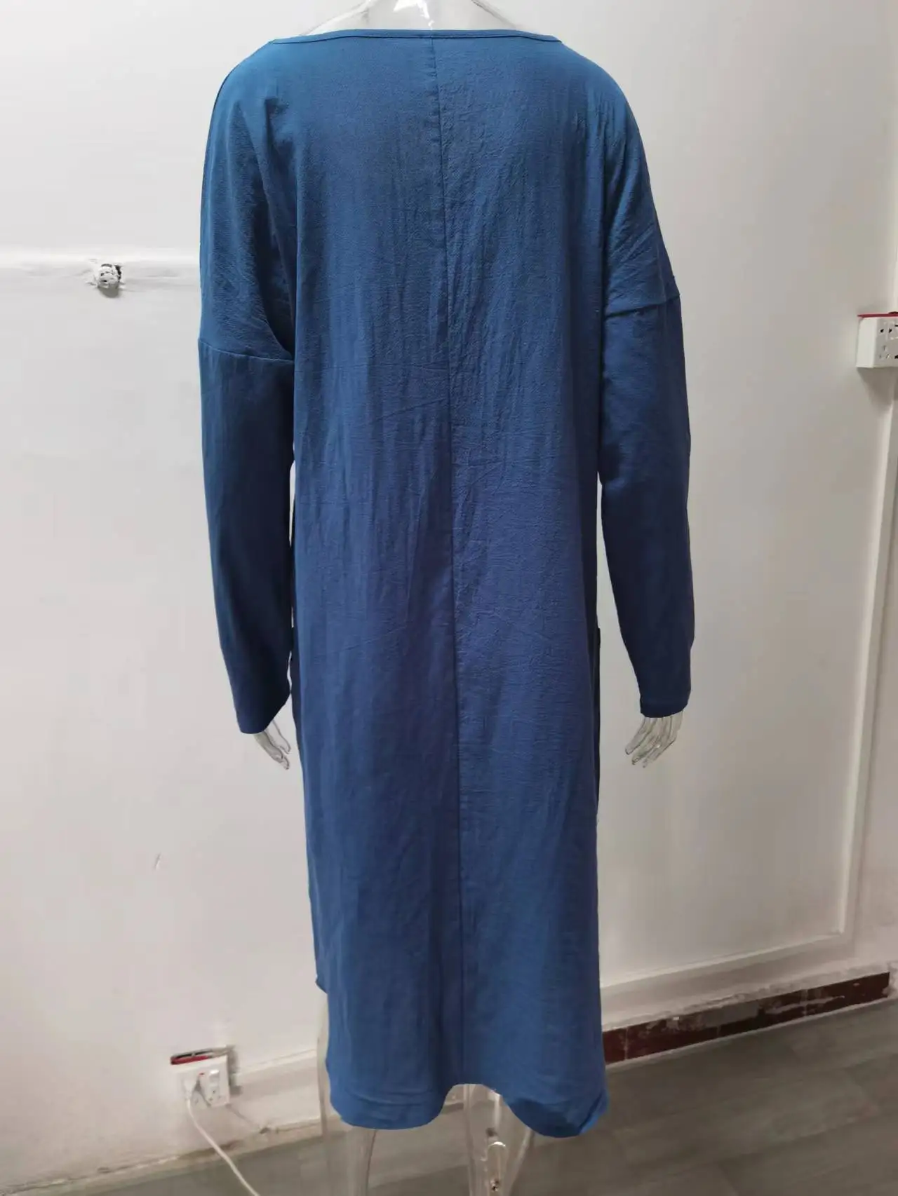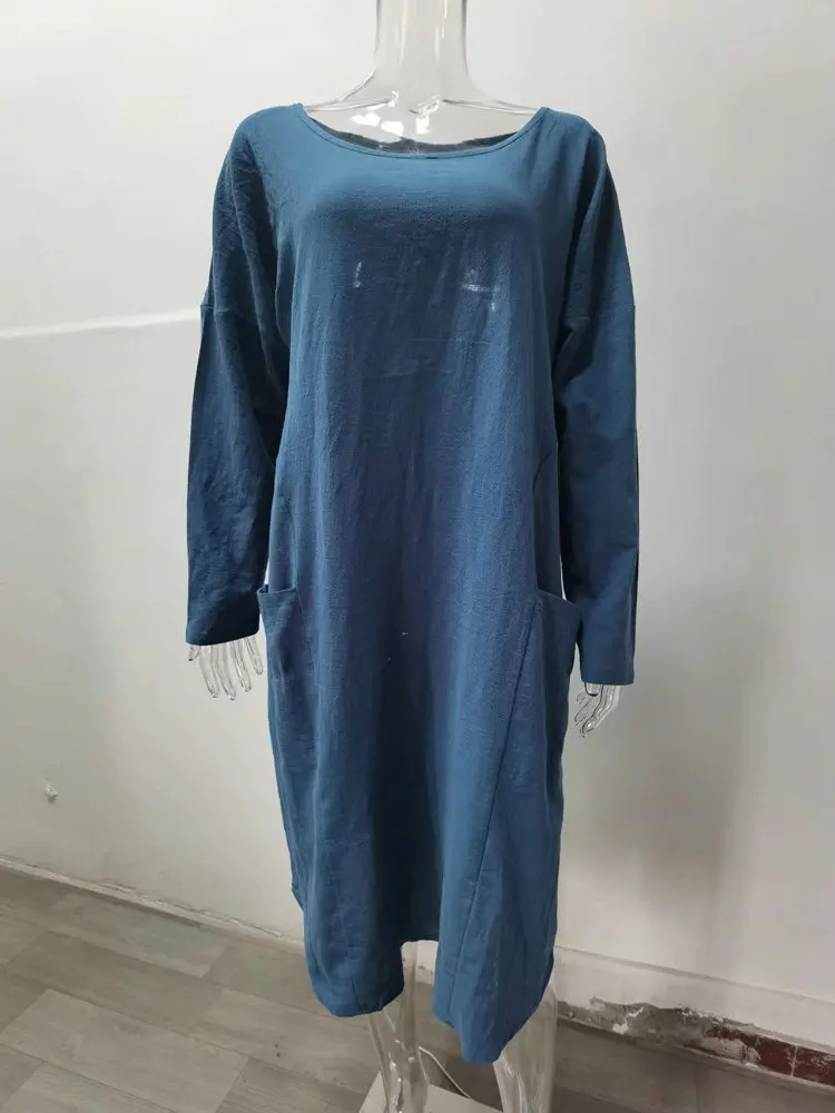 Autumn New European American Women Cotton Linen Loose Casual Solid Color Pocket Long Sleeve Dresses Breathable Female Clothing