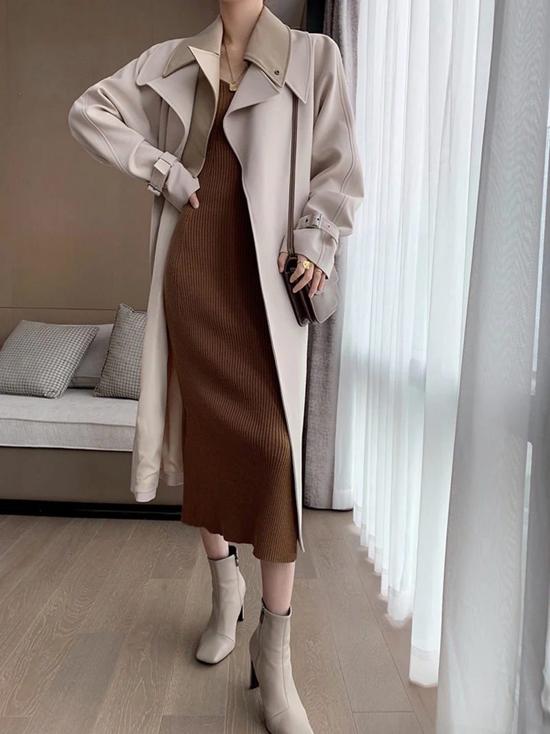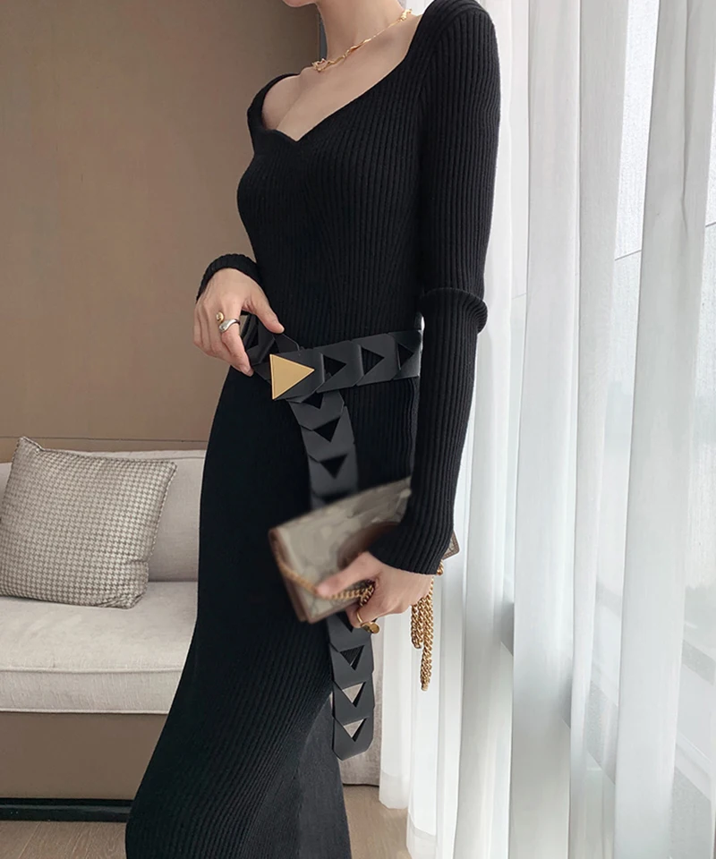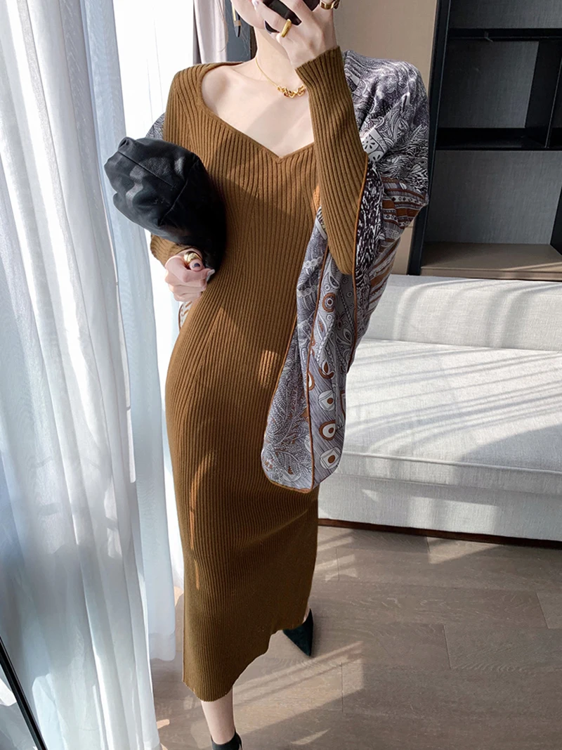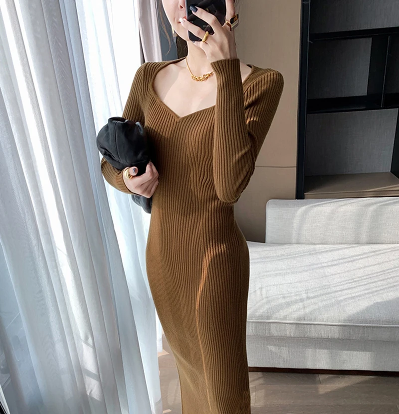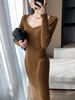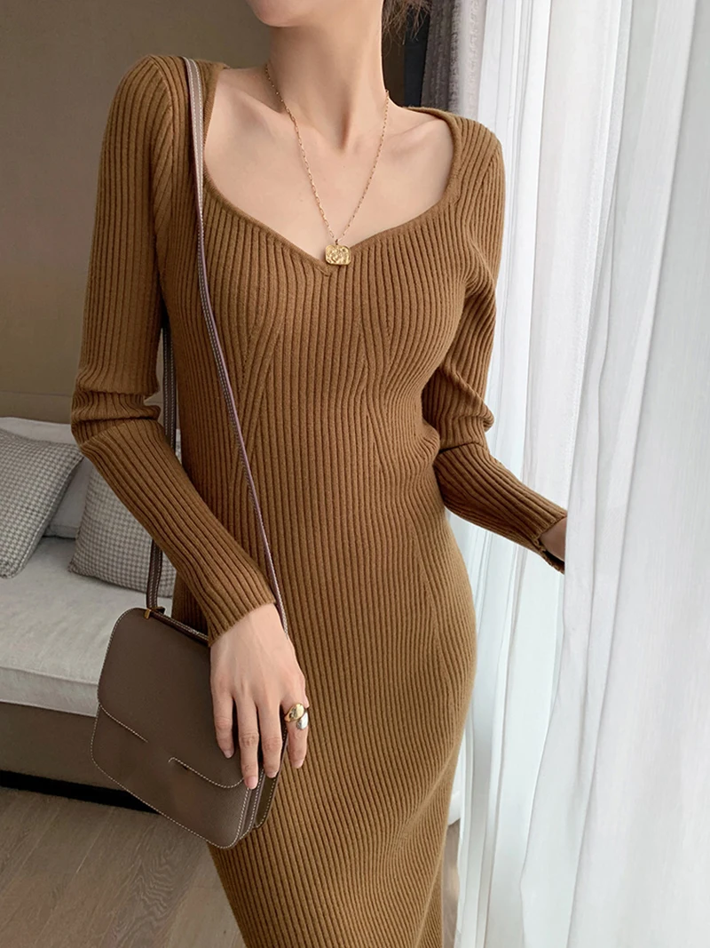 Autumn Winter Dress 2024 Elegant Vintage Thick Beige Slim Warm Women Knitted Dress Square Collar Knit Chic Bodycon Sweater Dress