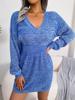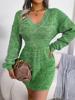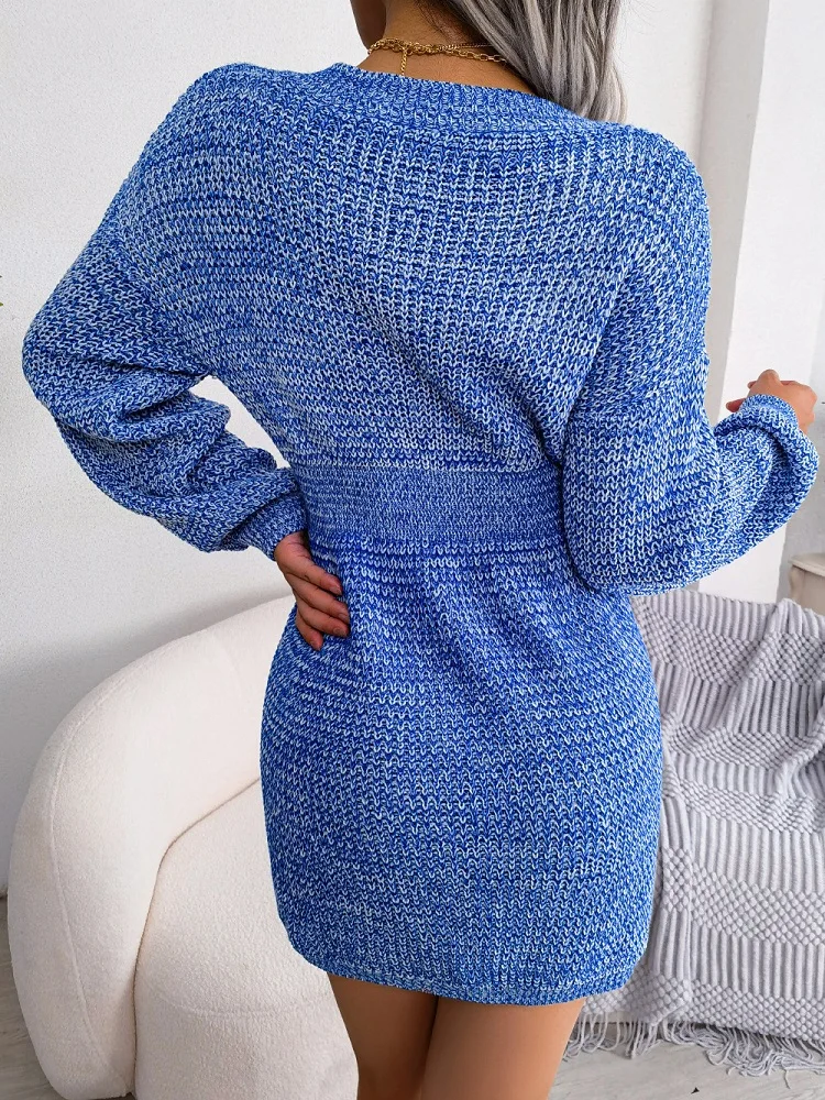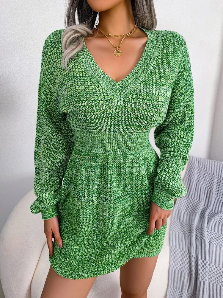 Autumn Winter Women New Colour Mixture Sweater Long Lantern Sleeves Waist Closed V-Neck Pullover Knitted Dress Sexy Elegant Lady