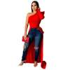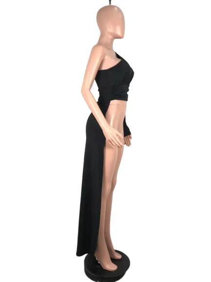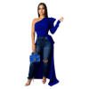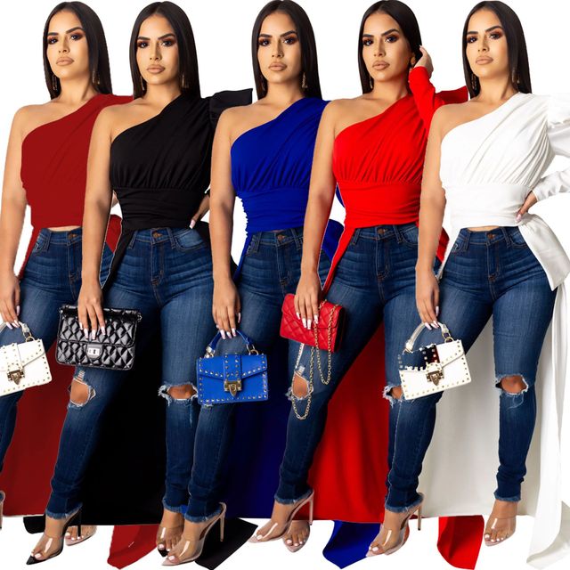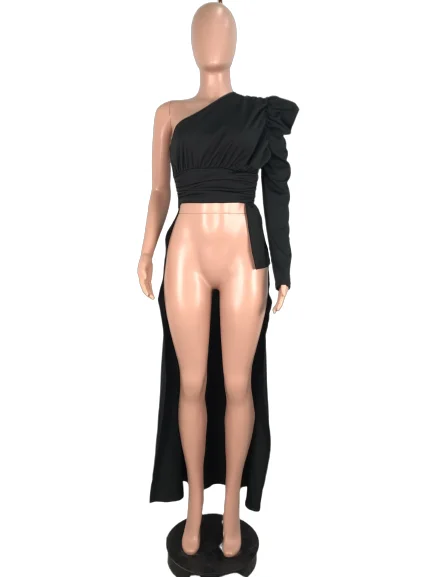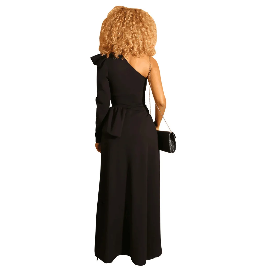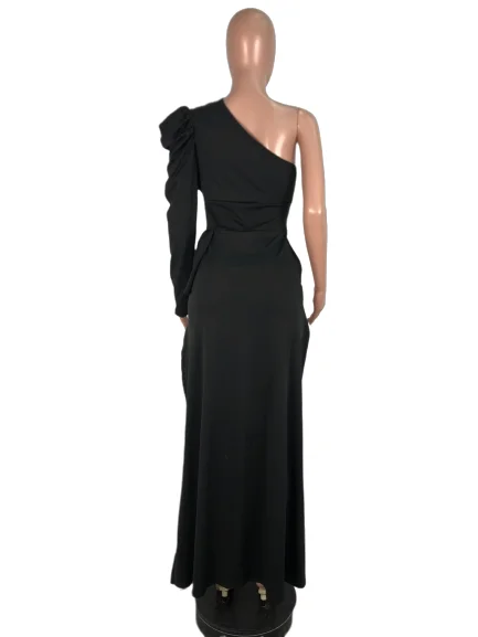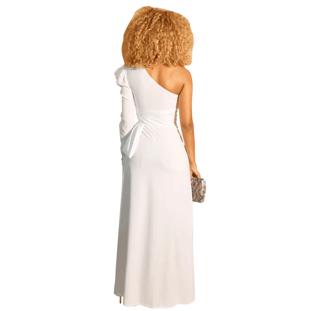 Autumn Women Solid Color One Shoulder Puff One Long Sleeve Skew Neck Irregular High Low Maxi T-shirt Dress 2 Color