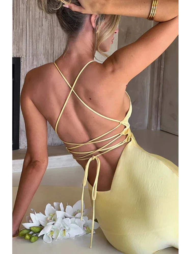Bandage Backless Elegant Dress Split Hem Spaghetti Strap Slim Cocktail Party Club Fashion Satin Solid Lace-Up Long Dresses