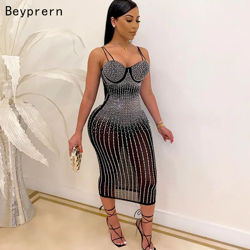 Beyprern Beautiful Crystal Studded Midi Dress For Women Sparkle Spagetti Straps Bodycon Sequin Party Dress Birthday Outfits
