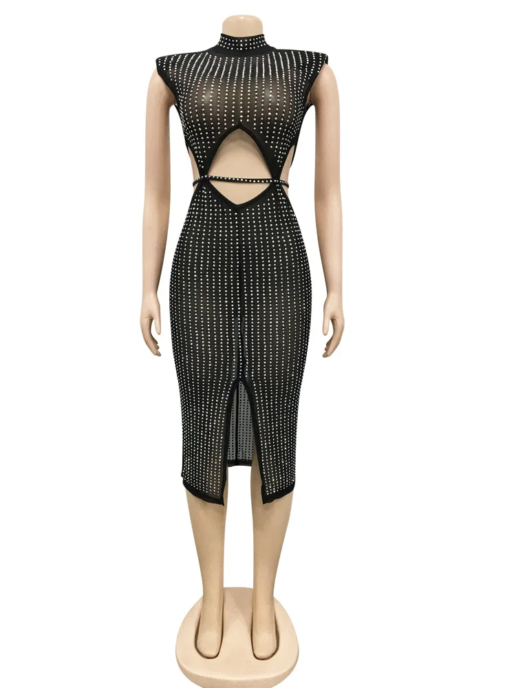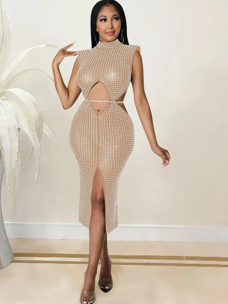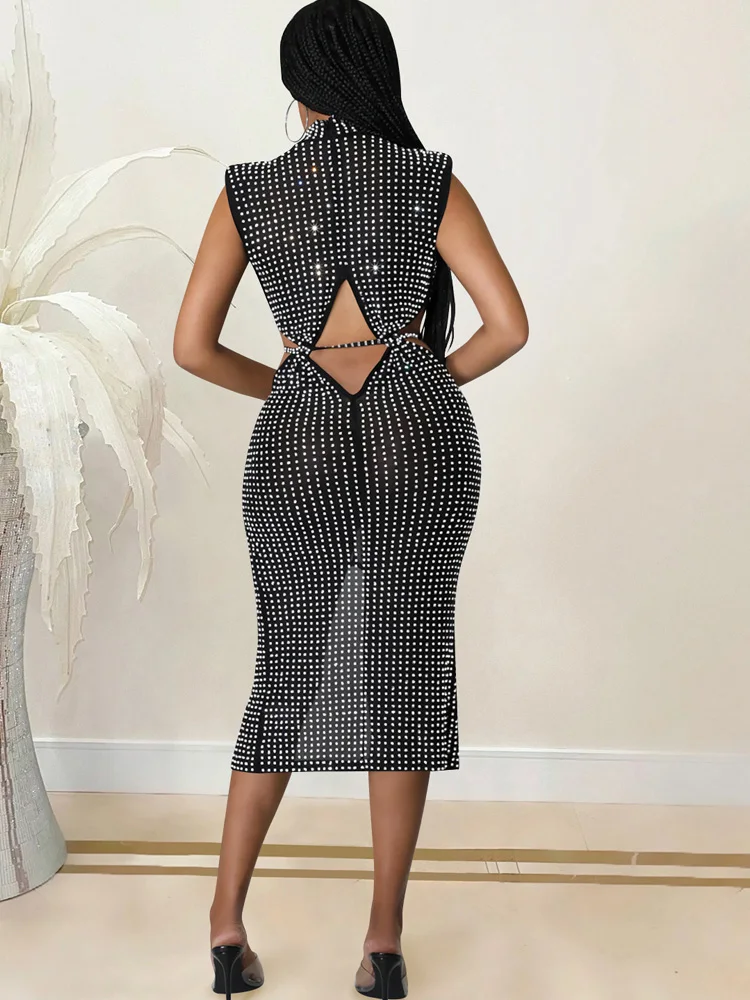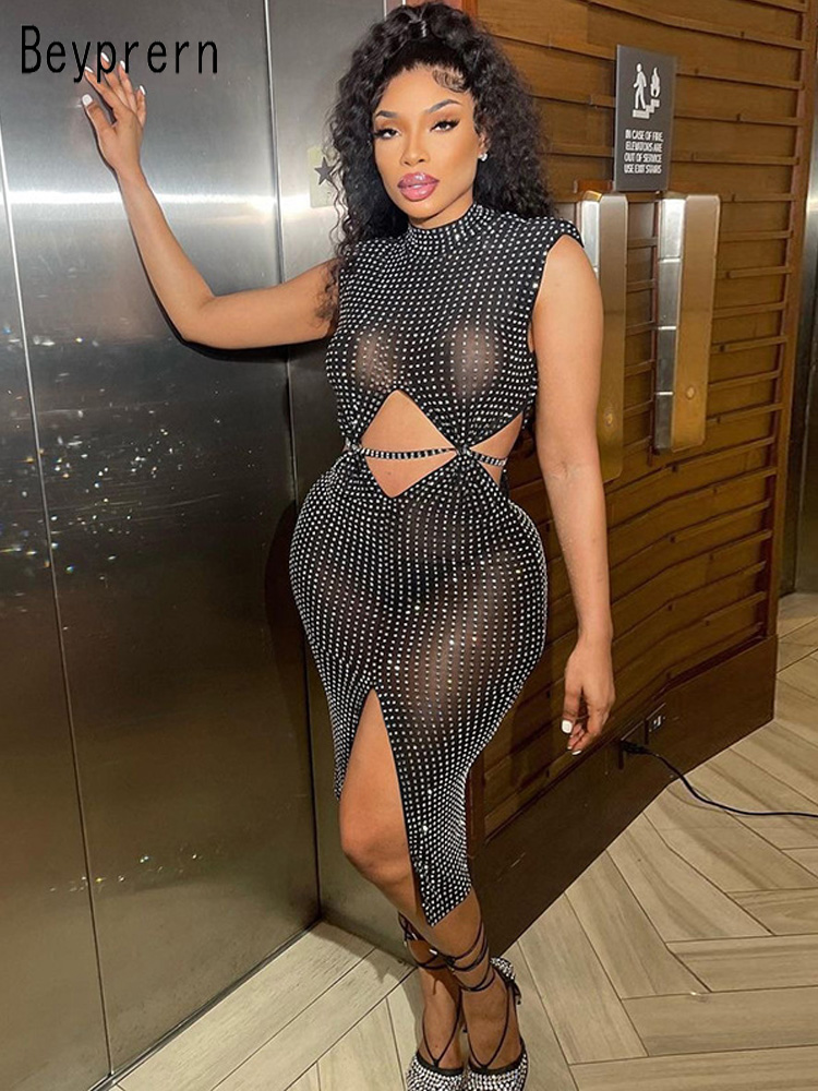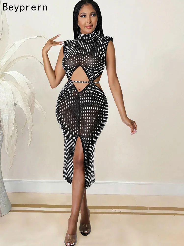 Beyprern Beautiful Cut-Out Twist Front Slit Crystal Midi Dress Sparkle Summer Mock Neck Sequins Party Dresses Birthday Outfits