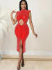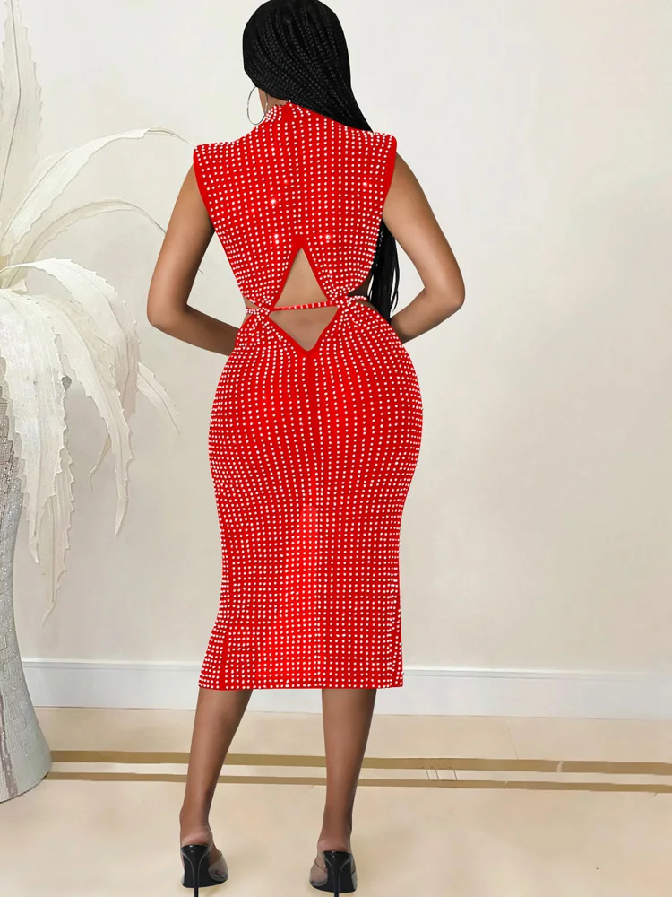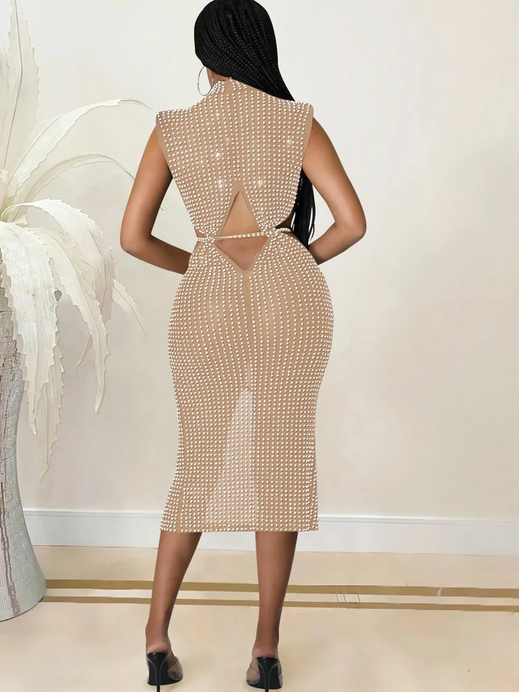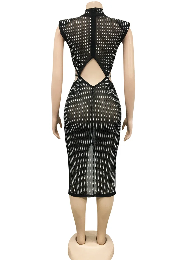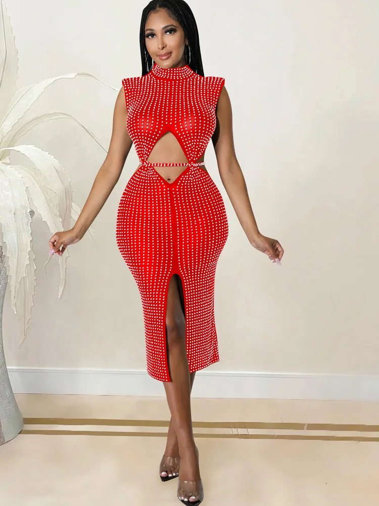 Beyprern Beautiful Cut-Out Twist Front Slit Crystal Midi Dress Sparkle Summer Mock Neck Sequins Party Dresses Birthday Outfits