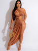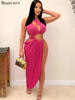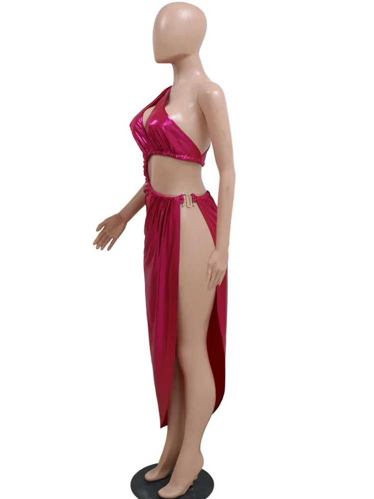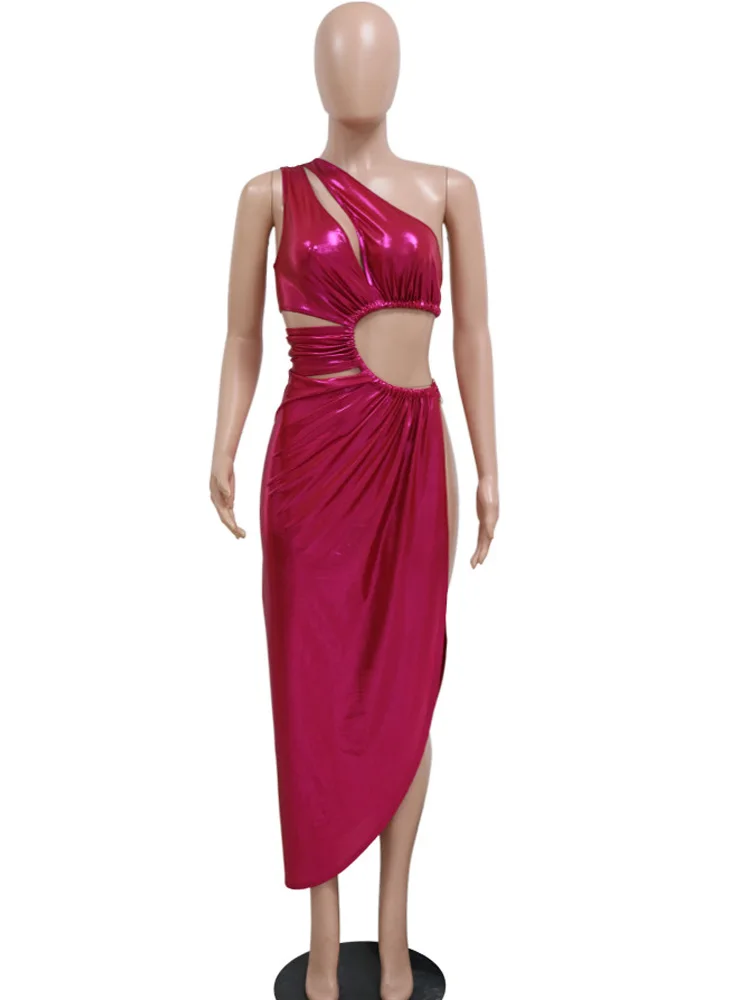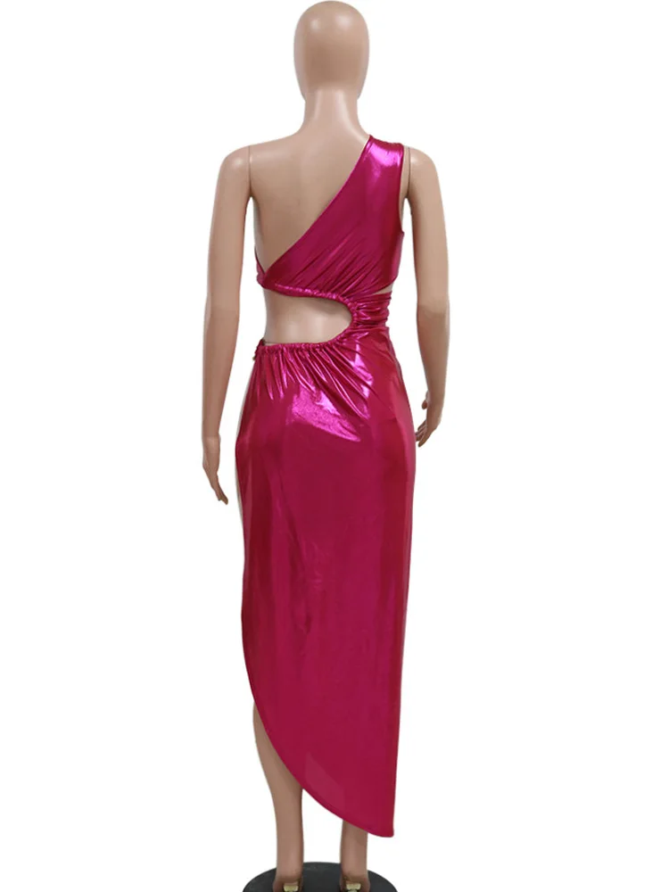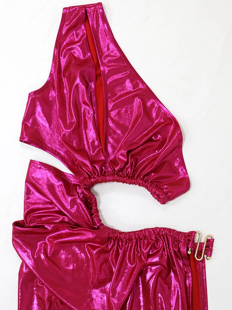 Beyprern Chic Hollow Out Side Slit Shiny Metallic Dress Glam Sleeveless Slim Ruched Leather Party Dresses Rave Outfits Clubwear