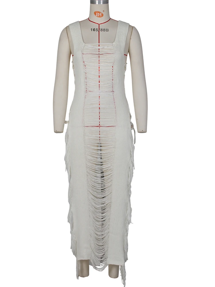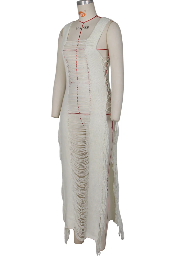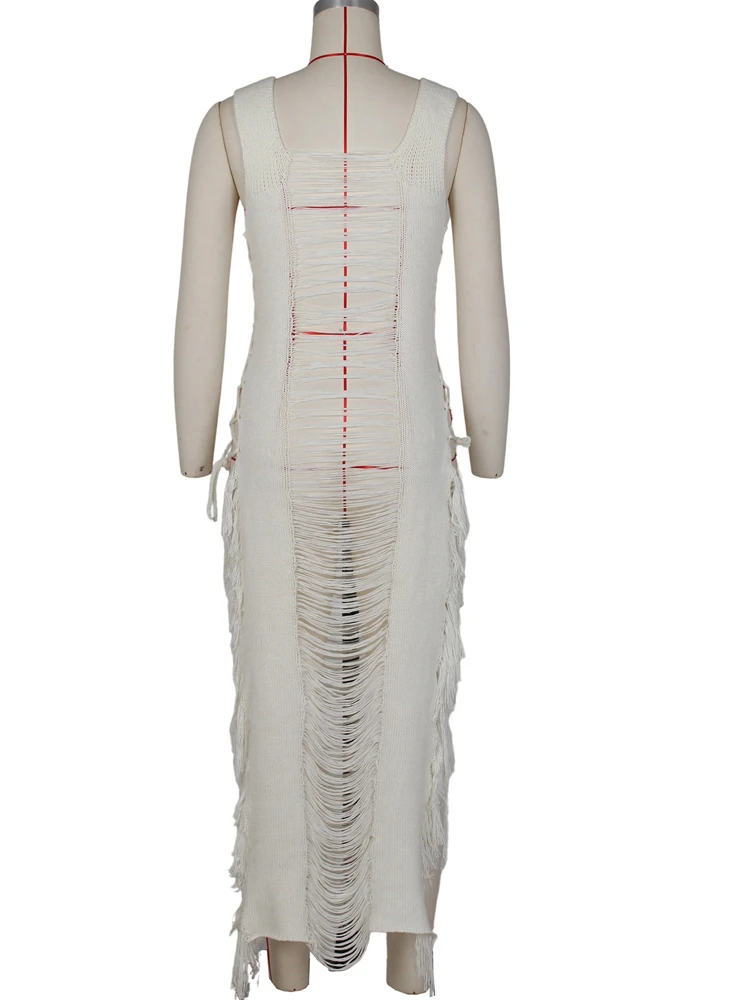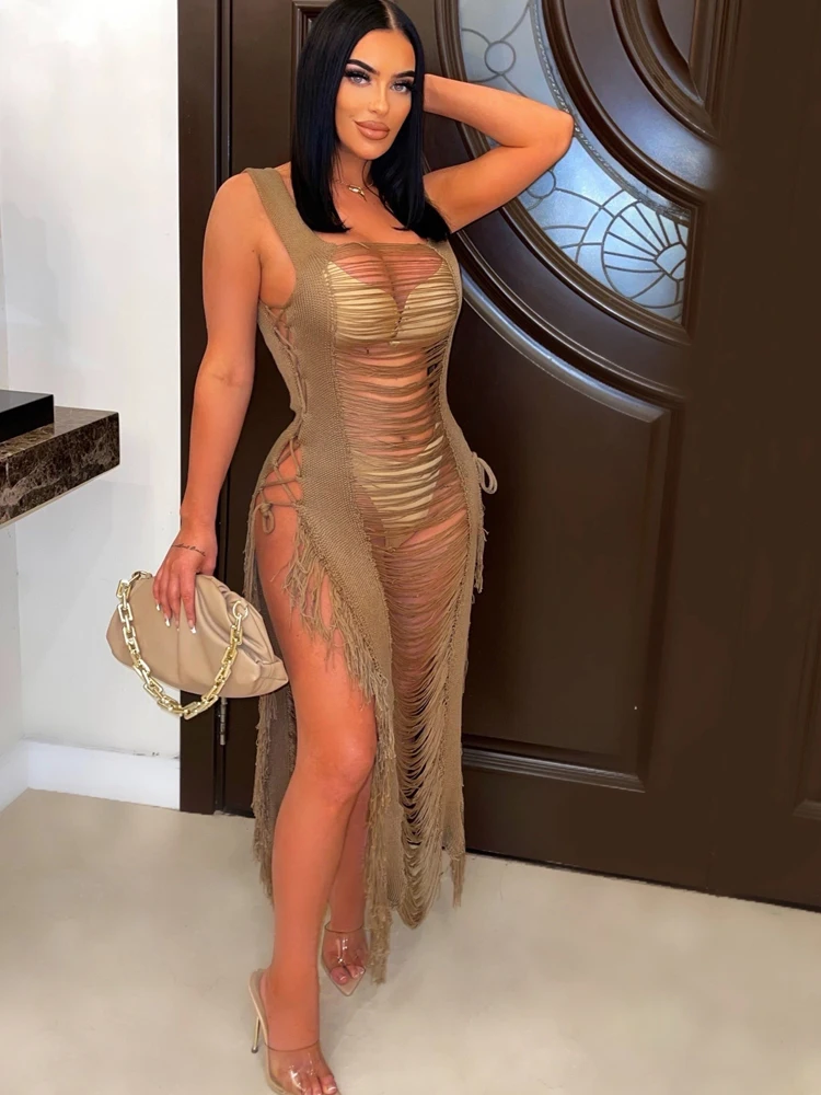 Beyprern Elegant Sleeveless Hollow Out Distressed Crochet Midi Dress For Women Summer Ladder Cut-Out Beach Cover-Up Dress Robes