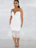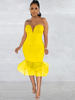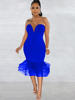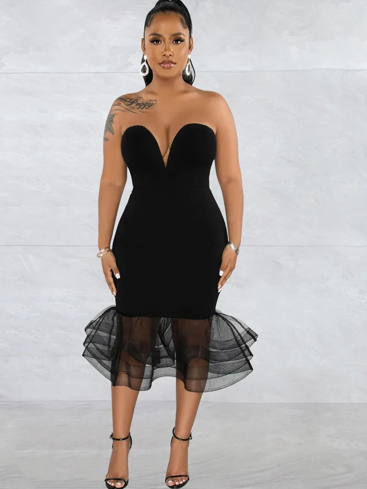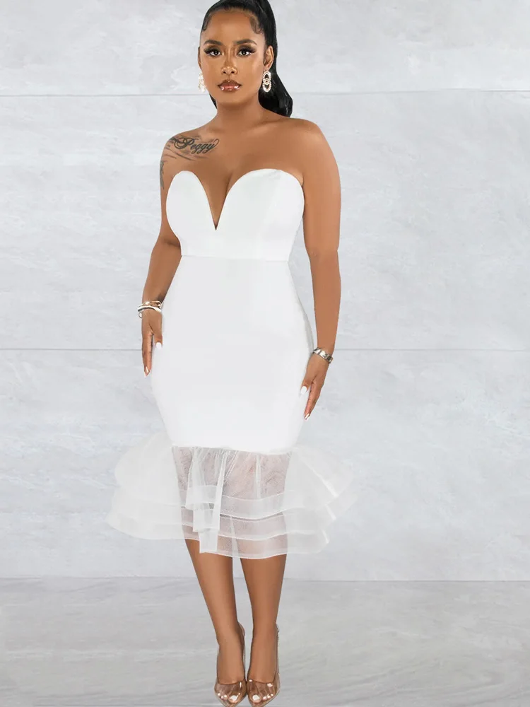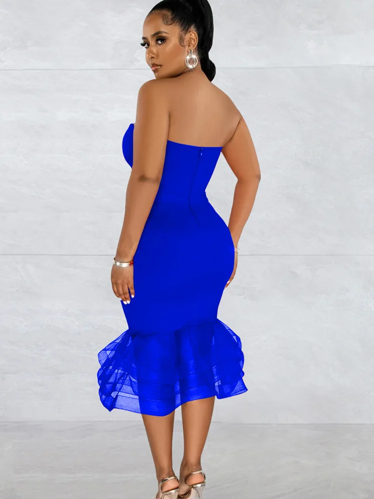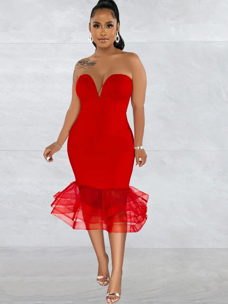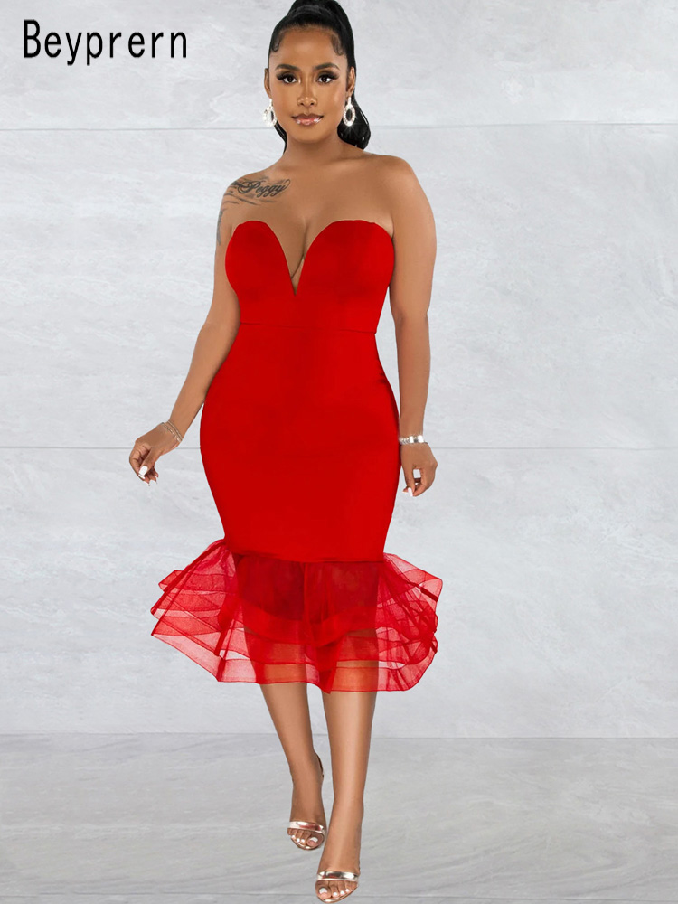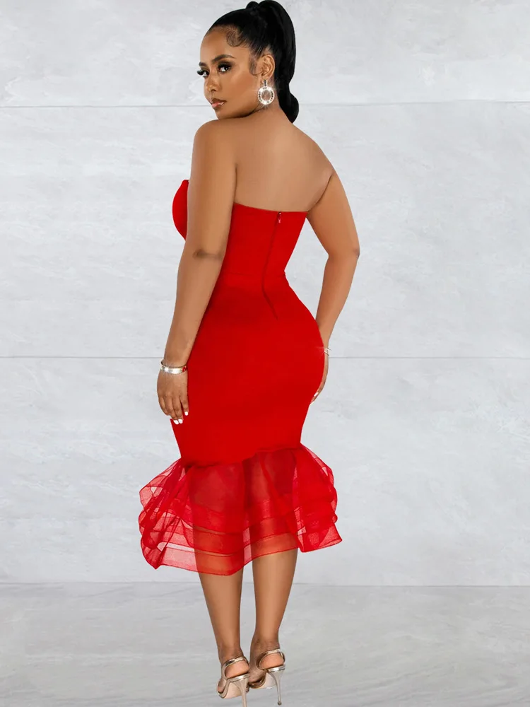Beyprern Elegant Strapless Red Tulle Ruffle Hem Midi Dress Party Clubwear Summer Vintage Clothes Celebrities Outifts Rave Wear