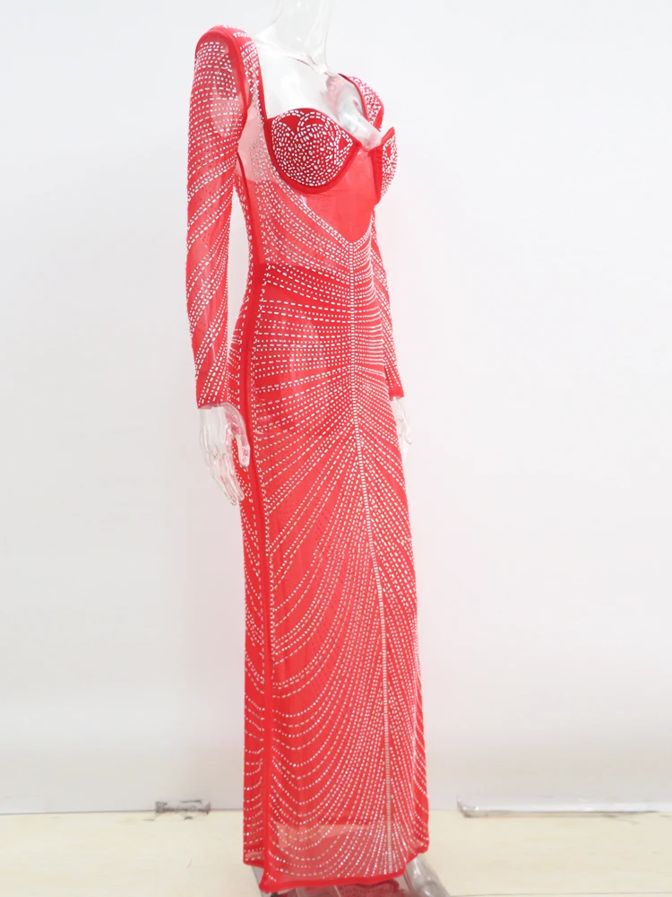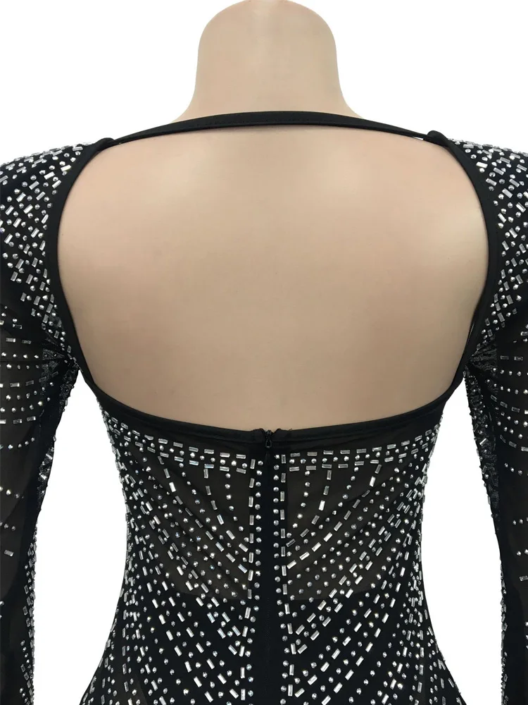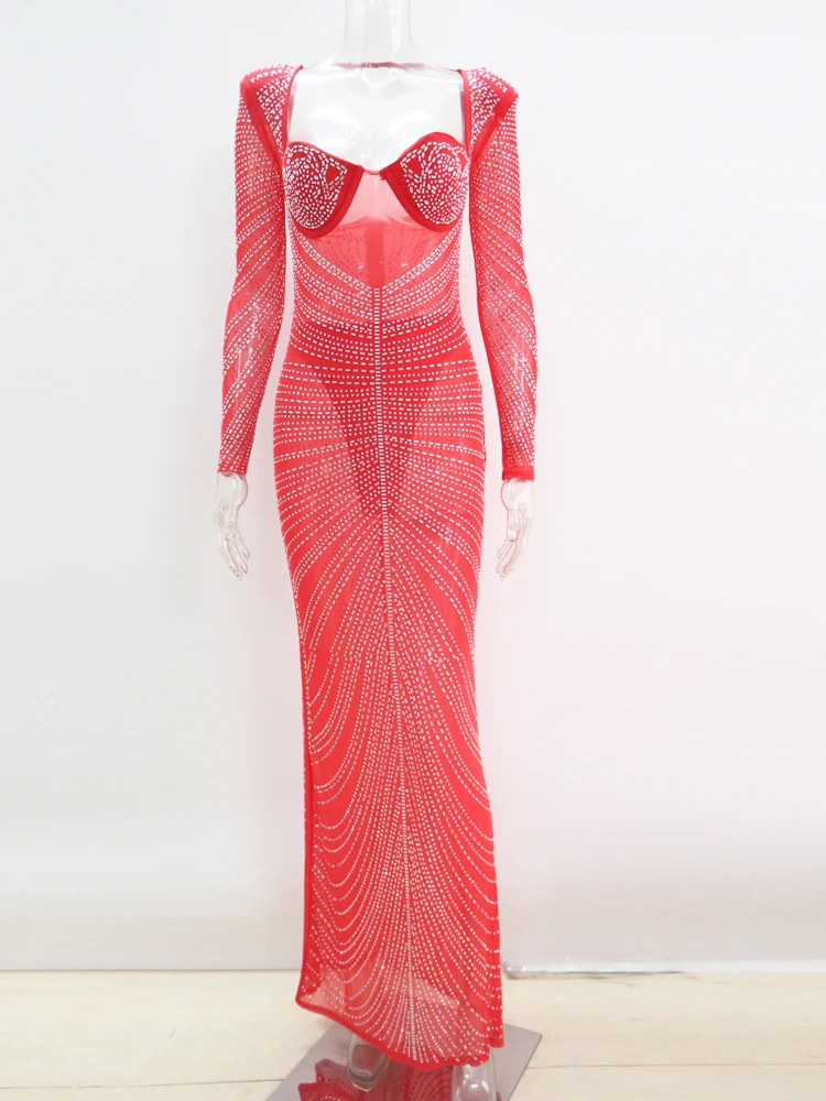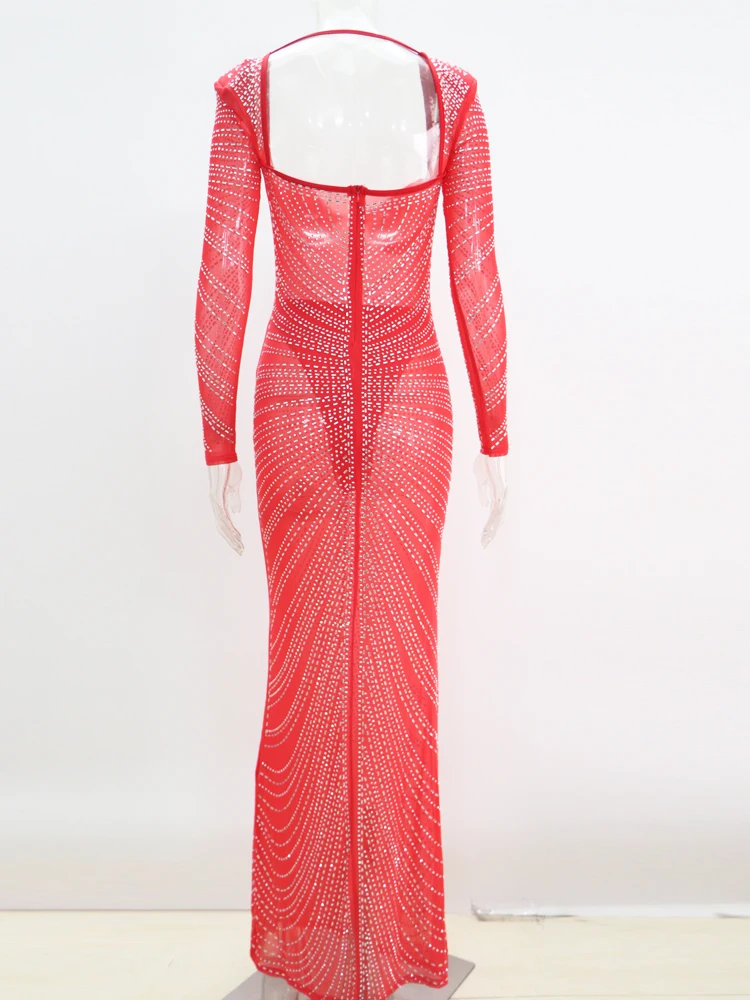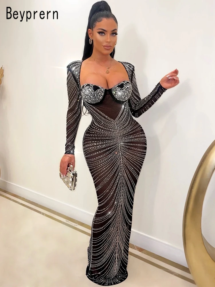 Beyprern Gorgeous Open Back Sequin Maxi Dress Luxury Woman Crystal Party Dress Night Out Robes Christmas Outfits Sexy Clubwear